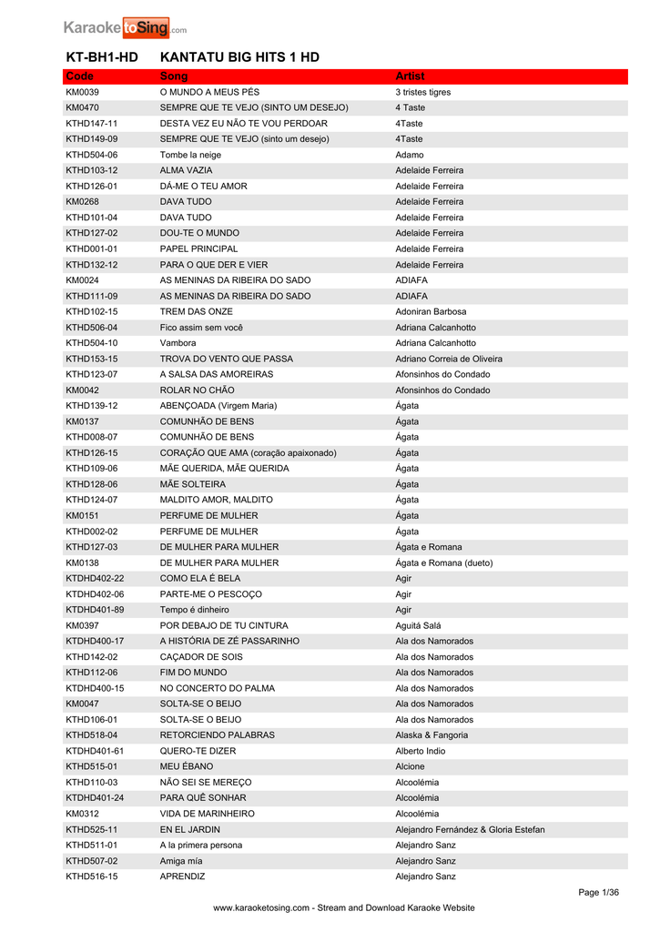 KT-BH1-HD KANTATU BIG HITS 1 HD Code Song Artist KM0039 O MUNDO A MEUS PÉS 3 tristes tigres KM0470 SEMPRE QUE TE VEJO (SINTO UM DESEJO) 4 Taste KTHD147-11 DESTA VEZ EU NÃO TE VOU PERDOAR 4Taste KTHD149-09 SEMPRE QUE TE VEJO (sinto um desejo) 4Taste KTHD504-06 Tombe la neige Adamo KTHD103-12 ALMA VAZIA Adelaide Ferreira KTHD126-01 DÁ-ME O TEU AMOR Adelaide Ferreira KM0268 DAVA TUDO Adelaide Ferreira KTHD101-04 DAVA TUDO Adelaide Ferreira KTHD127-02 DOU-TE O MUNDO Adelaide Ferreira KTHD001-01 PAPEL PRINCIPAL Adelaide Ferreira KTHD132-12 PARA O QUE DER E VIER Adelaide Ferreira KM0024 AS MENINAS DA RIBEIRA DO SADO ADIAFA KTHD111-09 AS MENINAS DA RIBEIRA DO SADO ADIAFA KTHD102-15 TREM DAS ONZE Adoniran Barbosa KTHD506-04 Fico assim sem você Adriana Calcanhotto KTHD504-10 Vambora Adriana Calcanhotto KTHD153-15 TROVA DO VENTO QUE PASSA Adriano Correia de Oliveira KTHD123-07 A SALSA DAS AMOREIRAS Afonsinhos do Condado KM0042 ROLAR NO CHÃO Afonsinhos do Condado KTHD139-12 ABENÇOADA (Virgem Maria) Ágata KM0137 COMUNHÃO DE BENS Ágata KTHD008-07 COMUNHÃO DE BENS Ágata KTHD126-15 CORAÇÃO QUE AMA (coração apaixonado) Ágata KTHD109-06 MÃE QUERIDA, MÃE QUERIDA Ágata KTHD128-06 MÃE SOLTEIRA Ágata KTHD124-07 MALDITO AMOR, MALDITO Ágata KM0151 PERFUME DE MULHER Ágata KTHD002-02 PERFUME DE MULHER Ágata KTHD127-03 DE MULHER PARA MULHER Ágata e Romana KM0138 DE MULHER PARA MULHER Ágata e Romana (dueto) KTDHD402-22 COMO ELA É BELA Agir KTDHD402-06 PARTE-ME O PESCOÇO Agir KTDHD401-89 Tempo é dinheiro Agir KM0397 POR DEBAJO DE TU CINTURA Aguitá Salá KTDHD400-17 A HISTÓRIA DE ZÉ PASSARINHO Ala dos Namorados KTHD142-02 CAÇADOR DE SOIS Ala dos Namorados KTHD112-06 FIM DO MUNDO Ala dos Namorados KTDHD400-15 NO CONCERTO DO PALMA Ala dos Namorados KM0047 SOLTA-SE O BEIJO Ala dos Namorados KTHD106-01 SOLTA-SE O BEIJO Ala dos Namorados KTHD518-04 RETORCIENDO PALABRAS Alaska & Fangoria KTDHD401-61 QUERO-TE DIZER Alberto Indio KTHD515-01 MEU ÉBANO Alcione KTHD110-03 NÃO SEI SE MEREÇO Alcoolémia KTDHD401-24 PARA QUÊ SONHAR Alcoolémia KM0312 VIDA DE MARINHEIRO Alcoolémia KTHD525-11 EN EL JARDIN Alejandro Fernández & Gloria Estefan KTHD511-01 A la primera persona Alejandro Sanz KTHD507-02 Amiga mía Alejandro Sanz KTHD516-15 APRENDIZ Alejandro Sanz Page 1/36 www.karaoketosing.com - Stream and Download Karaoke Website Code Song Artist KTHD501-07 Corazón partío Alejandro Sanz KTHD506-01 Cuando nadie me ve Alejandro Sanz KTHD517-01 HE SIDO TAN FELIZ CONTIGO Alejandro Sanz KTHD527-09 HOY LLUEVE, HOY DUELE Alejandro Sanz KTHD524-03 NO ES LO MISMO Alejandro Sanz KTHD523-07 TU NO TIENES ALMA Alejandro Sanz KTHD508-02 Y si fuera ella Alejandro Sanz KTHD522-02 TE LO AGRADEZCO PERO NO Alejandro Sanz & Shakira KM0011 DEIXA-ME OLHAR Além Mar KTHD106-03 DEIXA-ME OLHAR Além Mar KTHD120-11 JÁ NÃO HÁ MAIS BALADAS Além Mar KTHD118-12 MISTER GAY Alex KTHD521-02 A GRITOS DE ESPERANZA Alex Ubago KTHD518-10 DAME TU AIRE Alex Ubago KTHD525-05 DIME SI NO ES AMOR Alex Ubago KTHD514-11 SIN MIEDO A NADA Alex Ubago KTHD522-04 VIAJAR CONTIGO Alex Ubago KTHD115-15 ZÉ BRASILEIRO Alexandra KM0067 É POR AMOR Alexandre Pires KTHD509-06 Es por amor Alexandre Pires KM0069 NECESSIDADE Alexandre Pires KM0062 VOCÊ ROUBOU A MINHA VIDA Alexandre Pires KTHD506-14 Você roubou a minha vida Alexandre Pires KTHD146-14 A CASA DA MARIQUINHAS Alfredo Marceneiro KTHD134-06 HÁ FESTA NA MOURARIA Alfredo Marceneiro (arr. KANTATU) KM0211 AI MOURARIA Amália KM0208 CASA PORTUGUESA Amália KM0209 LENDA DA FONTE Amália KM0212 POVO QUE LAVAS NO RIO Amália KTHD153-01 GAIVOTA Amália Hoje KTDHD400-51 ALFAMA Amália Rodrigues KTHD104-13 BARCO NEGRO Amália Rodrigues KTDHD401-28 FADO PORTUGUÊS Amália Rodrigues KTDHD400-10 LISBOA DOS MILAGRES Amália Rodrigues KTHD119-10 OIÇA LÁ SR. VINHO Amália Rodrigues KTHD151-08 TIMPANAS Amália Rodrigues KTHD145-06 FADO MALHOA Amália Rodrigues (arr. KANTATU) KTHD147-06 Ó CARECA Amália Rodrigues (arr. KANTATU) KTHD510-13 Me haces tanto bien Amistades Peligrosas KTDHD400-23 A MÁQUINA Amor Electro KTDHD401-67 MAR SALGADO Amor Electro KTDHD401-09 ONDE TU ME QUISERES Amor Electro KTDHD400-54 ROSA SANGUE Amor Electro KTDHD401-50 SÓ É FOGO SE QUEIMAR Amor Electro KTHD520-02 BACK TO BLACK Amy Winehouse KTHD517-06 REHAB Amy Winehouse KTOHD300-13 A MELODIA DA VIDA Ana (Revelações) KTOHD300-11 CANTO POR ACREDITAR Ana (Revelações) KTOHD300-18 CARTAS DE AMOR SÃO SEGREDOS Ana (Revelações) KTOHD300-17 ESTRANHO DEMAIS Ana (Revelações) KTOHD300-16 EU SÓ QUERO DANÇAR Ana (Revelações) KTOHD300-19 FRUTO DA PAIXÃO Ana (Revelações) KTOHD300-10 JURO POR ESTE AMOR Ana (Revelações) Page 2/36 www.karaoketosing.com - Stream and Download Karaoke Website Code Song Artist KTOHD300-15 NÃO ME DIGAS NADA Ana (Revelações) KTOHD300-12 O TEU BEIJO SALGADO Ana (Revelações) KTOHD300-14 UM SEGREDO QUE EU NÃO VI Ana (Revelações) KTHD524-02 ME GUSTARÍA Ana Belén KTHD520-01 NEGRA HISTORIA Ana Belén KTHD514-01 É ISSO AÍ Ana Carolina & Seu Jorge KTDHD400-75 ELECTRICAL STORM Ana Free KTHD140-05 TEU CORPO ARDENTE Ana Malhoa KTDHD401-15 ATÉ AO VERÃO Ana Moura KTDHD401-30 DESFADO Ana Moura KTDHD402-28 DIA DE FOLGA Ana Moura KTDHD400-82 LEVA ME AOS FADOS Ana Moura KTHD151-03 OS BÚZIOS Ana Moura KTHD001-02 CIDADE ATÉ SER DIA Anabela KTHD149-13 ALONE WITH YOU André Indiana KTDHD401-21 LIKE A LEGEND André Indiana & Mónica Ferraz KTHD148-08 ADIVINHA QUANTO GOSTO DE TI André Sardet KTHD111-11 AZUL DO CÉU André Sardet KTHD142-12 BALADA DA ESTRADA DO SOL André Sardet KTDHD400-87 CANÇÃO DO ASSOBIO André Sardet KM0279 FOI FEITIÇO André Sardet KTHD113-12 FOI FEITIÇO André Sardet KTHD146-02 PURA IMPERFEIÇÃO André Sardet KTHD140-08 QUANDO EU TE FALEI EM AMOR André Sardet KTHD135-07 UM AMIGO UM LAMENTO André Sardet KTHD150-10 SE EU DISSER André Sardet & Luis Represas KTHD131-04 HOJE VOU FICAR André Sardet & Mafalda Veiga KTHD511-08 Ave Maria Andrea Bocelli KTHD516-10 CON TE PARTIRÒ And