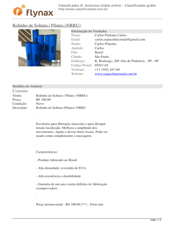 Classificados D: Anúncios Grátis online – Classificados grátis http://www.classificadosd.com.br/ Rolinho de Soltura / Pilates (NRRU) Informação do Vendedor Nome: Carlos Pimenta Carlos Email: [email protected] Nome: Carlos Pimenta Apelido: Carlos País: Brasil Cidade: São Paulo Endereço: R. Realengo, 209 Alto de Pinheiros - SP - SP Código Postal: 05451-03 Telefone: +11 (302) 167-69 Website: www.espacofuncional.com.br Detalhes do Anúncio Comum Titulo: Preço: Condição: Descrição: Rolinho de Soltura / Pilates (NRRU) R$ 100.00 Novo Rolinho de Soltura (Pilates) NRRU . Excelente para liberação muscular e para dissipar tensão localizada. Melhora a amplitude dos movimentos. Ajuda a aliviar dores locais. Pode ser usado como complemento a massagem. . Características: - Produto fabricado no Brasil - Alta densidade, revestido de EVA - Alta resistência e durabilidade - Garantia de um ano contra defeitos de fabricação (comprovados) . Preço promocional - R$ 100,00 (**) - Frete não page 1 / 2 Classificados D: Anúncios Grátis online – Classificados grátis http://www.classificadosd.com.br/ incluso. . ** Preço por tempo limitado. Entregamos em todo o Brasil. Conheça também o Clubbell (Clava Indiana) e Kettlebell NR.RU (Oficial da Federação Brasileira de Kettlebell Lifting). **Tabela de abr/2016 - consulte tabela de preços atualizada em nosso web-site: www.espacofuncional.com.br Fone:(11) 3021-6769 ,, Localização País: Estado: Cidade: Endereço: CEP: Brasil São Paulo São Paulo R. Realengo, 209 05451030 page 2 / 2 Powered by TCPDF (www.tcpdf.org)