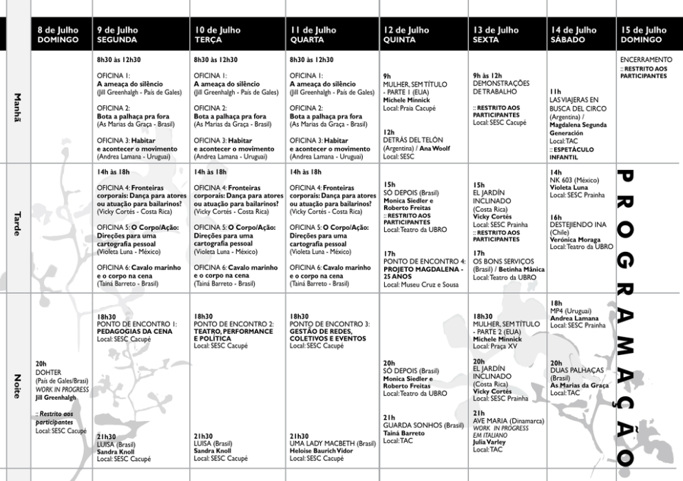 9 de Julho 10 de Julho 11 de Julho 12 de Julho 13 de Julho 14 de Julho 15 de Julho DOMINGO SEGUNDA TERÇA QUARTA QUINTA SEXTA SÁBADO DOMINGO 8h30 às 12h30 8h30 às 12h30 8h30 às 12h30 OFICINA 1: A ameaça do silêncio (Jill Greenhalgh - País de Gales) OFICINA 1: A ameaça do silêncio (Jill Greenhalgh - País de Gales) OFICINA 1: A ameaça do silêncio (Jill Greenhalgh - País de Gales) OFICINA 2: Bota a palhaça pra fora (As Marias da Graça - Brasil) OFICINA 2: Bota a palhaça pra fora (As Marias da Graça - Brasil) OFICINA 2: Bota a palhaça pra fora (As Marias da Graça - Brasil) Manhã 8 de Julho ENCERRAMENTO :: RESTRITO AOS 9h MULHER, SEM TÍTULO - PARTE 1 (EUA) 9h às 12h DEMONSTRAÇÕES DE TRABALHO Michele Minnick OFICINA 3: Habitar e acontecer o movimento (Andrea Lamana - Uruguai) OFICINA 3: Habitar e acontecer o movimento (Andrea Lamana - Uruguai) 14h às 18h 14h às 18h 14h às 18h OFICINA 4: Fronteiras corporais: Dança para atores ou atuação para bailarinos? (Vicky Cortés - Costa Rica) OFICINA 4: Fronteiras corporais: Dança para atores ou atuação para bailarinos? (Vicky Cortés - Costa Rica) OFICINA 4: Fronteiras corporais: Dança para atores ou atuação para bailarinos? (Vicky Cortés - Costa Rica) OFICINA 5: O Corpo/Ação: Direções para uma cartografia pessoal (Violeta Luna - México) OFICINA 5: O Corpo/Ação: Direções para uma cartografia pessoal (Violeta Luna - México) OFICINA 5: O Corpo/Ação: Direções para uma cartografia pessoal (Violeta Luna - México) OFICINA 6: Cavalo marinho e o corpo na cena (Tainá Barreto - Brasil) OFICINA 6: Cavalo marinho e o corpo na cena (Tainá Barreto - Brasil) OFICINA 6: Cavalo marinho e o corpo na cena (Tainá Barreto - Brasil) 18h30 PONTO DE ENCONTRO 1: 18h30 PONTO DE ENCONTRO 2: 18h30 PONTO DE ENCONTRO 3: PEDAGOGIAS DA CENA TEATRO, PERFORMANCE E POLÍTICA GESTÃO DE REDES, COLETIVOS E EVENTOS Local: SESC Cacupé Local: SESC Cacupé Local: SESC Cacupé 15h SÓ DEPOIS (Brasil) Monica Siedler e Roberto Freitas :: RESTRITO AOS PARTICIPANTES Local: Teatro da UBRO Local: TAC 15h EL JARDÍN INCLINADO (Costa Rica) Vicky Cortés 14h NK 603 (México) Violeta Luna Local: SESC Prainha Local: SESC Prainha :: RESTRITO AOS 16h DESTEJIENDO INA (Chile) PARTICIPANTES Verónica Moraga 18h30 MULHER, SEM TÍTULO - PARTE 2 (EUA) Local: Teatro da UBRO 18h MP4 (Uruguai) Andrea Lamana Local: SESC Prainha Michele Minnick Local: Praça XV Noite Local: Teatro da UBRO 21h GUARDA SONHOS (Brasil) 21h30 LUISA (Brasil) Tainá Barreto 21h30 UMA LADY MACBETH (Brasil) Local: TAC Sandra Knoll Sandra Knoll Heloise Baurich Vidor Local: SESC Cacupé Local: SESC Cacupé Local: SESC Cacupé 21h30 LUISA (Brasil) Magdalena Segunda Generación :: ESPETÁCULO INFANTIL 17h 17h PONTO DE ENCONTRO 4: OS BONS SERVIÇOS PROJETO MAGDALENA - (Brasil) / Betinha Mânica 25 ANOS Local: Teatro da UBRO Local: Museu Cruz e Sousa Monica Siedler e Roberto Freitas Jill Greenhalgh :: Restrito aos participantes Local: SESC Cacupé Local: SESC Cacupé 12h DETRÁS DEL TELÓN (Argentina) / Ana Woolf Local: SESC 20h SÓ DEPOIS (Brasil) 20h DOHTER (País de Gales/Brasi) WORK IN PROGRESS :: RESTRITO AOS PARTICIPANTES 20h EL JARDÍN INCLINADO (Costa Rica) 20h DUAS PALHAÇAS (Brasil) Vicky Cortés Local: TAC Local: SESC Prainha 21h AVE MARIA (Dinamarca) WORK IN PROGRESS EM ITALIANO Julia Varley Local: TAC P R O G R A M A Ç Ã O Tarde OFICINA 3: Habitar e acontecer o movimento (Andrea Lamana - Uruguai) Local: Praia Cacupé PARTICIPANTES 11h LAS VIAJERAS EN BUSCA DEL CIRCO (Argentina) / As Marias da Graça