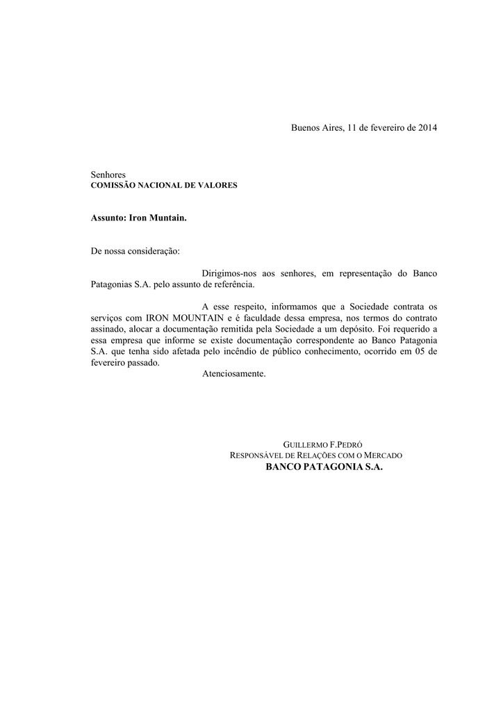 Buenos Aires, 11 de fevereiro de 2014 Senhores COMISSÃO NACIONAL DE VALORES Assunto: Iron Muntain. De nossa consideração: Dirigimos-nos aos senhores, em representação do Banco Patagonias S.A. pelo assunto de referência. A esse respeito, informamos que a Sociedade contrata os serviços com IRON MOUNTAIN e é faculdade dessa empresa, nos termos do contrato assinado, alocar a documentação remitida pela Sociedade a um depósito. Foi requerido a essa empresa que informe se existe documentação correspondente ao Banco Patagonia S.A. que tenha sido afetada pelo incêndio de público conhecimento, ocorrido em 05 de fevereiro passado. Atenciosamente. GUILLERMO F.PEDRÓ RESPONSÁVEL DE RELAÇÕES COM O MERCADO BANCO PATAGONIA S.A.