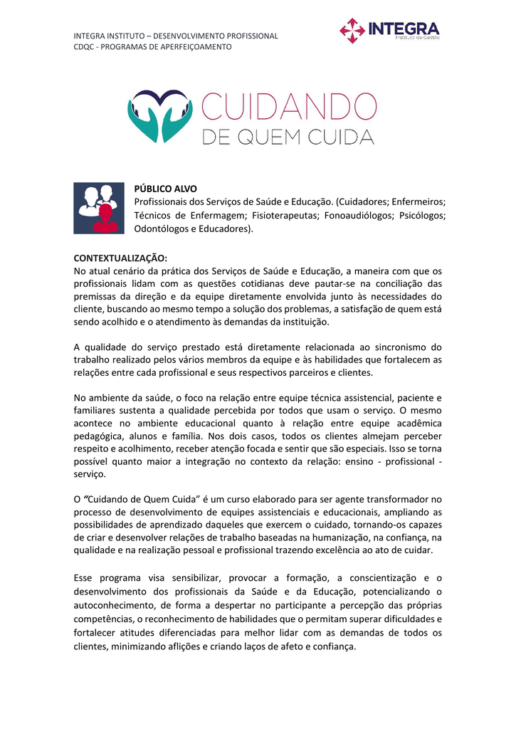 INTEGRA INSTITUTO – DESENVOLVIMENTO PROFISSIONAL CDQC - PROGRAMAS DE APERFEIÇOAMENTO PÚBLICO ALVO Profissionais dos Serviços de Saúde e Educação. (Cuidadores; Enfermeiros; Técnicos de Enfermagem; Fisioterapeutas; Fonoaudiólogos; Psicólogos; Odontólogos e Educadores). Todos os profissionais de relação direta com o cliente. CONTEXTUALIZAÇÃO: No atual cenário da prática dos Serviços de Saúde e Educação, a maneira com que os profissionais lidam com as questões cotidianas deve pautar-se na conciliação das premissas da direção e da equipe diretamente envolvida junto às necessidades do cliente, buscando ao mesmo tempo a solução dos problemas, a satisfação de quem está sendo acolhido e o atendimento às demandas da instituição. A qualidade do serviço prestado está diretamente relacionada ao sincronismo do trabalho realizado pelos vários membros da equipe e às habilidades que fortalecem as relações entre cada profissional e seus respectivos parceiros e clientes. No ambiente da saúde, o foco na relação entre equipe técnica assistencial, paciente e familiares sustenta a qualidade percebida por todos que usam o serviço. O mesmo acontece no ambiente educacional quanto à relação entre equipe acadêmica pedagógica, alunos e família. Nos dois casos, todos os clientes almejam perceber respeito e acolhimento, receber atenção focada e sentir que são especiais. Isso se torna possível quanto maior a integração no contexto da relação: ensino - profissional serviço. O “Cuidando de Quem Cuida” é um curso elaborado para ser agente transformador no processo de desenvolvimento de equipes assistenciais e educacionais, ampliando as possibilidades de aprendizado daqueles que exercem o cuidado, tornando-os capazes de criar e desenvolver relações de trabalho baseadas na humanização, na confiança, na qualidade e na realização pessoal e profissional trazendo excelência ao ato de cuidar. Esse programa visa sensibilizar, provocar a formação, a conscientização e o desenvolvimento dos profissionais da Saúde e da Educação, potencializando o autoconhecimento, de forma a despertar no participante a percepção das próprias competências, o reconhecimento de habilidades que o permitam superar dificuldades e fortalecer atitudes diferenciadas para melhor lidar com as demandas de todos os clientes, minimizando aflições e criando laços de afeto e confiança. INTEGRA INSTITUTO – DESENVOLVIMENTO PROFISSIONAL CDQC - PROGRAMAS DE APERFEIÇOAMENTO OBJETIVOS: 1. Sensibilizar os participantes acerca da importância do autoconhecimento e entendimento para o correto desempenho de suas atividades no cuidar do outro. 2. Provocar reflexão nos profissionais da saúde e educação acerca do impacto do desempenho de suas atividades em sua vida, possibilitando a ressignificação, objetivando torná-los estimulados a focar na percepção e entendimento efetivo da situação e dos sentimentos de quem está sendo cuidado, facilitando o desempenho de seu trabalho. 3. Despertar sensação verdadeira de acolhimento entre os profissionais da saúde e educação, potencializando a capacidade de transmiti-la a quem necessita do cuidado. 4. Repensar posturas e atitudes, ressignificar o cotidiano profissional, resgatar e fortalecer o equilíbrio, a leveza e a harmonia na prática do cuidado, potencializar e desenvolver habilidades, trocar experiências e explorar novos caminhos para a realização profissional 5. Promover a melhoria nas relações interpessoais por meio de ações diferenciadas com o cliente, com a equipe e com a empresa; 6. Estimular ações direcionadas e assertivas na assistência humanizada, tornando a prática profissional mais motivadora e realizadora. RESUMO DO CONTEÚDO PROGRAMÁTICO: 1. Contextualizar o universo do cuidado: Despertar no profissional a necessidade e os resultados do cuidar-se, potencializando as descobertas, fortalecendo a importância do profissional para o conforto de quem está sendo assistido. 2. Enfocar o autoconhecimento e suas implicações e interseções no desenvolvimento do trabalho 3. Estabelecer premissas fundamentais no “Cuidar do Outro”, o aprendizado da escuta na essência, da atenção focada, objetivando facilitar o entendimento da demanda do outro. 4. Ressignificar a relação com o outro no ambiente profissional; Integrando pessoas e comportamentos no cuidado do outro, facilitando a auto entrega; 5. Aperfeiçoar, objetivando a manutenção do auto aprendizado, visando assegurar a continuidade dos ganhos do projeto considerando o desenvolvimento contínuo dos profissionais 6. Apresentar e aplicar aos participantes o mapeamento de competências do Coaching Assessment como instrumento que promove autoconhecimento e desenvolvimento; 7. Coaching: técnicas simples e aplicáveis no cotidiano da prática profissional; 8. Exercitar a aplicação prática das técnicas de coaching por meio de simulação, permitindo refletir sobre as situações apresentadas e definir diferentes soluções; 9. Validar o uso do coaching nas situações apresentadas pelos participantes – comprovação de eficácia. INTEGRA INSTITUTO – DESENVOLVIMENTO PROFISSIONAL CDQC - PROGRAMAS DE APERFEIÇOAMENTO CARGA HORÁRIA E PERIODICIDADE: A carga horária total é de 24 h/aula, sendo um encontro mensal de 8h ou 2 encontros mensais de 4h. OBS: O participante, para ter o certificado de conclusão do curso, precisará concluir carga horária mínima de 20 h/aula. VAGAS: Máximo de 20 participantes por turma. OBS.: O Integra Instituto permite o processo de lista de interesse e pré-inscrição, o que viabiliza a realização dos cursos mediante confirmação de inscrição. Turmas com número de inscrições inferior a 10 participantes serão programadas para datas posteriores de acordo com a disponibilidade no cronograma. METODOLOGIA: Baseada na problematização que permite a condução do processo educativo centrado na realidade do profissi