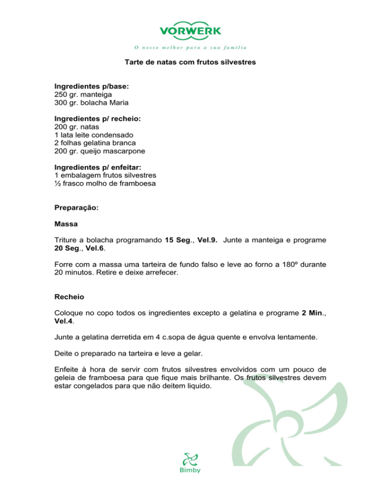 Tarte de natas com frutos silvestres Ingredientes p/base: 250 gr. manteiga 300 gr. bolacha Maria Ingredientes p/ recheio: 200 gr. natas 1 lata leite condensado 2 folhas gelatina branca 200 gr. queijo mascarpone Ingredientes p/ enfeitar: 1 embalagem frutos silvestres ½ frasco molho de framboesa Preparação: Massa Triture a bolacha programando 15 Seg., Vel.9. Junte a manteiga e programe 20 Seg., Vel.6. Forre com a massa uma tarteira de fundo falso e leve ao forno a 180º durante 20 minutos. Retire e deixe arrefecer. Recheio Coloque no copo todos os ingredientes excepto a gelatina e programe 2 Min., Vel.4. Junte a gelatina derretida em 4 c.sopa de água quente e envolva lentamente. Deite o preparado na tarteira e leve a gelar. Enfeite à hora de servir com frutos silvestres envolvidos com um pouco de geleia de framboesa para que fique mais brilhante. Os frutos silvestres devem estar congelados para que não deitem liquido.