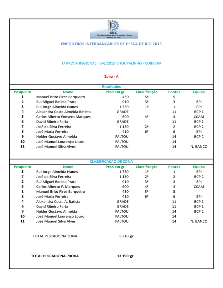 ENCONTROS INTERBANCÁRIOS DE PESCA DE RIO 2015 1ª PROVA REGIONAL - 6/6/2015 CHOUPALINHO - COIMBRA Zona - A Pesqueiro 1 2 3 4 5 6 7 8 9 10 11 Pesqueiro 3 7 2 5 1 8 4 6 9 10 11 Nome Manuel Brito Pires Barqueiro Rui Miguel Batista Prata Rui Jorge Almeida Nunes Alexandra Costa Almeida Batista Carlos Alberto Fonseca Marques David Ribeiro Faria José da Silva Ferreira José Maria Ferreira Helder Gustavo Almeida José Manuel Lourenço Louro José Manuel Silva Alves Nome Rui Jorge Almeida Nunes José da Silva Ferreira Rui Miguel Batista Prata Carlos Alberto F. Marques Manuel Brito Pires Barqueiro José Maria Ferreira Alexandra Costa A. Batista David Ribeiro Faria Helder Gustavo Almeida José Manuel Lourenço Louro José Manuel Silva Alves Resultados Peso em gr 430 910 1 730 GRADE 600 GRADE 1 130 410 FALTOU FALTOU FALTOU Classificação 5º 3º 1º 4º 2º 6º CLASSIFICAÇÃO DE ZONA Peso em gr Classificação 1 730 1º 1 130 2º 910 3º 600 4º 430 5º 410 6º GRADE GRADE FALTOU FALTOU FALTOU TOTAL PESCADO NA ZONA 5 210 gr TOTAL PESCADO NA PROVA 13 190 gr Pontos 5 3 1 11 4 11 2 6 14 14 14 Pontos 1 2 3 4 5 6 11 11 14 14 14 Equipa BPI BPI BCP 1 CCAM BCP 1 BCP 2 BPI BCP 2 N. BANCO Equipa BPI BCP 2 BPI CCAM BPI BCP 1 BCP 1 BCP 2 N. BANCO