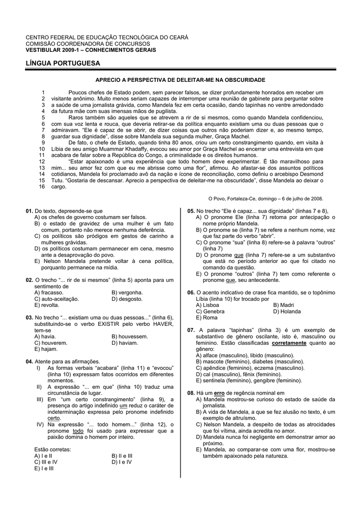 CENTRO FEDERAL DE EDUCAÇÃO TECNOLÓGICA DO CEARÁ COMISSÃO COORDENADORA DE CONCURSOS VESTIBULAR 2009-1 – CONHECIMENTOS GERAIS LÍNGUA PORTUGUESA APRECIO A PERSPECTIVA DE DELEITAR-ME NA OBSCURIDADE 1 2 3 4 5 6 7 8 9 10 11 12 13 14 15 16 Poucos chefes de Estado podem, sem parecer falsos, se dizer profundamente honrados em receber um visitante anônimo. Muito menos seriam capazes de interromper uma reunião de gabinete para perguntar sobre a saúde de uma jornalista grávida, como Mandela fez em certa ocasião, dando tapinhas no ventre arredondado da futura mãe com suas imensas mãos de pugilista. Raros também são aqueles que se atrevem a rir de si mesmos, como quando Mandela confidenciou, com sua voz lenta e rouca, que deveria retirar-se da política enquanto existiam uma ou duas pessoas que o admiravam. “Ele é capaz de se abrir, de dizer coisas que outros não poderiam dizer e, ao mesmo tempo, guardar sua dignidade”, disse sobre Mandela sua segunda mulher, Graça Machel. De fato, o chefe de Estado, quando tinha 80 anos, criou um certo constrangimento quando, em visita à Líbia de seu amigo Muammar Khadaffy, evocou seu amor por Graça Machel ao encerrar uma entrevista em que acabara de falar sobre a República do Congo, a criminalidade e os direitos humanos. “Estar apaixonado é uma experiência que todo homem deve experimentar. É tão maravilhoso para mim... seu amor fez com que eu me abrisse como uma flor”, afirmou. Ao afastar-se dos assuntos políticos cotidianos, Mandela foi proclamado avô da nação e ícone de reconciliação, como definiu o arcebispo Desmond Tutu. “Gostaria de descansar. Aprecio a perspectiva de deleitar-me na obscuridade”, disse Mandela ao deixar o cargo. O Povo, Fortaleza-Ce, domingo – 6 de julho de 2008. 01. Do texto, depreende-se que A) os chefes de governo costumam ser falsos. B) o estado de gravidez de uma mulher é um fato comum, portanto não merece nenhuma deferência. C) os políticos são pródigos em gestos de carinho a mulheres grávidas. D) os políticos costumam permanecer em cena, mesmo ante a desaprovação do povo. E) Nelson Mandela pretende voltar à cena política, porquanto permanece na mídia. 02. O trecho “... rir de si mesmos” (linha 5) aponta para um sentimento de A) fracasso. B) vergonha. C) auto-aceitação. D) desgosto. E) revolta. 03. No trecho “... existiam uma ou duas pessoas...” (linha 6), substituindo-se o verbo EXISTIR pelo verbo HAVER, tem-se A) havia. B) houvessem. C) houverem. D) haviam. E) hajam. 04. Atente para as afirmações. I) As formas verbais “acabara” (linha 11) e “evocou” (linha 10) expressam fatos ocorridos em diferentes momentos. II) A expressão “... em que” (linha 10) traduz uma circunstância de lugar. III) Em “um certo constrangimento” (linha 9), a presença do artigo indefinido um reduz o caráter de indeterminação expressa pelo pronome indefinido certo. IV) Na expressão “... todo homem...” (linha 12), o pronome todo foi usado para expressar que a paixão domina o homem por inteiro. Estão corretas: A) I e II C) III e IV E) I e III B) II e III D) I e IV 05. No trecho “Ele é capaz... sua dignidade” (linhas 7 e 8), A) O pronome Ele (linha 7) retoma por antecipação o nome próprio Mandela. B) O pronome se (linha 7) se refere a nenhum nome, vez que faz parte do verbo “abrir”. C) O pronome “sua” (linha 8) refere-se à palavra “outros” (linha 7) D) O pronome que (linha 7) refere-se a um substantivo que está no período anterior ao que foi citado no comando da questão. E) O pronome “outros” (linha 7) tem como referente o pronome que, seu antecedente. 06. O acento indicativo de crase fica mantido, se o topônimo Líbia (linha 10) for trocado por A) Lisboa B) Madri C) Genebra D) Holanda E) Roma 07. A palavra “tapinhas” (linha 3) é um exemplo de substantivo de gênero oscilante, isto é, masculino ou feminino. Estão classificadas corretamente quanto ao gênero: A) alface (masculino), libido (masculino). B) mascote (feminino), diabetes (masculino). C) apêndice (feminino), eczema (masculino). D) cal (masculino), fênix (feminino). E) sentinela (feminino), gengibre (feminino). 08. Há um erro de regência nominal em A) Mandela mostrou-se curioso do estado de saúde da jornalista. B) A vida de Mandela, a que se fez alusão no texto, é um exemplo de altruísmo. C) Nelson Mandela, a despeito de todas as atrocidades que foi vítima, ainda acredita no amor. D) Mandela nunca foi negligente em demonstrar amor ao próximo. E) Mandela, ao comparar-se com uma flor, mostrou-se também apaixonado pela natureza. 09. A palavra “arredondado” (linha 3) foi formada por parassíntese. Pelo mesmo processo formaram-se A) descobrir e engessar B) descampado e enriquecer C) acarpetar e infelizmente D) aterrador e ameaçar E) intranqüilidade e entardecer 10. A palavra “Poucos” (linha 1) expressa, no texto, uma quantidade indeterminada, razão por que se classifica como pronome indefinido. Não aparece esse tipo de pronome em A) Ninguém pode negar que Mandela é um exemplo de estadista. B) Certos líderes permanecem na lembrança do povo por muito tempo. C) Mandela demonstrou sensibilidade, o que falta a muitos chefes de Estado. D) Vários estadistas permanecem na História pelo mal que praticaram. E) Existem pessoas cujos exemplos devem ser seguidos. 11. A oração “Ao afastar-se dos assuntos políticos cotidianos” (linhas 13 e 14) A) exerce função substantiva B) equivale a um adjetivo C) é a principal de outras subordinadas D) exerce a função sintática de adjunto adverbial E) é sintaticamente independente 12. O trecho “É tão maravilhoso para mim ... como uma flor.” (linhas 12 e 13) lembra uma das características do Romantismo: o amor como redenção. É também característica da prosa romântica A) linguagem culta e direta. B) idealização do herói. C) mulher não-idealizada e mostrada com defeitos e qualidades. D) busca de uma l