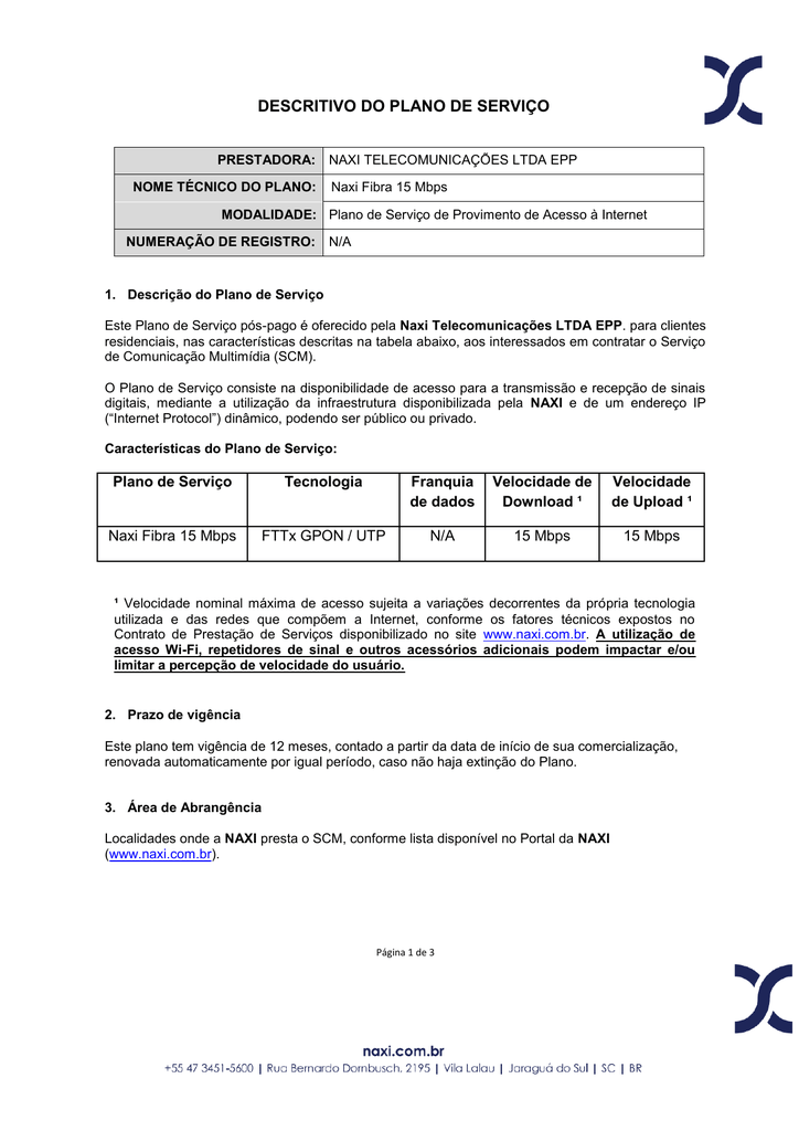 DESCRITIVO DO PLANO DE SERVIÇO PRESTADORA: NAXI TELECOMUNICAÇÕES LTDA EPP NOME TÉCNICO DO PLANO: Naxi Fibra 15 Mbps MODALIDADE: Plano de Serviço de Provimento de Acesso à Internet NUMERAÇÃO DE REGISTRO: N/A 1. Descrição do Plano de Serviço Este Plano de Serviço pós-pago é oferecido pela Naxi Telecomunicações LTDA EPP. para clientes residenciais, nas características descritas na tabela abaixo, aos interessados em contratar o Serviço de Comunicação Multimídia (SCM). O Plano de Serviço consiste na disponibilidade de acesso para a transmissão e recepção de sinais digitais, mediante a utilização da infraestrutura disponibilizada pela NAXI e de um endereço IP (“Internet Protocol”) dinâmico, podendo ser público ou privado. Características do Plano de Serviço: Plano de Serviço Tecnologia Franquia de dados Velocidade de Download ¹ Velocidade de Upload ¹ Naxi Fibra 15 Mbps FTTx GPON / UTP N/A 15 Mbps 15 Mbps ¹ Velocidade nominal máxima de acesso sujeita a variações decorrentes da própria tecnologia utilizada e das redes que compõem a Internet, conforme os fatores técnicos expostos no Contrato de Prestação de Serviços disponibilizado no site www.naxi.com.br. A utilização de acesso Wi-Fi, repetidores de sinal e outros acessórios adicionais podem impactar e/ou limitar a percepção de velocidade do usuário. 2. Prazo de vigência Este plano tem vigência de 12 meses, contado a partir da data de início de sua comercialização, renovada automaticamente por igual período, caso não haja extinção do Plano. 3. Área de Abrangência Localidades onde a NAXI presta o SCM, conforme lista disponível no Portal da NAXI (www.naxi.com.br). Página 1 de 3 4. Aplicação Este Plano de Serviço encontra-se disponível para contratação exclusivamente por Pessoas Físicas e para uso residencial, que não exerçam atividades comerciais para fins de contratação de NAXI FIBRA, em local com disponibilidade e sujeita a viabilidade técnica no ato da instalação. 5. Valores da Estrutura Tarifária 5.1. Mensalidade Corresponde ao preço integral mensal a ser cobrado do Assinante, pela contratação da franquia de tráfego de dados destacada abaixo: Mensalidade Ocorrência Naxi Fibra 15 Mbps Mensal Preço Integral* (R$) R$155,87 *Preço Integral máximo de público, líquidos de tributos. 5.2 Taxas Taxas Ocorrência Preço Integral (R$)* Taxa de Instalação Eventual 900,00 Taxa de Mudança de Endereço Eventual 900,00 Taxa de Alteração do Ponto de Instalação Eventual 900,00 6. Informações Adicionais 6.1. Modem/Router Os equipamentos de propriedade da prestadora cedidos ao Assinante, serão em regime de comodato, locação ou por qualquer outro meio a critério da NAXI, para a fruição do serviço contratado. 6.2. Migração de Plano de Serviço O cliente poderá solicitar a migração para outro Plano de Serviço a qualquer momento, podendo ser aplicável a cobrança de multa prevista em eventual Contrato de Permanência, nos termos da regulamentação em vigor. 6.3. Desistência do Plano de Serviço O Assinante poderá solicitar a desistência do serviço a qualquer momento através dos nossos canais de atendimento, podendo ser aplicável a cobrança de multa prevista em Contrato de Permanência, nos termos da regulamentação em vigor. Página 2 de 3 6.4. Extinção do Plano de Serviço Em caso extinção deste Plano de Serviço, a NAXI comunicará sua intenção ao Assinante e à Anatel, caso necessário, respeitado o prazo mínimo e regras previstas na regulamentação em vigor. 6.5. Reajuste Os reajustes dos preços integrais desse plano de serviço poderão ser realizados anualmente, em prazo não inferior a 12 (doze) meses a partir da data de início de comercialização ou da realização do último reajuste, independente da data de contratação pelo cliente, limitados à variação do IGPM/FGV, INPC ou IPCA, sendo aquele que melhor recompor as perdas inflacionárias. 6.6. Tributos e Encargos Os valores constantes neste Plano são máximos e sobre eles serão cobrados encargos e tributos, em conformidade com a legislação em vigor de acordo com a localidade. 6.7. Atraso no pagamento: Em casos de não pagamento no vencimento da Nota Fiscal da Fatura de Serviços de Telecomunicações (NFFST), serão utilizados os mesmos critérios e procedimentos estabelecidos na Resolução vigente. 6.8. Mudança da data de vencimento da fatura: O cliente poderá solicitar mudança da data de vencimento da sua conta, nos termos da regulamentação editada pela ANATEL. 6.9. Direitos, obrigações, sanções e penalidades Este Plano, além das condições especificadas neste Descritivo, também está sujeito àquelas previstas na Regulamentação vigente e no Termo de Autorização do SCM da NAXI. 6.10. Outros descontos e promoções Campanhas promocionais e de descontos poderão ser oferecidas em adição a este Plano Alternativo, conforme art. 49 do Regulamento Geral de Direitos do Consumidor de Serviços de Telecomunicações – RGC, aprovado pela Resolução n° 632/2014. 6.11. Endereço eletrônico da Página da Prestadora: Os Planos de Serviço podem ser encontrados na Internet, no seguinte endereço: www.naxi.com.br. Página 3 de 3