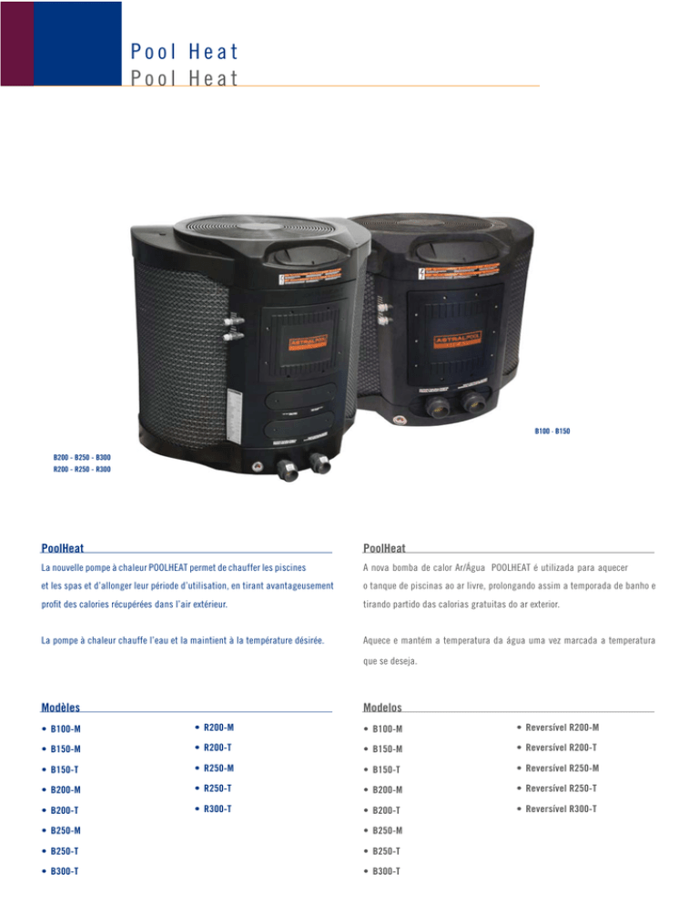 Pool Heat Pool Heat B100 · B150 B200 - B250 - B300 R200 - R250 - R300 PoolHeat PoolHeat La nouvelle pompe à chaleur POOLHEAT permet de chauffer les piscines A nova bomba de calor Ar/Água POOLHEAT é utilizada para aquecer et les spas et d’allonger leur période d’utilisation, en tirant avantageusement o tanque de piscinas ao ar livre, prolongando assim a temporada de banho e profit des calories récupérées dans l’air extérieur. tirando partido das calorias gratuitas do ar exterior. La pompe à chaleur chauffe l’eau et la maintient à la température désirée. Aquece e mantém a temperatura da água uma vez marcada a temperatura que se deseja. Modèles Modelos • B100-M • R200-M • B100-M • Reversível R200-M • B150-M • R200-T • B150-M • Reversível R200-T • B150-T • R250-M • B150-T • Reversível R250-M • B200-M • R250-T • B200-M • Reversível R250-T • B200-T • R300-T • B200-T • Reversível R300-T • B250-M • B250-M • B250-T • B250-T • B300-T • B300-T • Condensadores de titânio com cobertura em PVC e serpentina em TITÂNIO G2, • Condensateurs en titane, avec corps en PVC et serpentin en TITANE G2 selon • Minipressostatos de Alta e Baixa Pressão (AP/BP) de rearme automático. • Pressostat de haute et basse pression (HP/BP) avec réarmement pressão. fissures, une caractéristique essentielle pour le transport de liquides chauds partir de n’importe quel endroit, grâce à un tableau de commande déporté. • Contrôle à distance: Contrôle total des fonctions de la pompe à chaleur à nécessaire. Uniquement avec l’option de réversibilité. nement à des températures proches de 5ºC en décongelant l’évaporateur si • Dégivrage au gaz: Ce système permet à la pompe d’optimiser son fonction- EN OPTION: l’utilisateur. Economie d’énergie. qualquer lugar através dos painéis de comando. • Controlo remoto: Controlo total das operações da bomba de calor a partir de com a opção de reversibilidade.. abaixo dos 5º C, descongelando o evaporador, se necessário. Funciona apenas • Descongelamento por gás: permite que a unidade funcione a temperaturas OPTIONAL: de energia. um diferencial de temperatura inferior à temperatura marcada. Poupança • Nouveau système ECO: Lors de périodes d’inactivité de l’installation, le système maintient la piscine à une température proche de celle fixée par • Novo sistema ECO: Em períodos de paragem da instalação, mantém-na a evaporador. • Descongelamento: Quando se activa o ventilador, a unidade descongela o fases. • Monitor de fases: Protege o compressor em caso de perda ou inversão de • Dégivrage: Lorsque le ventilateur s’enclenche, la pompe dégivre l’évaporateur. de phases. • Moniteur de phase: Protège le compresseur en cas de perte ou d’inversion à la température désirée, en contrôlant le système de filtration. . • Intelligent Heat: Système qui maintient automatiquement la piscine ou le spa à temperatura desejada, com controlo do sistema de filtragem. • Intelligent Heat: Sistema que mantém a piscina e/ou o Spa automaticamente et contrôle de la pompe de filtration. Verrouillage du clavier. Ecran avec protection. da bomba de filtração. Bloqueio de teclado. Cobertura protectora de ecrã. • Coffret électrique complet avec réglage numérique de haute précision • Quadro eléctrico completo com regulação digital de alta sensibilidade e controlo uma característica fundamental para o transporte de líquidos quentes sob sous pression. em tubo PVC, boa elasticidade e notável resistência às fissuras sob tensão, PVC, disposant d’une bonne élasticité et d’une résistance remarquable aux • Circuito hidráulico com interruptor de fluxo na entrada de água, fabricado • Filtre déshydratant. • Circuit hydraulique avec interrupteur de débit d’entrée d’eau, tuyauterie en • Filtro desidratador. • Expansion via valve thermostatique avec régulateur externe. • Expansão através de válvula termostática com equalização externa. • Um circuito frigorífico de cobre nitrogenado, desidratado e desoxidado. • Circuit frigorifique au cuivre azoté, déshydraté et désoxydé. automatique. • Carga completa de gás refrigerante R-407-C. • Charge complète de gaz réfrigérants R-407-C. segundo a norma ASTM 338.99. Garantia contra corrosão. • Compressor SCROLL com protecção interna. la norme ASTM B 338.99. Résistant à la corrosion. • Ventilador axial com motor de acoplamento directo. corrosivos e regiões próximas do mar. milieux corrosifs. • Compresseur SCROLL avec protection thermique. tubo de cobre e alhetas de alumínio lacadas, especiais para ambientes avec tubes de cuivre et ailettes en aluminium, spécialement conçue pour les • Ventilateur axial équipé d’un moteur à accouplement direct. • Bateria evaporadora de grande superfície e alto rendimento, fabricada em • Batterie d’évaporateur (échangeur de chaleur gaz-air) à haut rendement, solar. Não perde a cor. • Um desenho robusto e ligeiro em ABS+UV injectado, resistente à radiação • Conception robuste et légère avec carcasse en ABS, résistante aux ultra- violets. La couleur ne se détériore pas. Descrição do equipamento Description Pool Heat Pool Heat COP Puissance restituée kW - Potência restituída kW Puissance absorbée kW - Potência absorvida kW COP 2,5 5,5 2,2 3,7 8,5 2,3 Puissance restituée kW - Potência restituída kW 4,63 COP 11,1 2,4 Puissance absorbée kW - Potência absorvida kW Puissance restituée kW - Potência restituída kW Puissance absorbée kW - Potência absorvida kW Poids - Peso 1,4 Kg R407C 220/2/50Hz - 3,04 7,6 2,5 4,46 11,6 2,6 5,59 15,1 2,7 103 Kg 59 dB 67 dB 3500 m3/h 1,4 Kg R407C 220/2/50Hz - - 41875 B150-M 3,04 7,6 2,5 4,46 11,6 2,6 5,59 15,1 2,7 1,4 Kg R407C 380/3/50Hz - - 41876 B150-T 380/3/50Hz 41886 R200-T 41878 B200-T 2,5 10,3 3,5 4,2 15,7 3,7 5,1 20 3,9 Ø 