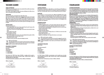 VACUUM-CLEANER STOFZUIGER STAUBSAUGER General information: Suitable for dry use only; damp particles of dirt or dust may block the filter and affect suction. Remember to empty the dust reservoir after every use. Ensure the filter is cleaned regularly by rinsing it in clean water and allowing it to dry. When not in use, store in a cool, dry place out of the reach of children. Algemene informatie: Alleen geschikt voor droog gebruik; vochtige deeltjes van vuil of stof kunnen de filter blokkeren en de zuigkracht beïnvloeden. Leeg het stofreservoir na elk gebruik. Spoel de filter regelmatig af met schoon water en laat goed drogen. Bewaar op een koele, droge plaats buiten bereik van kinderen. Allgemeine Informationen: Nur zur Trockenreinigung geeignet. Feuchte Schmutzpartikel oder feuchter Staub können den Filter blockieren und die Saugleistung herabsetzen. Denken Sie daran, den Staubbehälter nach jeder Verwendung zu leeren. Stellen Sie sicher, dass der Filter regelmäßig gereinigt wird; nur mit sauberem Wasser spülen. Lassen Sie ihn anschließend trocknen. Wenn der Staubsauger nicht verwendet wird, lagern Sie ihn an einem kühlen, trockenen Ort außerhalb der Reichweite von Kindern. Bedienungsanleitung: Packen Sie den Staubsauger aus, und stellen Sie sicher, dass das Netzkabel vollständig abgewickelt ist. Überzeugen Sie sich, dass die Zündung eingeschaltet ist, bevor Sie den Staubsauger an die Buchse des Zigarettenanzünders anschließen. Schalten Sie den Staubsauger mit Hilfe des Schiebeschalters EIN/AUS ein, der oben am Handgriff angeordnet ist. Wenn Sie den Staubbehälter leeren, halten Sie den Staubsauger nach unten (so dass der Staubbehälter zum Boden zeigt), und drücken Sie fest mit dem Daumen auf die Kunststoffklammer, mit der der Beutel am Handgriff befestigt ist. Der Staubbehälter löst sich dann vom Handgriff und kann problemlos geleert werden. Problemlösung: Der Staubsauger schaltet sich nicht ein: - Überprüfen Sie, ob die Buchse des Zigarettenanzünders verschmutzt ist oder Fremdstoffe enthält. Reinigen Sie die Buchse bei Bedarf mit einem nicht leitenden Gegenstand. Verwenden Sie hierzu keine Metallgegenstände. - Stecken Sie das Netzkabel fest in die Buchse des Zigarettenanzünders, und drehen Sie ihn vor und zurück, um einen besseren Kontakt zu erzielen. - Überprüfen Sie, ob das Kabel verdrillt oder geknickt ist. - Überzeugen Sie sich, dass die Zündung eingeschaltet ist. Der Staubsauger weist eine geringe Saugleistung auf: - Überprüfen Sie, ob der Filter im Staubsauger sauber und nicht durch Staubpartikel verstopft ist. Der Filter kann in regelmäßigen Abständen mit warmem Wasser gespült werden (lassen Sie ihn anschließend trocknen!). - Überzeugen Sie sich, dass der Staubbehälter nicht voll ist. - Wenn Sie den Fugenaufsatz verwenden, stellen Sie sicher, dass er sauber und nicht verstopft ist. Instructions: Unpack the vacuum cleaner, ensuring that the power cable is fully unwound. Ensure that the vehicle ignition is switched on prior to plugging the vacuum cleaner into the cigarette lighter socket. Turn on the vacuum cleaner by using the ON/OFF sliding switch located on top of the handgrip. When emptying the dust reservoir, hold the vacuum cleaner at a downward angle (with the dust reservoir pointing towards the floor) and press the plastic clip that joins the reservoir to the handgrip, firmly with the thumb. The dust reservoir will then separate from the handgrip and can easily be emptied. Problem solving: The vacuum cleaner does not run: - Check the cigarette lighter socket for dirt or foreign material. Clean the socket if necessary with a non-conductive object; do not use metallic objects to do this. - Push the power cord firmly into the cigarette lighter socket and twist it back and forth for better contact. - Check the cable for twists or kinks. - Ensure the ignition is switched on. The vacuum cleaner has poor suction: - Check if the filter inside the vacuum cleaner is clean and not blocked with dust particles. The filter can be washed periodically in warm water (allow it to dry!). - Check if the dust reservoir is not full. - If using the crevice tool, ensure that it is clean and no blockages are present. WEEE and end of life disposal This marking indicates that this product should not be disposed with other household wastes throughout the EU. To return your used device, please use the local return and collection systems or contact the retailer where the product was purchased. Declaration of conformity Service Best International B.V. De Run 4271 5503 LM Veldhoven The Netherlands T: +31 (0)40 2302300 F: +31 (0)40 2302302 Instructies: Pak de stofzuiger uit, en zorg ervoor dat het snoer volledig wordt afgewikkeld. Start de motor voordat u de stofzuiger in de sigarettenaansteker plugt. Zet de stofzuiger aan door de AAN/UIT schakelaar te gebruiken die bovenop de handgreep zit. Om het stofreservoir leeg te maken, houd de stofzuiger met het stofreservoir dat naar de vloer gericht en druk met de duim op de plastic klem die bovenop het reservoir en de handgreep zit. Het reservoir komt los van de handgreep en kan gemakkelijk worden leeggemaakt. Problemen oplossen: De stofzuiger doet het niet: - Controleer de sigarettenaansteker op vuil of andere obstakels. Maak indien nodig de contactdoos met een niet geleidend voorwerp schoon; gebruik geen metaalvoorwerpen om dit te doen. - Duw de kabel stevig in de sigarettenaansteker en beweeg het iets op en neer voor beter contact. - Controleer de kabel op draaien of knikken. - Controleer of de motor draait. De stofzuiger heeft slechte zuigkracht: - Controleer of de filter binnenin de stofzuiger schoon en is. De filter kan in warm water worden gewassen (goed laten drogen!). - Controleer of het stofreservoir niet vol is. - Bij gebruik van de plintzuiger, ervoor zorgen dat het schoon is en niet verstopt is. WEEE en einde levensduur verwijdering Deze markering geeft aan dat dit product niet mag worden weggegooid met ander 