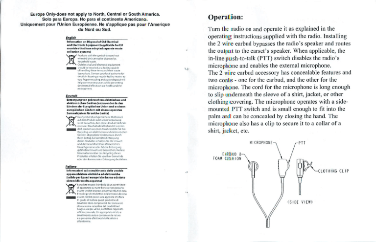 Europe Only-does not apply to North, Central or South America. Solo para Europa. No para el continente Americano. Operation: Uniquement pour I'Union Europeenne. Ne s'applique pas pour I'Amerique du Nord ou Sud. English Information on Dliposal of Old Electrical •nd Electronic Equipment (applicable for EU countries that have adopted leparate wast* collection lystemi) ' Product! with the symbol (crossed-out wheeled t*>) cannot be deposed as household watte. • OWelectricaland electronicequipment I should be recycledat a facBlty capable o< handling tl>«e items and iheit waste byproducts. Contact your IocjI authority fo» detail Inlocatinga recyclefacultynearestto you Propri lecytllf*] and *aste disposal will Iwlpconserveresourceswhilstpreventing detrimental enVcts on our health and the environment Dtutseh Entsorgung von gebrauchten elektriichen und elektronlichen Geriiten (anzuwenden In den Uindern der Europalschen Union und anderen europalschen Landem mlt elnam separaten Sammeliyitem fur solche Gerate) at Symbol (durchgestrichrne Multlonne) j( dem Pioduit oder *emei Verpackung etst darauf htn, dass dieses Piodu*t nlcht als . nornulcr Heushiltiabfall behandelt werden | darf.sondein an elner tanahmesteUe t\irdas Recycling von eleltrischen und efektronlschen i* Turn the radio on and operate it as explained in the operating instructions supplied with the radio. Installing the 2 wire earbud bypasses the radio's speaker and routes the output to the earset's speaker. When applicable, the in-line push-to-talk (PIT) switch disables the radio's microphone and enables the external microphone. The 2 wire earbud accessory has concealable features and two cords - one for the earbud, and the other for the microphone. The cord for the microphone is long enough to slip underneath the sleeve of a shirt, jacket, or other clothing covering. The microphone operates with a sidemounted PTT switch and is small enough to fit into the palm and can be concealed by closing the hand. The microphone also has a clip to secure it to a collar of a shirt, jacket, etc. Geraten abgeoeben werden muss. Durch Ihren Beltiag rur lorretten Entsorg<mg dieses Produltes schutien S*e die Umwelt und die Gesundhelt Ihrer MMmenschen MICROPHONE- UnsachoemAsse cxVr (als-che Entsorgung gefahrden Umweli und GesundndL Wrtere Informatbnenuber das Recycling d«es« Piodulies erhalten Sfc-von Ihrer Gemclnde oder den lommunalen Fntsoigungshetileben. EABBUD 4 FOAM CUSHION Itallano Information! sullo imaltlmento dalle vecchle •pparecchlatunt elettriche ed eletlronlche (valldo per I paeil europel die hanno adoltato ilitemi dl raccolta separata) I p'odottl recantl IIslrnbolodl uncontenitore dl spaz/atura su ruote batrato non possono ere smsltltl Insleme al normall rlflull dl casa. •cchl prodottl elemicl ed elettionlci devono j essereikkUu ptessounaapposttastruttuta In grado dl traitare quest! prodottl e dl smaltlrne I loro component! Perconoscere dove e come recapitare tall prodottl nel roogo a vol pfcjvlcino. conuttare rapposito utflcto comunale. Un appropiUto rV-icloe smafclmento aiuta a conservare to naturj e a preverure efletu nocM *M«salute e allamblente LOTH ING CLIP