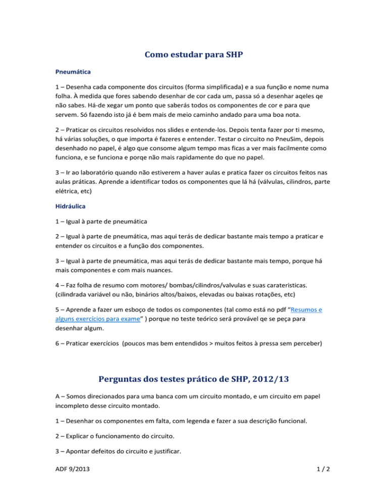 Como estudar para SHP Pneumática 1 – Desenha cada componente dos circuitos (forma simplificada) e a sua função e nome numa folha. À medida que fores sabendo desenhar de cor cada um, passa só a desenhar aqeles qe não sabes. Há-de xegar um ponto que saberás todos os componentes de cor e para que servem. Só fazendo isto já é bem mais de meio caminho andado para uma boa nota. 2 – Praticar os circuitos resolvidos nos slides e entende-los. Depois tenta fazer por ti mesmo, há várias soluções, o que importa é fazeres e entender. Testar o circuito no PneuSim, depois desenhado no papel, é algo que consome algum tempo mas ficas a ver mais facilmente como funciona, e se funciona e porqe não mais rapidamente do que no papel. 3 – Ir ao laboratório quando não estiverem a haver aulas e pratica fazer os circuitos feitos nas aulas práticas. Aprende a identificar todos os componentes que lá há (válvulas, cilindros, parte elétrica, etc) Hidráulica 1 – Igual à parte de pneumática 2 – Igual à parte de pneumática, mas aqui terás de dedicar bastante mais tempo a praticar e entender os circuitos e a função dos componentes. 3 – Igual à parte de pneumática, mas aqui terás de dedicar bastante mais tempo, porque há mais componentes e com mais nuances. 4 – Faz folha de resumo com motores/ bombas/cilindros/valvulas e suas carateristicas. (cilindrada variável ou não, binários altos/baixos, elevadas ou baixas rotações, etc) 5 – Aprende a fazer um esboço de todos os componentes (tal como está no pdf “Resumos e alguns exercícios para exame” ) porque no teste teórico será provável qe se peça para desenhar algum. 6 – Praticar exercícios (poucos mas bem entendidos > muitos feitos à pressa sem perceber) Perguntas dos testes prático de SHP, 2012/13 A – Somos direcionados para uma banca com um circuito montado, e um circuito em papel incompleto desse circuito montado. 1 – Desenhar os componentes em falta, com legenda e fazer a sua descrição funcional. 2 – Explicar o funcionamento do circuito. 3 – Apontar defeitos do circuito e justificar. ADF 9/2013 1/2 4 – Explicar o porquê de algum fenómeno observado, por exemplo, diferentes velocidades de avanço e recuo de um cilindro. 5 – Saber distinguir se os cilindros quando se moviam estavam em fonte de pressão ou caudal (óleo-hidráulica) B (óleo-hidráulica) – Somos direcionados para outra banca com componentes Exemplo de teste: Eletroválvula - caraterização completa; medir a resistência; ver a corrente e tensão nominal; calcular a potência nominal. Bomba ou motor - identificar o componente; caraterizar a distribuição do fluido de trabalho; identificar elementos do componente; dizer aplicações Cilindro - Tipo funcional Tipo construtivo Gama de pressões Identificação e caraterização de mais componentes, exemplo: - Saber a variabilidade ou não da cilindrade de bombas/motores, possibilidade ou não de inversão do sentido de rotação, etc; Identificação de válvulas e forma de montagem; Identificação de vedantes. ADF 9/2013 2/2