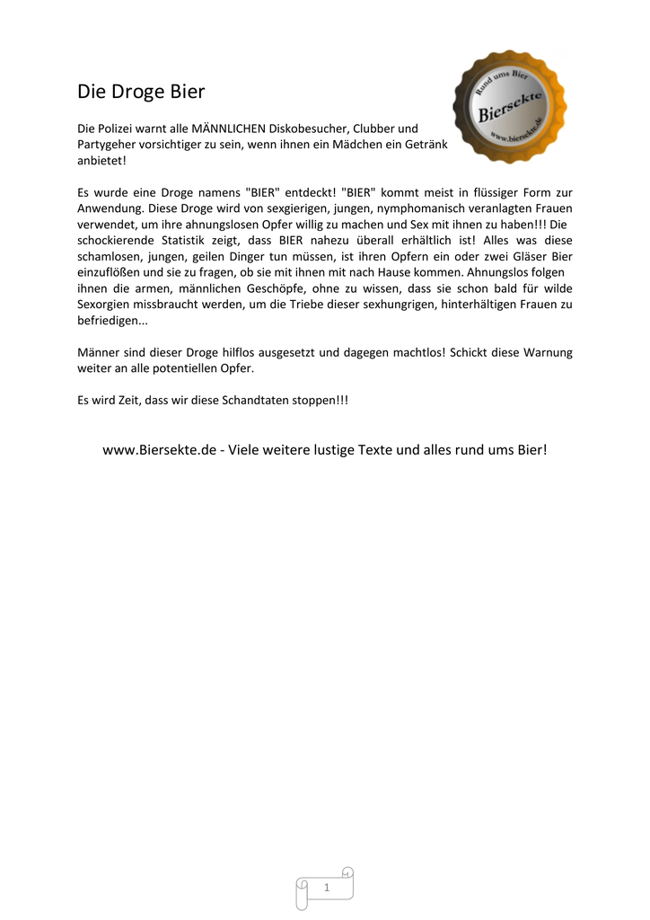 Die Droge Bier Die Polizei warnt alle MÄNNLICHEN Diskobesucher, Clubber und Partygeher vorsichtiger zu sein, wenn ihnen ein Mädchen ein Getränk anbietet! Es wurde eine Droge namens "BIER" entdeckt! "BIER" kommt meist in flüssiger Form zur Anwendung. Diese Droge wird von sexgierigen, jungen, nymphomanisch veranlagten Frauen verwendet, um ihre ahnungslosen Opfer willig zu machen und Sex mit ihnen zu haben!!! Die schockierende Statistik zeigt, dass BIER nahezu überall erhältlich ist! Alles was diese schamlosen, jungen, geilen Dinger tun müssen, ist ihren Opfern ein oder zwei Gläser Bier einzuflößen und sie zu fragen, ob sie mit ihnen mit nach Hause kommen. Ahnungslos folgen ihnen die armen, männlichen Geschöpfe, ohne zu wissen, dass sie schon bald für wilde Sexorgien missbraucht werden, um die Triebe dieser sexhungrigen, hinterhältigen Frauen zu befriedigen... Männer sind dieser Droge hilflos ausgesetzt und dagegen machtlos! Schickt diese Warnung weiter an alle potentiellen Opfer. Es wird Zeit, dass wir diese Schandtaten stoppen!!! www.Biersekte.de - Viele weitere lustige Texte und alles rund ums Bier! 1