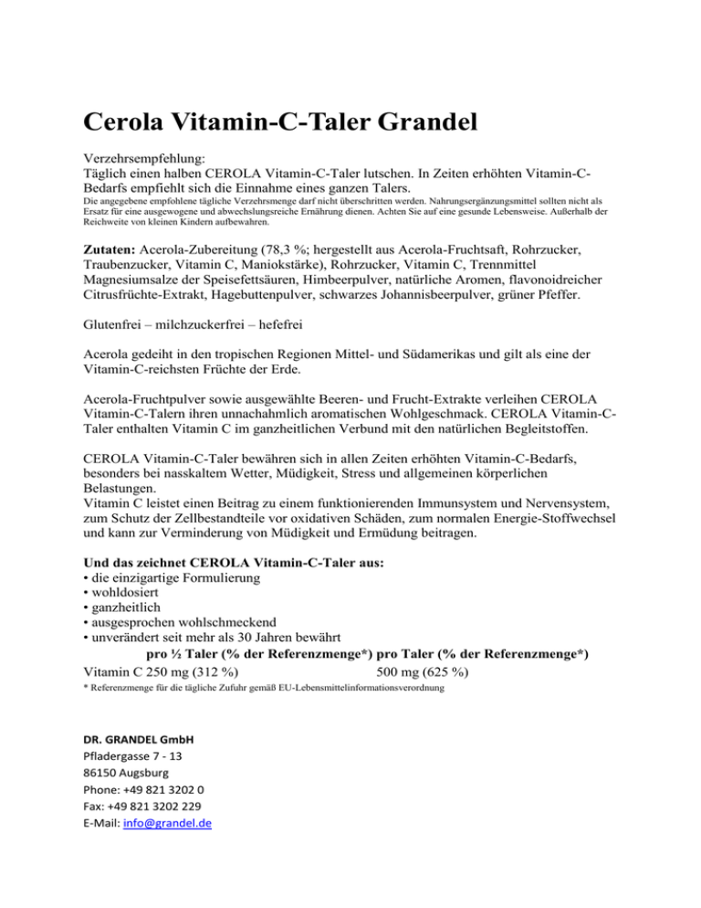Cerola Vitamin-C-Taler Grandel Verzehrsempfehlung: Täglich einen halben CEROLA Vitamin-C-Taler lutschen. In Zeiten erhöhten Vitamin-CBedarfs empfiehlt sich die Einnahme eines ganzen Talers. Die angegebene empfohlene tägliche Verzehrsmenge darf nicht überschritten werden. Nahrungsergänzungsmittel sollten nicht als Ersatz für eine ausgewogene und abwechslungsreiche Ernährung dienen. Achten Sie auf eine gesunde Lebensweise. Außerhalb der Reichweite von kleinen Kindern aufbewahren. Zutaten: Acerola-Zubereitung (78,3 %; hergestellt aus Acerola-Fruchtsaft, Rohrzucker, Traubenzucker, Vitamin C, Maniokstärke), Rohrzucker, Vitamin C, Trennmittel Magnesiumsalze der Speisefettsäuren, Himbeerpulver, natürliche Aromen, flavonoidreicher Citrusfrüchte-Extrakt, Hagebuttenpulver, schwarzes Johannisbeerpulver, grüner Pfeffer. Glutenfrei – milchzuckerfrei – hefefrei Acerola gedeiht in den tropischen Regionen Mittel- und Südamerikas und gilt als eine der Vitamin-C-reichsten Früchte der Erde. Acerola-Fruchtpulver sowie ausgewählte Beeren- und Frucht-Extrakte verleihen CEROLA Vitamin-C-Talern ihren unnachahmlich aromatischen Wohlgeschmack. CEROLA Vitamin-CTaler enthalten Vitamin C im ganzheitlichen Verbund mit den natürlichen Begleitstoffen. CEROLA Vitamin-C-Taler bewähren sich in allen Zeiten erhöhten Vitamin-C-Bedarfs, besonders bei nasskaltem Wetter, Müdigkeit, Stress und allgemeinen körperlichen Belastungen. Vitamin C leistet einen Beitrag zu einem funktionierenden Immunsystem und Nervensystem, zum Schutz der Zellbestandteile vor oxidativen Schäden, zum normalen Energie-Stoffwechsel und kann zur Verminderung von Müdigkeit und Ermüdung beitragen. Und das zeichnet CEROLA Vitamin-C-Taler aus: • die einzigartige Formulierung • wohldosiert • ganzheitlich • ausgesprochen wohlschmeckend • unverändert seit mehr als 30 Jahren bewährt pro ½ Taler (% der Referenzmenge*) pro Taler (% der Referenzmenge*) Vitamin C 250 mg (312 %) 500 mg (625 %) * Referenzmenge für die tägliche Zufuhr gemäß EU-Lebensmittelinformationsverordnung DR. GRANDEL GmbH Pfladergasse 7 - 13 86150 Augsburg Phone: +49 821 3202 0 Fax: +49 821 3202 229 E-Mail: [email protected]