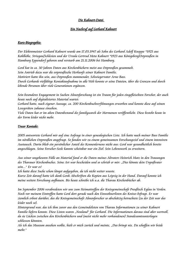 Die Kahnert-Datei Ein Nachruf auf Gerhard Kahnert Kurz-Biographie: Der Elektromeister Gerhard Kahnert wurde am 17.03.1947 als Sohn des Gerhard Adolf Knappe *1925 aus Kohlhöhe, Striegau/Schlesien und der Ursula Gertrud Meta Kahnert *1923 aus Königsberg/Ostpreußen in Hamburg Eppendorf geboren und verstarb am 21.11.2006 bei Hamburg. Gerd hat in ca. 30 Jahren Daten aus Kirchenbüchern meist aus Ostpreußen gesammelt. Sein Antrieb dazu war die ostpreußische Herkunft seiner Kahnert Familie. Motiviert hatte ihn sein, aus Ostpreußen stammender, Schwiegervater Arno Bass. Durch Gerhards vielfältige Kontaktaufnahme in alle Welt konnte er seine Dateien, über die Grenzen und durch lebende Personen über viele Generationen ergänzen. Sein besonderes Engagement in Sachen Ahnenforschung ist ein Traum für jeden eingefleischten Forscher, der auch heute noch auf digitalisiertes Material wartet: Gerhard hatte, nach eigener Aussage, ca. 200 Kirchenbuchverfilmungen erworben und konnte diese auf seinen Lesegeräten zuhause einsehen. Viele Daten hat er im alten Datenbestand des familysearch der Mormonen veröffentlicht. Diese besteht heute in der Form leider nicht mehr. Unser Kontakt: 2005 antwortete Gerhard mir auf eine Anfrage in einer genealogischen Liste. Ich hatte nach meiner Bass Familie im nördlichen Ostpreußen angefragt. So fanden wir zu einem gemeinsamen Forschungsziel und einem intensiven Austausch. Darin blieb ein persönlicher Anteil des Kennenlernens nicht aus: Gerd war gesundheitlich bereits angeschlagen. Seine Forscher-Seele kannte scheinbar nur ein Ziel: Sein Lebenswerk zu erweitern. Aus seiner ungeheuren Fülle an Material fand er die Daten meines Altvaters Heinrich Matz in den Trauungen des Tharauer Kirchenbuches. Seine Art war bescheiden und so schrieb er mir: „Dies könnte dein Urgroßvater sein...“ Er war es! Ich hatte diese Suche schon längst aufgegeben, da ich nicht weiter wusste. Kurze Zeit darauf hatte ich dank Gerds Abschriften die Kopien aus Leipzig in der Hand. Darauf konnte ich meine weitere Forschung aufbauen. Bis heute schreibe ich u.a. die Tharau Kirchenbücher ab. Im September 2006 verabredeten wir uns zum Heimattreffen der Kreisgemeinschaft Preußisch Eylau in Verden. Noch vor meinem Eintreffen hatte Gerd dort gerade nach den Einwohnerlisten des Kreises befragt. Er war ziemlich erbost darüber, das die Kreisgemeinschaft Ahnenforscher so abschätzig betrachtete (zu der Zeit war das leider noch so). Hintergrund war, das ich ihm zuvor aus den Gemeindelisten von Tharau Informationen zu seiner Kahnert Familie liefern konnte. Diese Listen waren „Neuland“ für Gerhard. Die Informationen daraus sind aber wertvoll, da sie Lücken zwischen den Kirchenbüchern und (meist nicht mehr vorhandenen) Standesamtsunterlagen schliessen könnten. Als ich das Museum ansehen wollte, hielt er mich zurück und meinte, „Das bringt nix. Da schaffen wir beide mehr.“ Er öffnete seinen Laptop und damit eine Gedcom Datei mit dem PAF Programm (Freeware der Mormonen). Darauf präsentierte er mir seine bis dahin digitalisierte Sammlung von 54155 Pers Nach vielen Erläuterungen zu Familiennamen und Orten, zog er die CD aus dem Laufwerk. Er übergab sie mir und sagte in ungefährem Wortlaut: „Ich weiss nicht, wieviel Zeit ich noch habe. Ich habe so viele Daten rausgeschrieben. Vieles passt noch nicht zusammen. Ich hoffe mir bleibt noch Zeit, das zu ändern. Wäre ärgerlich, wenn die [Daten] untergingen. Wenn ich nicht mehr bin, weiss ich nicht ob meine Söhne da durchsteigen und ob überhaupt jemand Interesse daran hat. Es ist nur ein Bruchteil aus den Filmen. Bei dir ist sie wohl gut aufgehoben [die CD], vielleicht steigst du ja durch. Mach damit was du willst“. Wir verblieben noch im Gespräch über die Veröffentlichung seiner Sammlungen in Form einer Netzpräsentation. Nach unserem zweistündigem Gespräch hielt ihn nichts mehr in Verden. Er hatte noch einen Termin in der Nähe... um Ahnenforschung zu betreiben...! Zum Ende...: blieben wir in regelmässigem Kontakt. Durch die Nähe unserer Forschungsgebiete konnte sogar ich meinen Teil zu Gerds persönlicher Forschung beitragen. Im Herbst stellte er seine Gedcom mit mehreren tausend Familiennamen auf einer eigenen Homepage ins Netz. Er erfüllte sich einen Traum damit! Am 23. Oktober erreichten mich an die 200 Kopien aus Kirchenbüchern. Sie sind ansonsten nicht einsehbar.... Auf meine letzte Mail im November folgte keine Rückmeldung.... Gerd wusste also doch so ungefähr, wieviel Zeit er noch hatte. Im noch jungen Gästebuch der Homepage teilte Gerds Bruder dessen Tod mit.... Kurz darauf wurde diese gelöscht. Ein letzter Gruß: Was blieb: ist der Sachsstand: 54155 digitalisierte Personen durch die 19248 Ehen/Partnerschaften entstanden sind. Hinterlassen hat er eine, mit Leidenschaft betriebene, Fleissarbeit. Vor allem aber die Erinnerung an einen Menschen, der viel zu früh unsere Forschergemeinde verlassen. Sein Auftreten war authentisch, die Schale schien rauh. Sein Handeln war zielgerichtet, pragmatisch und effektiv. Seine Herzlichkeit bestand im Geben. Die Kahnert-Datei soll also dem Andenken an Gerhard Kahnert dienen und seine wunderbare Arbeit fortführen. So mache ich mit dieser Hinterlassenschaft, was ich will und was Gerd vielleicht gefallen hätte?! Ich erweitere diese Datei und hoffe durch Austausch von Daten auf die Unterstützung von Mitforschern. Herzliche Grüße Andrea Thiel