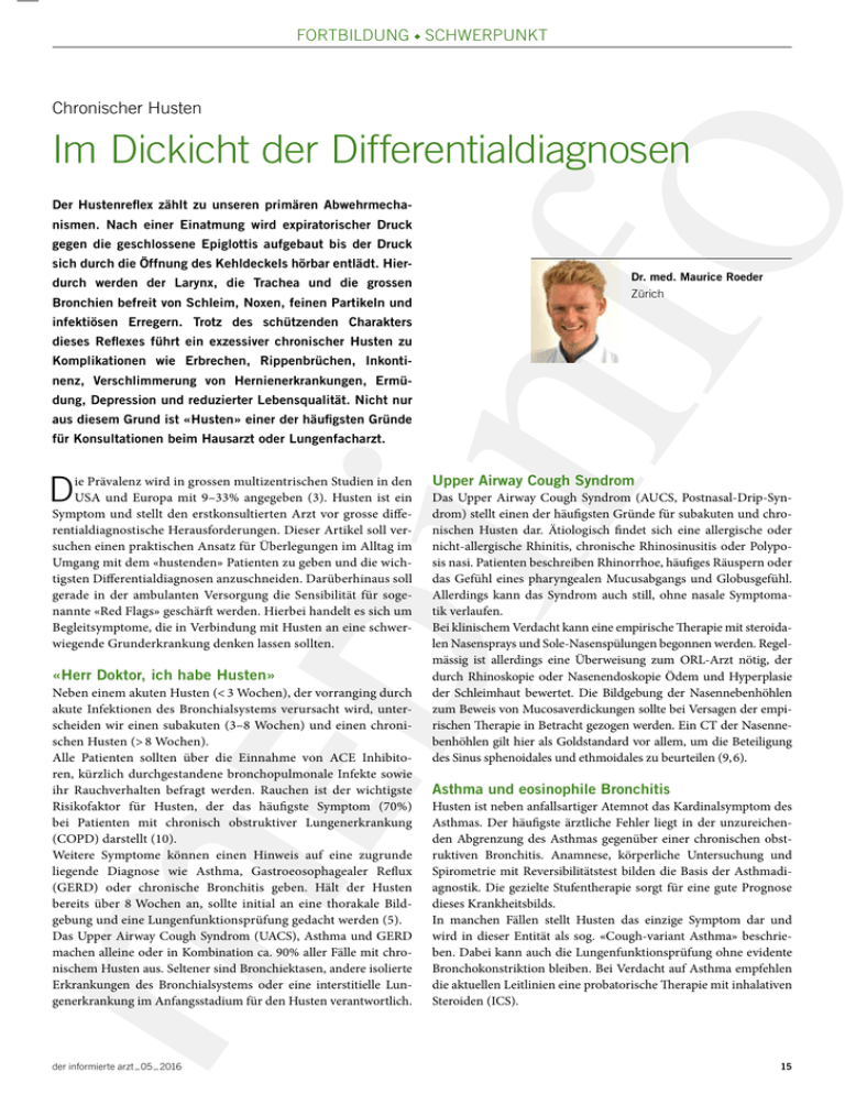 Fortbildung · Schwerpunkt Chronischer Husten Im Dickicht der Differentialdiagnosen Der Hustenreflex zählt zu unseren primären Abwehrmechanismen. Nach einer Einatmung wird expiratorischer Druck gegen die geschlossene Epiglottis aufgebaut bis der Druck sich durch die Öffnung des Kehldeckels hörbar entlädt. Hierdurch werden der Larynx, die Trachea und die grossen Bronchien befreit von Schleim, Noxen, feinen Partikeln und Dr. med. Maurice Roeder Zürich infektiösen Erregern. Trotz des schützenden Charakters dieses Reflexes führt ein exzessiver chronischer Husten zu Komplikationen wie Erbrechen, Rippenbrüchen, Inkontinenz, Verschlimmerung von Hernienerkrankungen, Ermüdung, Depression und reduzierter Lebensqualität. Nicht nur aus diesem Grund ist «Husten» einer der häufigsten Gründe für Konsultationen beim Hausarzt oder Lungenfacharzt. D ie Prävalenz wird in grossen multizentrischen Studien in den USA und Europa mit 9–33% angegeben (3). Husten ist ein Symptom und stellt den erstkonsultierten Arzt vor grosse differentialdiagnostische Herausforderungen. Dieser Artikel soll versuchen einen praktischen Ansatz für Überlegungen im Alltag im Umgang mit dem «hustenden» Patienten zu geben und die wichtigsten Differentialdiagnosen anzuschneiden. Darüberhinaus soll gerade in der ambulanten Versorgung die Sensibilität für sogenannte «Red Flags» geschärft werden. Hierbei handelt es sich um Begleitsymptome, die in Verbindung mit Husten an eine schwerwiegende Grunderkrankung denken lassen sollten. «Herr Doktor, ich habe Husten» Neben einem akuten Husten (< 3 Wochen), der vorranging durch akute Infektionen des Bronchialsystems verursacht wird, unterscheiden wir einen subakuten (3–8 Wochen) und einen chronischen Husten (> 8 Wochen). Alle Patienten sollten über die Einnahme von ACE Inhibitoren, kürzlich durchgestandene bronchopulmonale Infekte sowie ihr Rauchverhalten befragt werden. Rauchen ist der wichtigste Risikofaktor für Husten, der das häufigste Symptom (70%) bei Patienten mit chronisch obstruktiver Lungenerkrankung (COPD) darstellt (10). Weitere Symptome können einen Hinweis auf eine zugrunde liegende Diagnose wie Asthma, Gastroeosophagealer Reflux (GERD) oder chronische Bronchitis geben. Hält der Husten bereits über 8 Wochen an, sollte initial an eine thorakale Bildgebung und eine Lungenfunktionsprüfung gedacht werden (5). Das Upper Airway Cough Syndrom (UACS), Asthma und GERD machen alleine oder in Kombination ca. 90% aller Fälle mit chronischem Husten aus. Seltener sind Bronchiektasen, andere isolierte Erkrankungen des Bronchialsystems oder eine interstitielle Lungenerkrankung im Anfangsstadium für den Husten verantwortlich. der informierte arzt _ 05 _ 2016 Upper Airway Cough Syndrom Das Upper Airway Cough Syndrom (AUCS, Postnasal-Drip-Syndrom) stellt einen der häufigsten Gründe für subakuten und chronischen Husten dar. Ätiologisch findet sich eine allergische oder nicht-allergische Rhinitis, chronische Rhinosinusitis oder Polyposis nasi. Patienten beschreiben Rhinorrhoe, häufiges Räuspern oder das Gefühl eines pharyngealen Mucusabgangs und Globusgefühl. Allerdings kann das Syndrom auch still, ohne nasale Symptomatik verlaufen. Bei klinischem Verdacht kann eine empirische Therapie mit steroidalen Nasensprays und Sole-Nasenspülungen begonnen werden. Regelmässig ist allerdings eine Überweisung zum ORL-Arzt nötig, der durch Rhinoskopie oder Nasenendoskopie Ödem und Hyperplasie der Schleimhaut bewertet. Die Bildgebung der Nasennebenhöhlen zum Beweis von Mucosaverdickungen sollte bei Versagen der empirischen Therapie in Betracht gezogen werden. Ein CT der Nasennebenhöhlen gilt hier als Goldstandard vor allem, um die Beteiligung des Sinus sphenoidales und ethmoidales zu beurteilen (9, 6). Asthma und eosinophile Bronchitis Husten ist neben anfallsartiger Atemnot das Kardinalsymptom des Asthmas. Der häufigste ärztliche Fehler liegt in der unzureichenden Abgrenzung des Asthmas gegenüber einer chronischen obstruktiven Bronchitis. Anamnese, körperliche Untersuchung und Spirometrie mit Reversibilitätstest bilden die Basis der Asthmadiagnostik. Die gezielte Stufentherapie sorgt für eine gute Prognose dieses Krankheitsbilds. In manchen Fällen stellt Husten das einzige Symptom dar und wird in dieser Entität als sog. «Cough-variant Asthma» beschrieben. Dabei kann auch die Lungenfunktionsprüfung ohne evidente Bronchokonstriktion bleiben. Bei Verdacht auf Asthma empfehlen die aktuellen Leitlinien eine probatorische Therapie mit inhalativen Steroiden (ICS). 15 Fortbildung · Schwerpunkt Die Überweisung zu einem Pneumologen für einen Provokationstest durch Methacholin kann Aufschluss über die bronchiale Hyperreagibilität bringen. Die Diagnose wird allerdings erst durch das Ansprechen des Hustens auf die antiasthmatische Therapie gesichert, da 25–30% der Bevölkerung an einer asymptomatischen bronchialen Hyperreagibilität leiden. Chronischer Husten bei Eosinophilie im Sputum (> 3%) ohne bronchiale Hyperreagibilität und mit normaler Lungenfunktion spricht für eine eosinophile Bronchitis. Die Bestimmung der Fraktion des exhalierten Stickstoffoxids (Fe-NO) kann einen Hinweis auf diese eosinophile Entzündung bei normwertigem Provokationstest liefern. Die eosinophile Bronchitis war einer Studie zufolge die Hauptdiagnose bei 13% aller Patienten, die vom Hausarzt zum Pneumologen aufgrund isolierten chronischen Hustens überwiesen wurden (2). Rezidivierende kleine Lungenembolien, die als Vorbote einer schweren Embolie auftreten können, zeigen sich teilweise mit chronischem Husten in Verbindung mit Leistungsminderung und Belastungsdyspnoe. Der Wells-Score sollte zur Abklärung der klinischen Vortestwahrscheinlichkeit herangezogen werden und in Verbindung mit der Bestimmung der D-Dimere eine Lungenembolie ausschliessen (1). Dr. med. Maurice Roeder LungenZentrum Hirslanden Witellikerstrasse 40, 8032 Zürich [email protected] B Interessenkonflikt: Der A