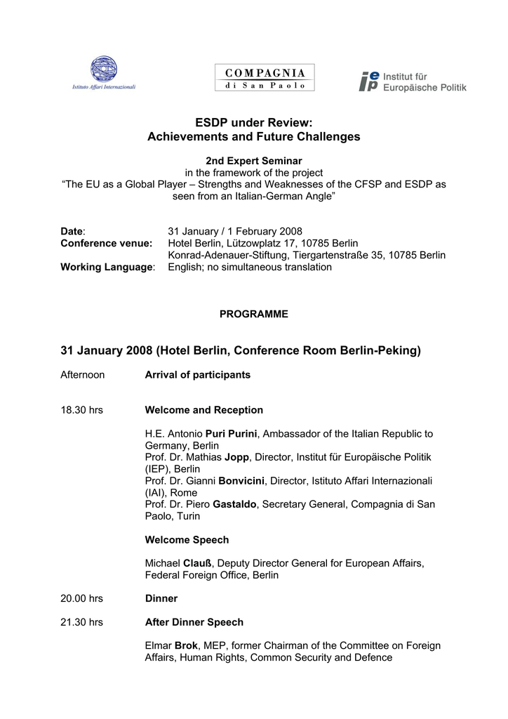 ESDP under Review: Achievements and Future Challenges 2nd Expert Seminar in the framework of the project “The EU as a Global Player – Strengths and Weaknesses of the CFSP and ESDP as seen from an Italian-German Angle” Date: Conference venue: Working Language: 31 January / 1 February 2008 Hotel Berlin, Lützowplatz 17, 10785 Berlin Konrad-Adenauer-Stiftung, Tiergartenstraße 35, 10785 Berlin English; no simultaneous translation PROGRAMME 31 January 2008 (Hotel Berlin, Conference Room Berlin-Peking) Afternoon Arrival of participants 18.30 hrs Welcome and Reception H.E. Antonio Puri Purini, Ambassador of the Italian Republic to Germany, Berlin Prof. Dr. Mathias Jopp, Director, Institut für Europäische Politik (IEP), Berlin Prof. Dr. Gianni Bonvicini, Director, Istituto Affari Internazionali (IAI), Rome Prof. Dr. Piero Gastaldo, Secretary General, Compagnia di San Paolo, Turin Welcome Speech Michael Clauß, Deputy Director General for European Affairs, Federal Foreign Office, Berlin 20.00 hrs Dinner 21.30 hrs After Dinner Speech Elmar Brok, MEP, former Chairman of the Committee on Foreign Affairs, Human Rights, Common Security and Defence 1 February 2008 (Konrad-Adenauer-Stiftung, Jakob-Kaiser-Saal) 9.00 hrs Introduction into the Seminar (Background Paper: ESDPOperations – Experiences, Tendencies and Lessons Learned) Chair Dr. Elfriede Regelsberger, Deputy Director, Institut für Europäische Politik (IEP), Berlin Introduction Nicoletta Pirozzi, IAI, Rome and Sammi Sandawi, IEP, Berlin 9.20 hrs SESSION I: ESDP-Operations: Experiences, Tendencies and Lessons Learned Chair General Vincenzo Camporini, Chief of Defence Staff, Rome Introductions Brigadegeneral Gerhard Kemmler, Military Representative of Germany, Permanent Representation of Germany to the EU, Brussels General Giuseppe Valotto, President, Centro Alti Studi per la Difesa, Rome Comments Prof. Dr. Gianni Bonvicini, Director, IAI, Rome Dr. Heiko Borchert, Director, Borchert & Co., Luzern Discussion 11.00 hrs Coffee break 2 11.15 hrs SESSION II: Command, Control, Intelligence and Headquarters – Assessment and Future Requirements Chair Franz H. U. Borkenhagen, Head of Planning Staff (ret.), Federal Ministry of Defence, Berlin Introductions Kapitän zur See Jürgen Ehle, Head Fü S III 4, Federal Ministry of Defence, Berlin Admiral Luciano Callini, Director Centro Militare di Studi Strategici (CeMiSS), Rome Comments Martin Valkysers, Project Manager, IndustrieanlagenBetriebsgesellschaft mbH, Ottobrunn Giovanni Gasparini, Senior Research Fellow, IAI, Rome 13.00 hrs Lunch Buffet 14.00 hrs SESSION III: The EU in Rapid Response – Conceptions and Capabilities Chair Ambassador Guido Lenzi, Diplomatic Counsellor of the Minister of the Interior, Rome Introductions Christian Mölling, Senior Researcher, Center for Security Studies (ETH Zurich) / Institute for Peace Research and Security Policy Hamburg (IFSH) Comments Min. Plen. Luca Giansanti, Directorate General for European Integration, Ministry of Foreign Affairs, Rome Kapitän zur See a. D. Volker Heise, Stiftung Wissenschaft und Politik (SWP), Berlin 3 15.45 hrs Coffee break 16.00 hrs SESSION IV: Prospects for the ESDP: Future Challenges and Potential Responses Chair Prof. Dr. Mathias Jopp, Director, IEP, Berlin Introductions Bernhard Kampmann, Counsellor, Head of Desk 202, Federal Foreign Office, Berlin Ambassador Andrea Meloni, Italian Representative to COPS, Brussels 17.00 hrs Concluding Remarks Prof. Dr. Mathias Jopp, IEP, Berlin End of seminar 4