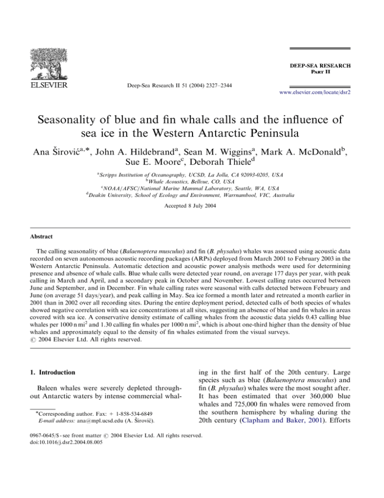 ARTICLE IN PRESS Deep-Sea Research II 51 (2004) 2327–2344 www.elsevier.com/locate/dsr2 Seasonality of blue and fin whale calls and the influence of sea ice in the Western Antarctic Peninsula Ana Širovića,, John A. Hildebranda, Sean M. Wigginsa, Mark A. McDonaldb, Sue E. Moorec, Deborah Thieled a Scripps Institution of Oceanography, UCSD, La Jolla, CA 92093-0205, USA b Whale Acoustics, Bellvue, CO, USA c NOAA/AFSC/National Marine Mammal Laboratory, Seattle, WA, USA d Deakin University, School of Ecology and Environment, Warrnambool, VIC, Australia Accepted 8 July 2004 Abstract The calling seasonality of blue (Balaenoptera musculus) and fin (B. physalus) whales was assessed using acoustic data recorded on seven autonomous acoustic recording packages (ARPs) deployed from March 2001 to February 2003 in the Western Antarctic Peninsula. Automatic detection and acoustic power analysis methods were used for determining presence and absence of whale calls. Blue whale calls were detected year round, on average 177 days per year, with peak calling in March and April, and a secondary peak in October and November. Lowest calling rates occurred between June and September, and in December. Fin whale calling rates were seasonal with calls detected between February and June (on average 51 days/year), and peak calling in May. Sea ice formed a month later and retreated a month earlier in 2001 than in 2002 over all recording sites. During the entire deployment period, detected calls of both species of whales showed negative correlation with sea ice concentrations at all sites, suggesting an absence of blue and fin whales in areas covered with sea ice. A conservative density estimate of calling whales from the acoustic data yields 0.43 calling blue whales per 1000 n mi2 and 1.30 calling fin whales per 1000 n mi2, which is about one-third higher than the density of blue whales and approximately equal to the density of fin whales estimated from the visual surveys. r 2004 Elsevier Ltd. All rights reserved. 1. Introduction Baleen whales were severely depleted throughout Antarctic waters by intense commercial whalCorresponding author. Fax: + 1-858-534-6849 E-mail address: [email protected] (A. Širović). ing in the first half of the 20th century. Large species such as blue (Balaenoptera musculus) and fin (B. physalus) whales were the most sought after. It has been estimated that over 360,000 blue whales and 725,000 fin whales were removed from the southern hemisphere by whaling during the 20th century (Clapham and Baker, 2001). Efforts 0967-0645/$ - see front matter r 2004 Elsevier Ltd. All rights reserved. doi:10.1016/j.dsr2.2004.08.005 ARTICLE IN PRESS 2328 A. Širović et al. / Deep-Sea Research II 51 (2004) 2327–2344 to document the status of whale populations in the Western Antarctic Peninsula region have been limited to three cruises simultaneously conducted by up to four vessels under the auspices of the International Whaling Commission during 1982/ 83, 1989/90, and 1993/94 in Area I (longitude 601–1201W). These cruises yielded only nine blue whale sightings and 14 fin whale sightings (Branch and Butterworth, 2001). Such alarmingly low sightings suggest either a population in jeopardy, inadequate population assessment methods, or both (Horwood, 1986; IWC, 2001). The need to develop alternative methods of assessing whale populations, such as passive acoustics, has already been established (Clark and Ellison, 1988, 1989; Clark and Fristrup, 1997), but this need is even more important for the Southern Ocean given the considerable expense and logistical constraints of working there (Costa and Crocker, 1996). Seasonal migrations have been documented, both visually and acoustically, for several baleen whale species (Mackintosh and Wheeler, 1929; Dawbin, 1966; Mackintosh, 1966; Clapham and Mattila, 1990; Katona and Beard, 1990; Mate et al., 1999; Norris et al., 1999; Stafford et al., 1999b). In general, many baleen whales spend summers feeding in productive waters at high latitudes and over-winter in warmer waters at lower latitudes (Mackintosh and Wheeler, 1929; Mackintosh, 1965; Bowen and Siniff, 1999). Whaling records suggest that blue and fin whales migrate seasonally to and from the Southern Ocean (Kellogg, 1929; Brown, 1962; Mackintosh, 1966). Although blue whales have been found close to the ice edge in the austral summer (Kasamatsu et al., 1988), there is little information on their wintering areas (Mackintosh, 1965; Mizroch et al., 1984) and some high latitude areas, such as South Georgia and the North Pacific, may be continuously occupied by blue whales (Kellogg, 1929; Hart, 1935; Curtis et al., 1999; Watkins et al., 2000; Stafford et al., 2001). Fin whales are rarely sighted at the ice edge during the summer and in the winter they appear to calf and breed at low latitudes (Laws, 1961; Brown, 1962). Aggregations of blue and fin whales have been observed in association with dense patches of euphausiids during the summer and fall in regions with high biological productivity (Croll et al., 1998; Fiedler et al., 1998; Reid et al., 2000; Murase et al., 2002). These regions often have distinguishing characteristics such as complex bathymetry, presence of sharp oceanographic fronts, eddies, and upwelling that can support high phytoplankton and zooplankton biomass (Beklemishev, 1960; Whitehead and Glass, 1985; Reilly and Thayer, 1990; Fiedler et al., 1998; Tynan, 1998). In the highly productive Southern Ocean, sea ice is an additional factor that affects the ecosystem, generally increasing krill productivity in areas of large sea ice fluctuation, thereby also affecting higher trophic predators (Smith and Nelson, 1985; Fraser et al., 1992; Loeb et al., 1997; Nicol et al., 2000; Croxall et al., 2002). The Western Antarctic Peninsula has a distinct, fluctuating sea ice pattern (Stammerjohn and Smith, 1996), which could support high primary productivity, concentrations of Antarctic krill, and higher predat