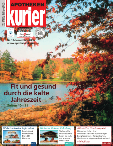 Sie finden uns online in Deutschlands größtem Seniorenportal: www.feierabend.com Nr. 11/November 2006 www.apothekenkurier.de Fit und gesund durch die kalte Jahreszeit Seiten 10 – 11 Diabetes Kurier informiert Revolutionär bei Diabetes: Die LOGIMethode S. 17 Wellness, Reisen, Erholung Wellness für Leib und Seele. Lesen Sie mehr auf unseren Info-Seiten. ab S. 27 Attraktive Gewinnspiele! Mitmachen lohnt sich! Gewinnen Sie einen hochwertigen Dampfgarer oder Konzertkarten. Gleich nachschlagen und mitmachen! Viel Glück! S. 30 + 32 I N H A LT Editorial Wellness ist voll im Trend – der Begriff geradezu inflationär gebraucht: vom Wellness-Urlaub über Wellness-Outfit bis hin zum Wellness-Joghurt. Für uns umschreibt der Begriff ein Lebensgefühl, das auf gesundem und aktivem Genuss gründet. Deshalb sprechen wir in dieser Ausgabe von Herbst & Winter-Wellness – und meinen damit, wie sich die kalte Jahreszeit unversehrt und voll positiver Energie meistern lässt. Entdecken Sie also die schönen Seiten des Winters, bauen Sie gezielt Erkältung und Co. vor, gönnen Sie sich öfters etwas Gutes – dann wird aus den bevorstehenden dunklen und kalten Monaten vielleicht ein Wintermärchen. Mehr dazu lesen Sie auf den folgenden Seiten der neusten Ausgabe Ihres Apotheken Kuriers. Thema des Monats: Fit und gesund durch die kalte Jahreszeit Wellness für Herbst & Winter Augengesundheit Weltweit häufigste Erblindungsursache: Grauer Star – was nun? 12 10 – 11 Besser leben mit Diabetes Gesundheit & Wellness Revolutionär bei Diabetes: Die LOGI-Methode 17 Dranginkontinenz: Stress mit der hyperaktiven Blase 9 Wenn der Stoffwechsel entgleist 18 Impulse für ein aktives, gesundes Leben 20 „Wie jung ist Ihr Herz?“ 21 Ausgewogen ernähren bei Typ-2-Diabetes 22 Die Bluterkrankheit (Hämophilie) 14 Vitamin-E-Notstand 15 Bequem von zu Hause aus einkaufen 26 Der ambulante Pflegeführer 27 Sensible Diabetikerhaut 23 Kultur pur Onkologie Maligne Lymphome auf dem Vormarsch 24 Heilpflanze des Monats Christoph Trick Interview: Eine neue Multifokallinsen-Generation macht’s möglich 16 Hagebuttenpulver gegen Gelenkbeschwerden? 32 Theater: „Die Kaktusblüte“ 32 Gewinnspiele 4 Chefredakteur Schonend Garen für mehr Geschmack und Gesundheit 30 „Eine kleine Lachmusik“ Haut und Haare Nervender Juckreiz Musik: „Eine kleine Lachmusik“ 6 Neurodermitis: Tägliche Pflege hilft Kortison sparen 6 Haare – ein Thema so alt wie die Menschheit 7 32 Serviceseiten Impressum 32 Rätsel / Rätselauflösung 35 Gesund im Mund Interview: Parodontitis früh erkennen 12 Beim Zahnwechsel ist die richtige Zahnpasta notwendig 13 .%5 (iMORRIDEN SCHMERZEN 0OSTERISANAKUT 2EKTALSALBE 2EKTALSALBE IN %INMALTUBEN 2EKTALSALBE MIT !NALDEHNER :iPFCHEN :iPFCHEN MIT -ULLEINLAGE (AEMOTAMP !NWENDUNGSGEBIETE 2EKTALSALBE ,INDERUNG VON 3CHMERZEN IM !NAL BEREICH VOR PROKTOLOGISCHER 5NTERSUCHUNG :iPFCHEN *UCKREIZ UND 3CHMERZEN IM !NALBEREICH BEI (iMOR RHOIDALLEIDEN !NAL½SSUREN !NAL½STELN !BSZESSEN UND 0ROKTITIS ZUR SYMPTOMATISCHEN "EHANDLUNG VOR UND NACH ANOREKTALEN 5NTERSUCHUNGEN UND /PERATIONEN :U 2ISIKEN UND .EBENWIRKUNGEN LESEN 3IE DIE 0ACKUNGSBEILAGE UND FRAGEN 3IE )HREN !RZT ODER !POTHEKER 3TAND -iRZ 'RATIS #OUPON BITTE ABTRENNEN UND EINSCHICKEN *A BITTE SCHICKEN 3IE MIR )HRE 0ATIENTENBROSCH~RE Â'UT ZU WISSEN± ZUM 4HEMA (iMORRIDEN .AME 3TRAE 0,:/RT !POTHEKEN +URIER $2 +!$% À 2IGISTRAE À "ERLIN À INFO KADEDE /DER NUTZEN 3IE UNSEREN $OWNLOADSERVICE UNTER WWWPOSTERISANDE www.apothekenkurier.de November 2006 ■ 3 Heilpflanze des Monats Hagebuttenpulver gegen Gelenkbeschwerden? Barbara D. (51) hat eine lange Leidenszeit hinter sich: Vor 5 Jahren traten im Urlaub erstmals Schmerzen auf, die sie fortan ständig quälten. Diagnose: Entzündung im Schultergelenk. Barbara D. nimmt nun seit über einem Jahr das Hagebuttenpulver und hat kaum noch Beschwerden. Die Erfolgsgeschichte des Hagebuttenpulvers „Den Urlaub werde ich so schnell nicht vergessen, denn er war alles andere als schön. Ich war bei all meinen Aktivitäten total eingeschränkt.“ Irgendwann traten die Schmerzen auch in den Knien auf: „Alltagstätigkeiten wie Treppensteigen, Einkaufstüten tragen, Fahrrad fahren – das alles ging nur noch mit Mühe“, erinnert sich Barbara D. Doch das ist inzwischen Vergangenheit, heute ist Barbara D. wieder so aktiv wie früher. Seit dem Frühjahr letzten Jahres sind Schmerzen fast kein Thema mehr. Die Mutter von Barbara D. brachte Hilfe Barbara D. hatte Glück: Ihre Mutter, die auch unter Schmerzen in den Kniegelenken litt, hatte positive Erfahrungen mit einem Hagebuttenpulver gemacht. Sie empfahl es ihrer Tochter natürlich sofort. Auch bei ihrer Tochter wirkte die Ernährungstherapie: 4 ■ November 2006 www.apothekenkurier.de Hagebuttenpulver bei Gelenkproblemen? In der Tat – diese Entdeckung machte der dänische Bauer Erik Hansen auf der Ostsee-Insel Langeland. Er litt ebenfalls unter schmerzenden Gelenken und stellte eines Tages fest, dass er nach dem Genuss der selbst gemachten Hagebuttenmarmelade einer Bekannten etwas Besserung verspürte. Daraufhin sammelte er selbst die reifen Hagebutten der im Sommer so schön rosa blühenden Hundsrosen (Rosa canina) in seiner Umgebung, trocknete sie vorsichtig und stellte anfangs noch in einer Kaffeemühle ein feines Pulver daraus her. Die regelmäßige Einnahme des Pulvers verminderte seine Gelenkbeschwerden tatsächlich, sodass er bald auch seine Bekannten damit versorgte – ebenfalls mit verblüffendem Erfolg. Wissenschaftler fanden den Inhaltsstoff GOPO im Hagebuttenpulver von Hansen Als der Sohn von Erik Hansen den Bauernhof und die Hagebuttenproduktion übernehmen sollte, wollte er wissen, ob an der Wirkung des Nährstoffes Hagebuttenpulver wirklich etwas dran war. Er zog Wissenschaftler hinzu, um dies feststellen zu lassen. Laborversuche belegten bald, dass das in Hagebutten enthaltene GOPO, ein Galaktolipid, zu einer Verminderung von Entzündungen führen kann. Inzwischen