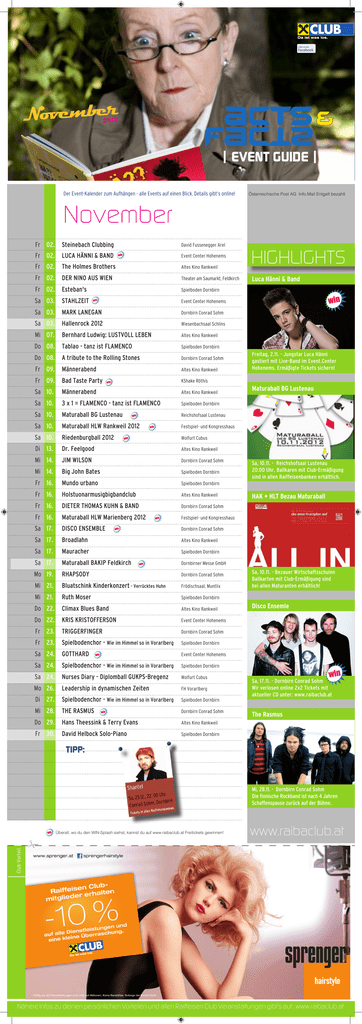 mit Outline: November 2012 | EVENT GUIDE | Der Event-Kalender zum Aufhängen - alle Events auf einen Blick. Details gibt’s online! Österreichische Post AG Info.Mail Entgelt bezahlt November Fr 02. Steinebach Clubbing David Fussenegger Arel Fr 02. LUCA HÄNNI & BAND Event Center Hohenems Fr 02. The Holmes Brothers Altes Kino Rankweil HIGHLIGHTS Fr 02. DER NINO AUS WIEN Theater am Saumarkt, Feldkirch Luca Hänni & Band Fr 02. Esteban's Spielboden Dornbirn Sa 03. STAHLZEIT Event Center Hohenems Sa 03. MARK LANEGAN Dornbirn Conrad Sohm Sa 03. Hallenrock 2012 Wiesenbachsaal Schlins Mi 07. Bernhard Ludwig: LUSTVOLL LEBEN Altes Kino Rankweil Do 08. Tablao - tanz ist FLAMENCO Spielboden Dornbirn Do 08. A tribute to the Rolling Stones Dornbirn Conrad Sohm Fr 09. Männerabend Altes Kino Rankweil Fr 09. Bad Taste Party KShake Röthis Sa 10. Männerabend Altes Kino Rankweil Sa 10. 3 x 1 = FLAMENCO - tanz ist FLAMENCO Spielboden Dornbirn Sa 10. Maturaball BG Lustenau Reichshofsaal Lustenau Sa 10. Maturaball HLW Rankweil 2012 Festspiel- und Kongresshaus Sa 10. Riedenburgball 2012 Wolfurt Cubus Di 13. Dr. Feelgood Altes Kino Rankweil Mi 14. JIM WILSON Dornbirn Conrad Sohm Mi 14. Big John Bates Spielboden Dornbirn Fr 16. Mundo urbano Spielboden Dornbirn Fr 16. Holstuonarmusigbigbandclub Altes Kino Rankweil Fr 16. DIETER THOMAS KUHN & BAND Dornbirn Conrad Sohm Fr 16. Maturaball HLW Marienberg 2012 Festspiel- und Kongresshaus Sa 17. DISCO ENSEMBLE Dornbirn Conrad Sohm Sa 17. Broadlahn Altes Kino Rankweil Sa 17. Mauracher Spielboden Dornbirn Sa 17. Maturaball BAKIP Feldkirch Dornbirner Messe GmbH Mo 19. RHAPSODY Dornbirn Conrad Sohm Mi 21. Bluatschink Kinderkonzert - Verrücktes Huhn Frödischsaal, Muntlix Mi 21. Ruth Moser Spielboden Dornbirn Do 22. Climax Blues Band Altes Kino Rankweil Do 22. KRIS KRISTOFFERSON Event Center Hohenems Fr 23. TRIGGERFINGER Dornbirn Conrad Sohm Fr 23. Spielbodenchor - Wie im Himmel so in Vorarlberg Spielboden Dornbirn Sa 24. GOTTHARD Event Center Hohenems Sa 24. Spielbodenchor - Wie im Himmel so in Vorarlberg Spielboden Dornbirn Sa 24. Nurses Diary - Diplomball GUKPS-Bregenz Wolfurt Cubus Mo 26. Leadership in dynamischen Zeiten FH Vorarlberg Di 27. Spielbodenchor - Wie im Himmel so in Vorarlberg Spielboden Dornbirn Mi 28. THE RASMUS Dornbirn Conrad Sohm Do 29. Hans Theessink & Terry Evans Altes Kino Rankweil Fr 30. David Helbock Solo-Piano Spielboden Dornbirn Freitag, 2.11. - Jungstar Luca Hänni gastiert mit Live-Band im Event.Center Hohenems. Ermäßigte Tickets sichern! Maturaball BG Lustenau Sa, 10.11. - Reichshofsaal Lustenau 20:00 Uhr, Ballkaren mit Club-Ermäßigung sind in allen Raiffeisenbanken erhältlich. HAK + HLT Bezau Maturaball Sa, 10.11. - Bezauer Wirtschaftsschulen Ballkarten mit Club-Ermäßigung sind bei allen Maturanten erhältlich! Disco Ensemle Sa, 17.11. - Dornbirn Conrad Sohm Wir verlosen online 2x2 Tickets mit aktueller CD unter: www.raibaclub.at The Rasmus TIPP: Mi, 28.11. - Dornbirn Conrad Sohm Die finnische Rockband ist nach 4 Jahren Schaffenspause zurück auf der Bühne. Club-Vorteil Überall, wo du den WIN-Splash siehst, kannst du auf www.raibaclub.at Freitickets gewinnen! www.raibaclub.at Nähere Infos zu deinen persönlichen Vorteilen und allen Raiffeisen Club Veranstaltungen gibt‘s auf : www.raibaclub.at Schulballkalender n Blick e in e f u a r h Ja e d n E is b lle ä lb Alle Schu winnen + all ge ... Karten zum Wunsch-Maturab Sa. 10. Nov. BG Lustenau Reichshofsaal Lustenau Sa. 10. Nov. HLW Rankweil Festspielhaus Bregenz Sa. 10. Nov. Sacré Coeur Riedenburg* Cubus Wolfurt Sa. 10. Nov. HAK und HLT Bezau Wirtschaftsschule Bezau Fr. 16. Nov. HAK Feldkirch Messehalle Dornbirn Fr. 16. Nov. HLW Marienberg Bregenz* Festspielhaus Bregenz Sa. 17. Nov. BAKIP Feldkirch* Messehalle Dornbirn Sa. 17. Nov. BG Gallusstraße Festspielhaus Bregenz Fr. 23. Nov. HTL Rankweil Messehalle Dornbirn Sa. 24. Nov. Lehrlingsball der Vorarlberger Industrie Festspielhaus Bregenz Sa. 24. Nov. BORG Götzis* Kulturhaus AMBACH Götzis Sa. 24. Nov. Schule für Gesundheitsplfege- und Krankenpflege* Cubus Wolfurt Sa. 24. Nov. BG Bludenz Messehalle Dornbirn Sa. 01. Dez. Tourismusschule Bludenz Messehalle Dornbirn * Tickets in allen Raiffeisenbaken mit Clubermäßigung erhältlich die ersten 10, die eine e-Mail an [email protected] senden, erhalten je 2 Karten zu ihrem Wunsch-Maturaball. Mitmachen lohnt sich. Wintertrends 2012/2013 + W intertrends 2012/13 Auch wenn sich das Wetter noch etwas sträubt, der nächste Winter kommt bestimmt. Wir haben die aktuellen Trends für die Saison 2012/2013 für euch aufgestöbert! + Outfit Nicht nur stylisch, sondern warm, trocken und mit ausreichend Bewegungsfreiheit muss die Mode sein. Der Farbtrend geht weg von schrillen Farben hin zu gedeckteren Tönen wie Olive, Tabacco oder Dunkelblau – oft auch durchzogen von klaren Leuchtfarben. In Sachen Skischuhe gibt’s was Neues: Materialen wie Carbonfasern und Magnesium machen die Boots leichter. Android S eingeba kibrille mit utem D isplay + Sportgeräte Nervenkitzelgarantie ist angesagt: Das Dual-Snowboard (zweiteiliges Board) wird immer beliebter. Es macht tierisch Spaß und man hat das Board bei allen Manövern am Fuß. Weiter im Kommen ist auch der Rocker-Ski (Weiterentwicklung vom Carver), der hauptsächlich zum Freeriden verwendet wird. Die in der Schweiz entwickelten Airboards sorgen mit bis zu 100 km/h für ordentlich Adrenalin – auf dem Bauch liegen! Jugendwörter 2012 + High-tech Während der Rodel sein Oldschool-Comeback feiert, ist auch High-tech angesagt. Die Firma Recon Instruments hat bereits eine Android Skibrille mit eingebautem Display auf dem Markt (ab 140 Euro)! r blümte e v n u ie d t k c e td Langenscheid Wahrheit über die Jugendsprache auf Die Kreativität der Jugendsprache ist unbestritten. Gewitzte Metaphern zeugen von großem Einfallsreichtum und präziser Beobachtung. So bekommen auch die Begriffe „Sushi" und „Zweitwohnung“ eine ganz andere Bedeutung. F