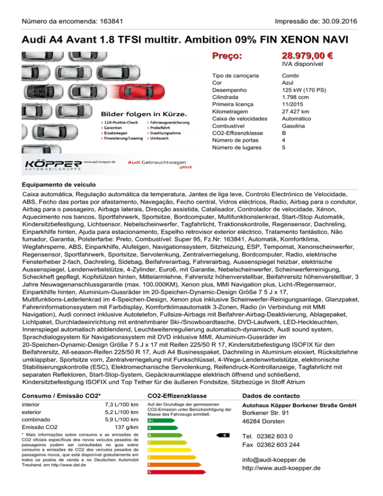Número da encomenda: 163841 Impressão de: 30.09.2016 Audi A4 Avant 1.8 TFSI multitr. Ambition 09% FIN XENON NAVI Preço: 28.979,00 € IVA disponível Tipo de carroçaria Cor Desempenho Cilindrada Primeira licença Kilometragem Caixa de velocidades Combustível CO2-Effizenzklasse Número de portas Número de lugares Combi Azul 125 kW (170 PS) 1.798 ccm 11/2015 27.427 km Automático Gasolina B 4 5 Equipamento de veículo Caixa automática, Regulação automática da temperatura, Jantes de liga leve, Controlo Electrónico de Velocidade, ABS, Fecho das portas por afastamento, Navegação, Fecho central, Vidros eléctricos, Radio, Airbag para o condutor, Airbag para o passageiro, Airbags laterais, Direcção assistida, Catalisador, Controlador de velocidade, Xénon, Aquecimento nos bancos, Sportfahrwerk, Sportsitze, Bordcomputer, Multifunktionslenkrad, Start-/Stop Automatik, Kindersitzbefestigung, Lichtsensor, Nebelscheinwerfer, Tagfahrlicht, Traktionskontrolle, Regensensor, Dachreling, Einparkhilfe hinten, Ajuda para estacionamento, Espelho retrovisor exterior eléctrico, Tratamento fantástico, Não fumador, Garantia, Polsterfarbe: Preto, Combustível: Super 95, Fz.Nr: 163841, Automatik, Komfortklima, Wegfahrsperre, ABS, Einparkhilfe, Alufelgen, Navigationssystem, Sitzheizung, ESP, Tempomat, Xenonscheinwerfer, Regensensor, Sportfahrwerk, Sportsitze, Servolenkung, Zentralverriegelung, Bordcomputer, Radio, elektrische Fensterheber 2-fach, Dachreling, Sidebag, Beifahrerairbag, Fahrerairbag, Aussenspiegel heizbar, elektrische Aussenspiegel, Lendenwirbelstütze, 4-Zylinder, Euro6, mit Garantie, Nebelscheinwerfer, Scheinwerferreinigung, Scheckheft gepflegt, Kopfstützen hinten, Mittelarmlehne, Fahrersitz höhenverstellbar, Beifahrersitz höhenverstellbar, 3 Jahre Neuwagenanschlussgarantie (max. 100.000KM), Xenon plus, MMI Navigation plus, Licht-/Regensensor, Einparkhilfe hinten, Aluminium-Gussräder im 20-Speichen-Dynamic-Design Größe 7 5 J x 17, Multifunktions-Lederlenkrad im 4-Speichen-Design, Xenon plus inklusive Scheinwerfer-Reinigungsanlage, Glanzpaket, Fahrerinformationssystem mit Farbdisplay, Komfortklimaautomatik 3-Zonen, Radio (in Verbindung mit MMI Navigation), Audi connect inklusive Autotelefon, Fullsize-Airbags mit Beifahrer-Airbag-Deaktivierung, Ablagepaket, Lichtpaket, Durchladeeinrichtung mit entnehmbarer Ski-/Snowboardtasche, DVD-Laufwerk, LED-Heckleuchten, Innenspiegel automatisch abblendend, Leuchtweitenregulierung automatisch-dynamisch, Audi sound system, Sprachdialogsystem für Navigationssystem mit DVD inklusive MMI, Aluminium-Gussräder im 20-Speichen-Dynamic-Design Größe 7 5 J x 17 mit Reifen 225/50 R 17, Kindersitzbefestigung ISOFIX für den Beifahrersitz, All-season-Reifen 225/50 R 17, Audi A4 Businesspaket, Dachreling in Aluminium eloxiert, Rücksitzlehne umklappbar, Sportsitze vorn, Zentralverriegelung mit Funkschlüssel, 4-Wege-Lendenwirbelstütze, elektronische Stabilisierungskontrolle (ESC), Elektromechanische Servolenkung, Reifendruck-Kontrollanzeige, Tagfahrlicht mit separaten Reflektoren, Start-Stop-System, Gepäckraumklappe elektrisch öffnend und schließend, Kindersitzbefestigung ISOFIX und Top Tether für die äußeren Fondsitze, Sitzbezüge in Stoff Atrium Consumo / Emissão CO2* interior exterior combinado Emissão CO2 7,3 L/100 km 5,2 L/100 km 5,9 L/100 km 137 g/km * Mais informações sobre consumo e as emissões de CO2 oficiais específicas dos novos veículos pesados de passageiros podem ser consultadas no guia sobre consumo e emissões de CO2 dos veículos pesados de passageiros novos, que está disponível gratuitamente em todos os postos de venda e no Deutschen Automobil Treuhand, em http://www.dat.de CO2-Effizenzklasse Dados de contacto Auf der Grundlage der gemessenen CO2-Emission unter Berücksichtigung der Masse des Fahrzeugs ermittelt. Autohaus Köpper Borkener Straße GmbH Borkener Str. 91 46284 Dorsten Tel. 02362 603 0 Fax 02362 603 244 [email protected] http://www.audi-koepper.de Número da encomenda: 163841 Impressão de: 30.09.2016 Audi A4 Avant 1.8 TFSI multitr. Ambition 09% FIN XENON NAVI
