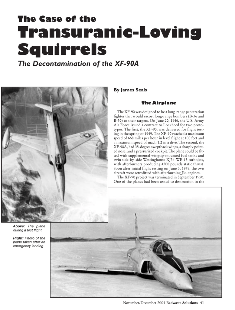 The Case of the Transuranic-Loving Squirrels The Decontamination of the XF-90A By James Seals The Airplane The XF-90 was designed to be a long-range penetration fighter that would escort long-range bombers (B-36 and B-50) to their targets. On June 20, 1946, the U.S. Army Air Force issued a contract to Lockheed for two prototypes. The first, the XF-90, was delivered for flight testing in the spring of 1949. The XF-90 reached a maximum speed of 668 miles per hour in level flight at 100 feet and a maximum speed of mach 1.2 in a dive. The second, the XF-90A, had 35-degree sweptback wings, a sharply pointed nose, and a pressurized cockpit. The plane could be fitted with supplemental wingtip-mounted fuel tanks and twin side-by-side Westinghouse XJ34-WE-15 turbojets, with afterburners producing 4200 pounds static thrust. Soon after initial flight testing on June 3, 1949, the two aircraft were retrofitted with afterburning J34 engines. The XF-90 project was terminated in September 1950. One of the planes had been tested to destruction in the Above: The plane during a test flight. Right: Photo of the plane taken after an emergency landing. November/December 2004 Radwaste Solutions 41 The tail section of the aircraft. National Advisory Committee for Aeronautics (now National Aeronautics and Space Administration) laboratory in Cleveland, Ohio. The other plane was used in aboveground nuclear testing at Frenchman’s Flat on the Nevada Test Site (NTS). The Job In November 2001, the U.S. Air Force Museum at Wright-Patterson Air Force Base contacted Fluid Tech Inc. to decontaminate the only remaining XF-90A, which was located on the NTS in Area 11, Plutonium (Pu) Valley, considered to be one of the most highly contaminated areas on the NTS. In 1957, four safety experiments for Pu dispersal had been conducted with several kilograms of Pu at ground level. The immediate ground-zero areas are high-contamination areas, approximately 300 ft in diameter, with transuranic soil concentrations ranging from 2700 to 8100 microcuries per square meter. The fuselage section, during the jet engine removal operations. The Contamination The airplane had been broken into two pieces right behind the engines, with the wing, fuselage, and engines at the center of one ground-zero area and the tail section at the center of another. The plane sections had been placed at these locations to provide realistic training for Broken Arrow (plane accident with nuclear material on board) exercises. Contaminated soil had been placed on surfaces and in openings of the plane. The XF90A had been exposed to more than 40 Squirrel debris in the fuselage. 42 Radwaste Solutions November/December 2004 The fuselage with the skin removed. Jet engine being transported to Fluid Tech’s EMAD facility. November/December 2004 Radwaste Solutions 43 Main wing assembly being cleaned. years of whirlwinds, winds, and weathering, which resulted in slight amounts of airborne contamination (femtocuries) and deposits on the plane’s surfaces. The main source of the plane’s contamination, however, was a colony of transuranic-loving, white-tailed antelope squirrels, like small chipmunks, that considered the plane to be a high-rise condominium. The squirrels had dug burrows into the contaminated soil, collected twigs and brush from the highest concentration of contamination at the base of local vegetation, and moved into the plane. Once in the plane, the squirrels, with their contaminated fur and contaminated twigs, set up housekeeping. The squirrels seemingly could penetrate a keyhole; every crack and cranny in the plane was filled with brush and was, therefore, contaminated. Tail section to be transported to EMAD. The Cleanup Tail section begins to be disassembled at EMAD. 44 Radwaste Solutions November/December 2004 Fluid Tech first stabilized the desert soils immediately surrounding the plane and the dirt roadways leading to the plane using TranSeal I, Fluid Tech’s own dust suppressant, which complies with U.S. Environmental Protection Agency and Nevada regulations. Because of the squirrels that had occupied the aircraft for 40 years and the attendant possibility of the presence of the Hanta virus, workers using a water truck and a high-pressure spray washer disinfected the plane with sodium hypo-chlorite (bleach). Every piece that left the contamination zone was pressure washed with soap and water and surveyed. Then, if necessary, pieces were pressure washed with water and sand using a pressure-washer wand, which had a venturi that pro- Cleaned and decontaminated fuselage. duced suction from the water flow, pulling sand into the high-pressure water. The sand was purchased from America Cement and Aggregate (located at the southeast boundary of the NTS). A schematic identified and showed the location of every piece of the plane before removal and listed the final contamination survey results for gamma, beta, and alpha contamination. Disassembly of the aircraft involved using the company’s all-terrain 38 000-lb-capacity crane to remove the engines and to separate the fuselage from the wings. The two engines were removed and wrapped for shipment to Fluid Tech’s Engine Maintenance and Disassembly (EMAD) facility. (Interestingly, after 50 years, the engine compressor blades still rotated freely when spun by hand. The good bearings were from different manufacturers. Good bearings!) Every rivet on the fuselage, wings, tail section, and outer skin was drilled out to the correct size for replacement with original size rivets. Drilling the rivets required an enormous quantity of drill bits and the careful selection of drill bit types (angle of tip point) and drill bit material (carbide, high speed, titanium nitride, titanium carbonitride, or aluminum nitride coated). With the outer skin removed, every piece of equipment on the wings, tail section, and fuselage was removed. This included fuel tank, hydraulic lines, electrical junction boxes, electrical wiring, 
