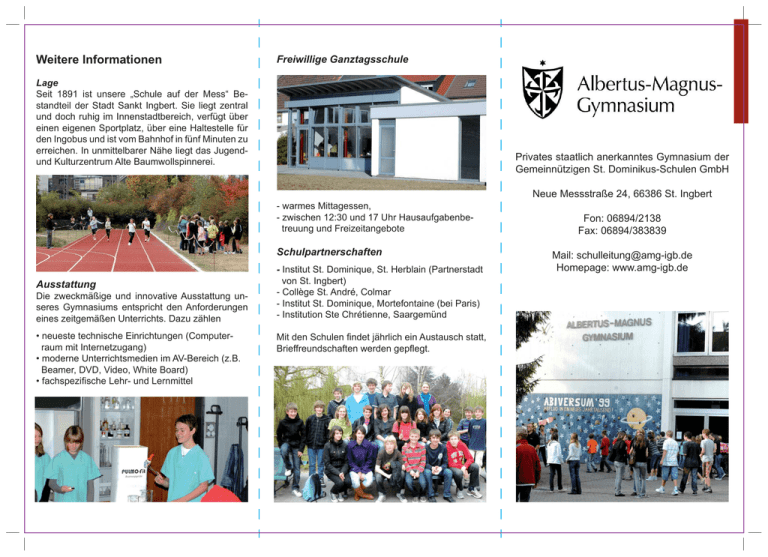 Weitere Informationen Freiwillige Ganztagsschule Lage Seit 1891 ist unsere „Schule auf der Mess“ Bestandteil der Stadt Sankt Ingbert. Sie liegt zentral und doch ruhig im Innenstadtbereich, verfügt über einen eigenen Sportplatz, über eine Haltestelle für den Ingobus und ist vom Bahnhof in fünf Minuten zu erreichen. In unmittelbarer Nähe liegt das Jugendund Kulturzentrum Alte Baumwollspinnerei. Privates staatlich anerkanntes Gymnasium der Gemeinnützigen St. Dominikus-Schulen GmbH Neue Messstraße 24, 66386 St. Ingbert - warmes Mittagessen, - zwischen 12:30 und 17 Uhr Hausaufgabenbetreuung und Freizeitangebote Schulpartnerschaften Ausstattung Die zweckmäßige und innovative Ausstattung unseres Gymnasiums entspricht den Anforderungen eines zeitgemäßen Unterrichts. Dazu zählen • neueste technische Einrichtungen (Computerraum mit Internetzugang) • moderne Unterrichtsmedien im AV-Bereich (z.B. Beamer, DVD, Video, White Board) • fachspezifische Lehr- und Lernmittel - Institut St. Dominique, St. Herblain (Partnerstadt von St. Ingbert) - Collège St. André, Colmar - Institut St. Dominique, Mortefontaine (bei Paris) - Institution Ste Chrétienne, Saargemünd Mit den Schulen findet jährlich ein Austausch statt, Brieffreundschaften werden gepflegt. Fon: 06894/2138 Fax: 06894/383839 Mail: [email protected] Homepage: www.amg-igb.de Das Albertus-Magnus-Gymnasium ist eine private Schule in Trägerschaft der Gemeinnützigen St. Dominikus-Schulen GmbH Pflege der Schulgemeinschaft durch Informationen zur Schullaufbahn Zusammenwirken von Lehrern, Eltern, Schülern z.B. Schulfeste und Schulfeiern, Projekte, Arbeitsgemeinschaften Aufnahme ist eine staatlich anerkannte Schule Zeugnisse und Prüfungen haben dieselbe Geltung wie an staatlichen Schulen. Die wissenschaftliche und pädagogische Ausbildung der Lehrerinnen und Lehrer ist die gleiche wie an staatlichen Schulen. Das AMG nimmt Mädchen und Jungen nach der vierten Klasse Grundschule auf. Voraussetzung für die Aufnahme ist die Zustimmung der Sorgeberechtigten zu den Bildungs- und Erziehungszielen unserer Schule. Über die endgültige Aufnahme entscheidet die Schule. Sprachenfolge und Profil Ab Klasse 5: Französisch Ab Klasse 6: Englisch Ab Klasse 8: Profilfach Latein oder verstärkt Naturwissenschaften (Biologie, Chemie, Physik) Angebot: bilingualer Zweig (Französisch) ist eine katholische Schule spezifische Prägung durch das Leitbild des Trägers: Bildungsarbeit wird nicht als reine Wissensvermittlung verstanden, sondern als Weg, der den jungen Menschen zur ganzheitlichen Selbstentfaltung befähigen soll. religiöse Orientierung durch Monatliche Gottesdienste Verpflichtende Teilnahme am Religionsunterricht (rk oder ev) für alle Schüler Besinnungstage und meditative Vorbereitung auf Weihnachten Aktionen für ordenseigene Missionsstationen in Ghana Betonung des sozialen Lernens Netzwerk, bestehend aus Lions-Quest (Hilfe beim Erwachsenwerden), Mediation, Schoolworkerin Oberstufe Die Oberstufe umfasst die Einführungsphase (Klasse 10) sowie die Hauptphase (Jahrgangsstufen 11 und 12). Schülerinnen und Schüler können nach der Einführungsphase das Latinum, nach Stufe 12 das Große Latinum erwerben. Ab der Einführungsphase können weitere Fremdsprachen (Spanisch oder Italienisch) belegt werden. Für die Hauptphase wählen die Schüler aus den drei Kernfächern (Deutsch, Mathematik, Fremdsprachen) zwei Erweiterungskurse und aus den übrigen Fächern ihre Grundkurse. Schüler mit mittlerem Bildungsabschluss können bei uns nach dem Besuch der Oberstufe das Abitur ablegen. Im Internet: www.amg-igb.de/Informationen