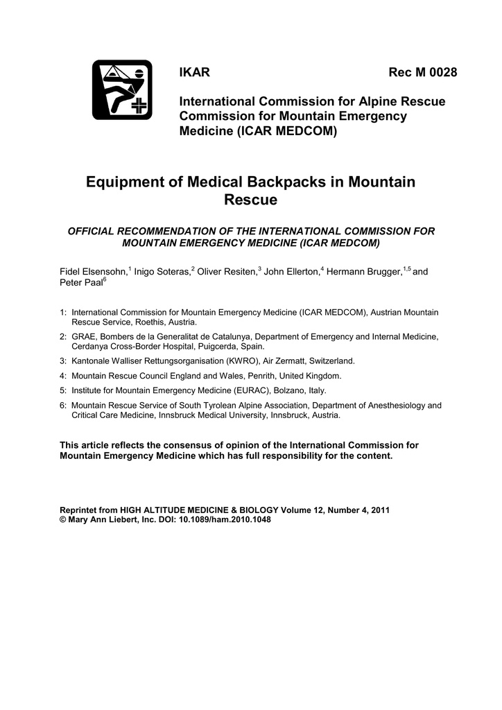 IKAR Rec M 0028 International Commission for Alpine Rescue Commission for Mountain Emergency Medicine (ICAR MEDCOM) Equipment of Medical Backpacks in Mountain Rescue OFFICIAL RECOMMENDATION OF THE INTERNATIONAL COMMISSION FOR MOUNTAIN EMERGENCY MEDICINE (ICAR MEDCOM) Fidel Elsensohn,1 Inigo Soteras,2 Oliver Resiten,3 John Ellerton,4 Hermann Brugger,1,5 and Peter Paal6 1: International Commission for Mountain Emergency Medicine (ICAR MEDCOM), Austrian Mountain Rescue Service, Roethis, Austria. 2: GRAE, Bombers de la Generalitat de Catalunya, Department of Emergency and Internal Medicine, Cerdanya Cross-Border Hospital, Puigcerda, Spain. 3: Kantonale Walliser Rettungsorganisation (KWRO), Air Zermatt, Switzerland. 4: Mountain Rescue Council England and Wales, Penrith, United Kingdom. 5: Institute for Mountain Emergency Medicine (EURAC), Bolzano, Italy. 6: Mountain Rescue Service of South Tyrolean Alpine Association, Department of Anesthesiology and Critical Care Medicine, Innsbruck Medical University, Innsbruck, Austria. This article reflects the consensus of opinion of the International Commission for Mountain Emergency Medicine which has full responsibility for the content. Reprintet from HIGH ALTITUDE MEDICINE & BIOLOGY Volume 12, Number 4, 2011 © Mary Ann Liebert, Inc. DOI: 10.1089/ham.2010.1048 HIGH ALTITUDE MEDICINE & BIOLOGY Volume 12, Number 4, 2011 ª Mary Ann Liebert, Inc. DOI: 10.1089/ham.2010.1048 Equipment of Medical Backpacks in Mountain Rescue Fidel Elsensohn,1 Inigo Soteras,2 Oliver Resiten,3 John Ellerton,4 Hermann Brugger,1,5 and Peter Paal6 Abstract Elsensohn, Fidel, Inigo Soteras, Oliver Reisten, John Ellerton, Hermann Brugger, and Peter Paal. Equipment of medical backpacks in mountain rescue. High Alt. Med. Biol. 12:343–347.—We conducted a survey of equipment in medical backpacks for mountain rescuers and mountain emergency physicians. The aim was to investigate whether there are standards for medical equipment in mountain rescue organizations associated with the International Commission for Mountain Emergency Medicine (ICAR MEDCOM). A questionnaire was completed by 18 member organizations from 14 countries. Backpacks for first responders are well equipped to manage trauma, but deficiencies in equipment to treat medical emergencies were found. Paramedic and physicians’ backpacks were well equipped to provide advanced life support and contained suitable drugs. We recommend that medical backpacks should be equipped in accordance with national laws, the medical emergencies in a given region, and take into account the climate, geography, medical training of rescuers, and funding of the organization. Automated external defibrillator provision should be improved. The effects of temperature on the drugs and equipment should be considered. Standards for training in the use and maintenance of medical tools should be enforced. First responders and physicians should only use familiar tools and drugs. Key Words: Emergency medical service; medical equipment; mountain rescue; prehospital emergency care; backpack Introduction M ountain rescue teams are trained to treat patients according to international standards (Anonymous, 2005), but treatment in remote and mountainous areas can be limited by personnel and equipment. In most situations, a medically trained mountain rescuer acts as first responder on Basic Life Support (BLS) level before an emergency physician or a paramedic will provide Advanced Life Support (ALS) treatment. The contents of a medical backpack are determined by many factors, such as national laws, funding, medical training of rescuers, common medical emergencies of a given region, and personal preference. Difficult terrain, harsh weather conditions, and long access and evacuation times require light and space-saving equipment. Backpacks are more in use now than hand-carried bags because they are more comfortable to carry and allow the rescuers’ hands to be free which is important in difficult terrain. Recently, the injury patterns of mountain casualties (Hearns, 2003), the status of mountain rescue services (Brugger et al., 2005), and medical training in mountain rescue (Elsensohn et al., 2009) have been reported. However, neither an overview, nor recommendations exist on which medical equipment should be employed in the treatment of mountain casualties. The purpose of this study was to evaluate the contents of medical backpacks designed for terrestrial missions in mountain rescue organizations associated with the International Commission for Mountain Emergency Medicine (ICAR MEDCOM) and to give recommendations regarding medical equipment. Aims and Methods A standardized questionnaire was distributed and collected in 2006 among ICAR MEDCOM representatives. This 1 International Commission for Mountain Emergency Medicine (ICAR MEDCOM), Austrian Mountain Rescue Service, Roethis, Austria. GRAE, Bombers de la Generalitat de Catalunya, Department of Emergency and Internal Medicine, Cerdanya Cross-Border Hospital, Puigcerda, Spain. 3 Kantonale Walliser Rettungsorganisation (KWRO), Air Zermatt, Switzerland. 4 Mountain Rescue Council England and Wales, Penrith, United Kingdom. 5 Institute for Mountain Emergency Medicine (EURAC), Bolzano, Italy. 6 Mountain Rescue Service of South Tyrolean Alpine Association, Department of Anesthesiology and Critical Care Medicine, Innsbruck Medical University, Innsbruck, Austria. 2 343 344 ELSENSOHN ET AL. study analyzed only the contents of medical backpacks and did not ask how frequently technical and medical devices are used. The results and recommendations were discussed among the authors, and presented at the ICAR MEDCOM meetings in Chamonix, France, in October 2008 and in Bansko, Bulgaria, in March 2009. Finally, the ICAR MEDCOM approved the recommendations in Zermatt 2009. Nominal data are given as counts (percentages). Figures were arranged with Excel 2008 (Microsoft, Seattle, WA). Results Eighteen mountain rescue organizatio
