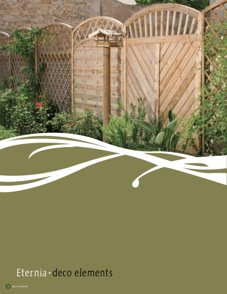 Eternia·deco elements 16 deco elements Paneles · Panneaux ..............................................................................18 Panel · Panneau Zafiro / Coral / Alhambra Panel Recto / Arco · Panneau Droit / Arche Panel Lujo · Panneau Lujo Panel · Panneau Esmeralda / Oval / Granada / Giralda Panel Topacio / Celosía · Panneau Topacio / Jalousie Panel Celosía Arco · Panneau Jalousie Arche Postes de Unión · Poteaux de Raccord Vallas · Barrières....................................................................................23 Valla Clásica · Barrière Classique Valla Arco · Barrière Arche Valla Extensible · Barrière Extensible Mini Valla · Mini Clôture Elementos de Anclaje · Platines de fixation Traviesas · Traverse ............................................................................27 Parasoles · Parasol................................................................................27 Parasol de Brezo · Parasol Bruyère Pies de Parasol · Pied de Parasol Bordos · Bordures...................................................................................28 Bordo Fijo Vertical en Arco · Bordure Fixe Arche Bordo Fijo Horizontal · Bordure Fixe Horizontal Bordo Madera · Bordure en Bois Bordo Fijo · Bordure Fixe Tarimas · Dalles......................................................................................30 Tarima Mosaico · Dalle Mosaïque Tarima Zen · Dalle Zen Tarima Lujo · Dalle Luxe Tarima Madera · Dalle Bois Postes de Madera · Poteaux en Bois........................................32 Listones de Madera · Liteaux en Bois .....................................33 deco elements 17 paneles · vallas · traviesas · parasoles · bordos · tarimas · postes · listones Eternia·deco elements Panel Zafiro Panneau Zafiro Panel Coral Panneau Coral Ref. Medidas-Dimensions Lámina-Lame Marco-Cadre 77075 160 x 90 cm. 8 x 90 mm. 45 x 90 mm. 25 u. Palé -Condt. it·Pannello Zafiro pt·Painel Zafiro pl·Panel Zafiro en·Zafiro Panel Panel Alhambra Panneau Alhambra Ref. Medidas Dimensions Lámina Lame Marco Cadre 77050 180x180 cm. 8x90 mm. 45x90 mm. 25 u. it·Pannello Alhambra pt·Painel Alhambra pl·Panel Alhambra en·Alhambra Panel 18 deco elements Palé Condt. Ref. Medidas-Dimensions Láminas-Lame Marco-Cadre 77070 160 x 90 cm. 8 x 90 mm. 45 x 40 mm. 25 u. it·Pannello Coral pt·Painel Coral pl·Panel Coral en·Coral Panel Palé -Condt. panneaux · barrières · traverse · parasol · bordures · dalles · poteaux · liteaux Panel Recto Panneau Droit Panel Arco Panel en Forme díArche Ref. Medidas-Dimensions Láminas-Lame Marco-Cadre 77001 180 x 180 cm. 6 x 60 mm. 25 x 55 mm. 30 u. it·Pannello retto pt·Painel recto pl·Panel prosty en·Straight panel Palé -Condt. Ref. Medidas-Dimensions Láminas-Lame Marco-Cadre 77002 180 x 180 cm. 6 x 60 mm. 35 x 55 mm. 25 u. Palé -Condt. it·Pannello a forma di arco pt·Painel em forma de arco pl·Panel w formie uku en·Arch-shaped panel deco elements 19 paneles · vallas · traviesas · parasoles · bordos · tarimas · postes · listones Eternia·deco elements Panel Lujo Arco Final Panneau Luxe Final en Arc Panel Lujo Arco Panneau Luxe Arc Ref. Medidas-Dimensions Láminas-Lame Marco-Cadre 77040 77042 180 x 180 cm. 90 x 180 cm. 15 x 105 mm. 15 x 105 mm. 45 x 90 mm. 20 u. 45 x 90 mm. 20 u. Palé -Condt. Panel Lujo Panneau Luxe Medidas-Dimensions Lámina-Lame Marco-Cadre 77030 77035 90 x 180 cm. 180 x 180 cm. 15 x 105 mm. 15 x 105 mm. 45 x 90 mm. 25 u. 45 x 90 mm. 25 u. Ref. Medidas-Dimensions 77031 90 x 165/150 cm. it·Pannello Lusso Finale pt·Painel Luxo Final pl·Koncowy Luksusowy Panel en·Luxury End Screen it·Pannello Lusso pt·Painel Luxo pl·Luksusowy Panel en·Luxury Screen Panel Oval Panneau Ovale Ref. Medidas-Dimensions Láminas-Lame Marco-Cadre 77080 160 x 90 cm. 15 x 105 mm. 45 x 90 mm. 25 u. Palé -Condt. it·Pannello Esmeralda pt·Painel Esmeralda pl·Panel Esmeralda en·Esmeralda Panel 20 deco elements 90 x 165/135 cm. Panel Lujo Final Panneau Luxe Final Palé -Condt. Panel Esmeralda Panneau Esmeralda Medidas-Dimensions 77033 it·Pannello Finale Lusso ad Arco pt·Painel Final Luxo em Arco pl·Koncowy Luksusowy Panel z ukiem en·Luxury End Screen, Arch it·Pannello Lusso ad Arco pt·Painel Luxo em Arco pl·Luksusowy Panel z ukiem en·Luxury Screen, Arch Ref. Ref. Ref. Medidas-Dimensions Láminas-Lame Marco-Cadre 77065 180 x 180 cm. 15 x 90 mm. 45 x 45 mm. 25 u. it·Pannello Oval pt·Painel Oval pl·Panel Ovale en·Oval Panel Palé -Condt. panneaux · barrières · traverse · parasol · bordures · dalles · poteaux · liteaux Panel Giralda Panneau Giralda Panel Granada Panneau Granada Ref. Medidas-Dimensions 77060 180 x 160 / 140 cm. 15 x 90 mm. Lámina-Lame Marco-Cadre Palé -Condt. 45 x 45 mm. 25 u. Panel Topacio Arco Panneau Topacio Arche Medidas-Dimensions Lámina-Lame 77057 180 x 150 / 120 cm. 15 x 90 mm. Marco-Cadre Palé -Condt. 45 x 45 mm. 25 u. it·Pannello Topacio Arco pt·Painel Topacio Arco pl·Panel Topacio Luk en·Arched Topacio Panel 77014 77015 77011 77010 Medidas Dimensions Lámina Lame Marco Cadre 45 x 180 cm. 60 x 180 cm. 90 x 180 cm. 180 x 180 cm. 10 x 30 mm. 45 x 45 mm. 10 x 30 mm. 45 x 45 mm. 10 x 30 mm. 30 x 30 mm. 10 x 30 mm. 45 x 45 mm. Láminas-Lame Marco-Cadre 180 x 180 cm. 15 x 90 mm. 45 x 45 mm. 25 u. Palé -Condt. Panel Topacio Recto Panneau Topacio Droit Ref. Medidas-Dimensions Lámina-Lame Marco-Cadre 77054 180 x 120 cm. 15 x 90 mm. 45 x 45 mm. 25 u. Palé -Condt. it·Pannello Topacio Retto pt·Painel Topacio Recto pl·Panel Topacio Prosty en·Straight Topacio Panel Panneau Jalousie Droit Ref. Medidas-Dimensions 77045 it·Pannello Giralda pt·Painel Giralda pl·Panel Giralda en·Giralda Panel it·Pannello Granada pt·Painel Granada pl·Panel Granada en·Granada Panel Ref. Ref. Poteaux de Raccord Cuadro Carré Palé Condt. 9 x 9 cm. 9 x 9 cm. 9 x 9 cm. 9 x 9 cm. 25 u. 25 u. 25 u. 25 u. Ref. Medidas·Dimensions 80042 80043 7 x 7 x 180 cm. 9 x 9 x 180 cm. 