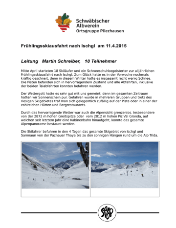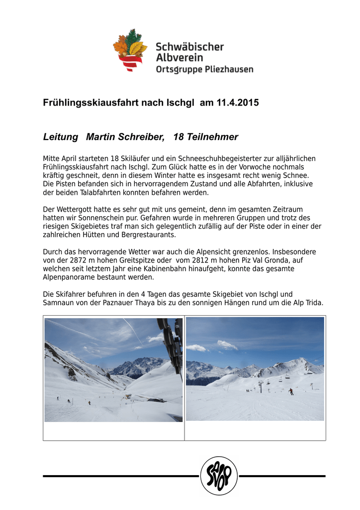 Frühlingsskiausfahrt nach Ischgl am 11.4.2015 Leitung Martin Schreiber, 18 Teilnehmer Mitte April starteten 18 Skiläufer und ein Schneeschuhbegeisterter zur alljährlichen Frühlingsskiausfahrt nach Ischgl. Zum Glück hatte es in der Vorwoche nochmals kräftig geschneit, denn in diesem Winter hatte es insgesamt recht wenig Schnee. Die Pisten befanden sich in hervorragendem Zustand und alle Abfahrten, inklusive der beiden Talabfahrten konnten befahren werden. Der Wettergott hatte es sehr gut mit uns gemeint, denn im gesamten Zeitraum hatten wir Sonnenschein pur. Gefahren wurde in mehreren Gruppen und trotz des riesigen Skigebietes traf man sich gelegentlich zufällig auf der Piste oder in einer der zahlreichen Hütten und Bergrestaurants. Durch das hervorragende Wetter war auch die Alpensicht grenzenlos. Insbesondere von der 2872 m hohen Greitspitze oder vom 2812 m hohen Piz Val Gronda, auf welchen seit letztem Jahr eine Kabinenbahn hinaufgeht, konnte das gesamte Alpenpanorame bestaunt werden. Die Skifahrer befuhren in den 4 Tagen das gesamte Skigebiet von Ischgl und Samnaun von der Paznauer Thaya bis zu den sonnigen Hängen rund um die Alp Trida. Auch das Velilltal, in welchem wir bei einer Abfahrt 17 Gemsen aus nächster Nähe beim Grasen beobachten konnten, war teilweise befahrbar, wurde jedoch des öfteren wegen Lawinengefahr gesperrt. Das Skigebiet hatte für jeden etwas zu bieten. Wer es extrem wollte, konnte die Abfahrt an der Langen Wand mit bis zu 70 % Gefälle befahren, oder vom Greitspitz die 11 km lange Abfahrt mit einem Höhenunterschied von knapp 1500 m bis ins Ortszentrum von Ischgl unter die Skier nehmen. Auch die Geselligkeit kam nicht zu kurz. So traf man sich teilweise am Nachmittag an der Paznauer Thaya, wo täglich ab 14:30 beim Apres Ski und heißer Musik die Erde bebt. Wer danach noch nicht genug hatte, setzte den Apres Ski im Kuhstall fort. Diejenigen, die es etwas ruhiger wollten, trafen sich auf der sonnigen Terrasse über dem Kuhstall, bevor es wieder zurück ins Hotel ging. Dort angekommen musste die Entscheidung getroffen werden, ob man noch einen Veneziano oder ein kühles Bier an der Bar trinkt, oder sich direkt in die Hotelsauna begibt, um die verspannte Muskulatur für den folgenden Tag wieder zu regenerieren. Die Stimmung in der Gruppe war ausgezeichnet, und der Termin für das kommende Jahr wurde sofort wieder festgelegt.