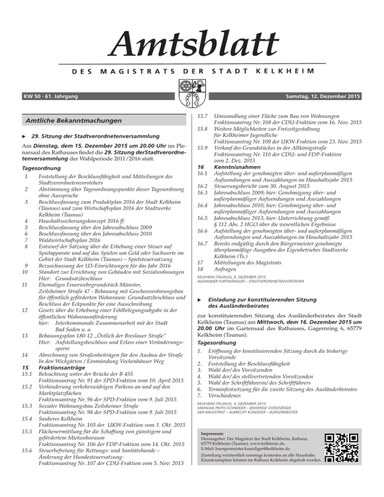KW 50 · 61. Jahrgang Amtliche Bekanntmachungen u 29. Sitzung der Stadtverordnetenversammlung Am Dienstag, dem 15. Dezember 2015 um 20.00 Uhr im Plenarsaal des Rathauses findet die 29. Sitzung derStadtverordnetenversammlung der Wahlperiode 2011/2016 statt. Tagesordnung 1Feststellung der Beschlussfähigkeit und Mitteilungen des Stadtverordnetenvorstehers 2Abstimmung über Tagesordnungspunkte dieser Tagesordnung ohne Aussprache 3Beschlussfassung zum Produktplan 2016 der Stadt Kelkheim (Taunus) und zum Wirtschaftsplan 2016 der Stadtwerke Kelkheim (Taunus) 4 Haushaltssicherungskonzept 2016 ff. 5 Beschlussfassung über den Jahresabschluss 2009 6 Beschlussfassung über den Jahresabschluss 2010 7 Waldwirtschaftsplan 2016 8Entwurf der Satzung über die Erhebung einer Steuer auf Spielapparate und auf das Spielen um Geld oder Sachwerte im Gebiet der Stadt Kelkheim (Taunus) – Spielsteuersatzung 9 Bezuschussung der U3-Einrichtungen für das Jahr 2016 10 Standort zur Errichtung von Gebäuden mit Sozialwohnungen Hier: Grundsatzbeschluss 11Ehemaliges Feuerwehrgrundstück Münster, Zeilsheimer Straße 47 - Bebauung mit Geschosswohnungsbau für öffentlich geförderten Wohnraum: Grundsatzbeschluss und Beschluss der Eckpunkte für eine Ausschreibung 12Gesetz über die Erhebung einer Fehlbelegungsabgabe in der öffentlichen Wohnraumförderung hier: Interkommunale Zusammenarbeit mit der Stadt Bad Soden u. a. 13 Bebauungsplan 180-12 „Östlich der Breslauer Straße“ Hier:Aufstellungsbeschluss und Erlass einer Veränderungssperre 14Abrechnung von Straßenbeiträgen für den Ausbau der Straße In den Wickgärten / Einmündung Vockenhäuser Weg 15Fraktionsanträge 15.1 Beleuchtung unter der Brücke der B 455 Fraktionsantrag Nr. 91 der SPD-Fraktion vom 10. April 2015 15.2Verhinderung verkehrswidrigen Parkens an und auf den Marktplatzflächen Fraktionsantrag Nr. 96 der SPD-Fraktion vom 9. Juli 2015 15.3 Sozialer Wohnungsbau Zeilsheimer Straße Fraktionsantrag Nr. 98 der SPD-Fraktion vom 9. Juli 2015 15.4 Sauberes Kelkheim Fraktionsantrag Nr. 105 der UKW-Fraktion vom 1. Okt. 2015 15.5Flächenermittlung für die Schaffung von günstigem und gefördertem Mietwohnraum Fraktionsantrag Nr. 106 der FDP-Fraktion vom 14. Okt. 2015 15.6Steuerbefreiung für Rettungs- und Sanitätshunde – Änderung der Hundesteuersatzung Fraktionsantrag Nr. 107 der CDU-Fraktion vom 5. Nov. 2015 Samstag, 12. Dezember 2015 15.7 Umwandlung einer Fläche zum Bau von Wohnungen Fraktionsantrag Nr. 108 der CDU-Fraktion vom 16. Nov. 2015 15.8Weitere Möglichkeiten zur Freizeitgestaltung für Kelkheimer Jugendliche Fraktionsantrag Nr. 109 der UKW-Fraktion vom 23. Nov. 2015 15.9 Verkauf des Grundstückes in der Altkönigstraße Fraktionsantrag Nr. 110 der CDU- und FDP-Fraktion vom 2. Dez. 2015 16Kenntnisnahmen 16.1Aufstellung der genehmigten über- und außerplanmäßigen Aufwendungen und Auszahlungen im Haushaltsjahr 2015 16.2 Steuerungsbericht zum 30. August 2015 16.3Jahresabschluss 2009; hier: Genehmigung über- und außerplanmäßiger Aufwendungen und Auszahlungen 16.4Jahresabschluss 2010; hier: Genehmigung über- und außerplanmäßiger Aufwendungen und Auszahlungen 16.5Jahresabschluss 2013, hier: Unterrichtung gemäß § 112 Abs. 2 HGO über die wesentlichen Ergebnisse 16.6Aufstellung der genehmigten über- und außerplanmäßigen Aufwendungen und Auszahlungen im Haushaltsjahr 2015 16.7Bereits endgültig durch den Bürgermeister genehmigte überplanmäßige Ausgaben des Eigenbetriebes Stadtwerke Kelkheim (Ts.) 17 Mitteilungen des Magistrats 18Anfragen KELKHEIM (TAUNUS), 8. DEZEMBER 2015 ALEXANDER FURTWÄNGLER – STADTVERORDNETENVORSTEHER u Einladung zur konstituierenden Sitzung des Ausländerbeirates zur konstituierenden Sitzung des Ausländerbeirates der Stadt Kelkheim (Taunus) am Mittwoch, dem 16. Dezember 2015 um 20.00 Uhr im Gartensaal des Rathauses, Gagernring 6, 65779 Kelkheim (Taunus). Tagesordnung 1.Eröffnung der konstituierenden Sitzung durch die bisherige Vorsitzende 2. Feststellung der Beschlussfähigkeit 3. Wahl der/ des Vorsitzenden 4. Wahl der/ des stellvertretenden Vorsitzenden 5. Wahl der Schriftführerin/ des Schriftführers 6. Terminfestsetzung für die zweite Sitzung des Ausländerbeirates 7. Verschiedenes KELKHEIM (TAUNUS), 4. DEZEMBER 2015 MAFALDA PINTO-SCHNEIDER – BISHERIGE VORSITZENDE DER MAGISTRAT – ALBRECHT KÜNDIGER – BÜRGERMEISTER Impressum: Herausgeber: Der Magistrat der Stadt Kelkheim, Rathaus, 65779 Kelkheim (Taunus), www.kelkheim.de, E-Mail: [email protected]. Zustellung wöchentlich samstags kostenlos an alle Haushalte. Einzelexemplare können im Rathaus Kelkheim abgeholt werden. uSelbsteinschlag und Verkauf von Weihnachtsbäumen 2015 Das Forstamt Königstein und die Deutsche Waldjugend bieten in diesem Jahr wieder Weihnachtsbäume an. Selbsteinschlag Hier können Sie Ihren Weihnachtsbaum selbst aussuchen und einschlagen: Parkplatz „Breiter Weg“ Kelkheim-Fischbach, an der B 455 gegenüber der Einfahrt zum Rettershof. Baumarten: Nordmanntanne, Edeltanne und Blaufichte Freitag, 18. Dezember 2015, von 13.00 bis 16.00 Uhr und Samstag, 19. Dezember 2015, von 10.00 bis 16.00 Uhr Der Malteser Hilfsdienst Fischbach und die Freiwillige Feuerwehr Fischbach bieten am Freitag und am Samstag heiße Getränke, Gulaschsuppe (Freitag) und gegrillte Würste (Samstag) an. Verkauf eingeschlagener Weihnachtsbäume Verkaufsstellen: Deutsche Waldjugend, Gimbacher Hof in Kelkheim Baumarten: Nordmanntanne und Blaufichte Samstag, 12. Dezember 2015, von 11.00 bis 16.00 Uhr und Samstag, 19. Dezember 2015, von 11.00 bis 16.00 Uhr. Forstamt Königstein, Ölmühlweg 17 in Königstein Baumarten: Blaufichte, Nobilistanne und Nordmanntanne 11. bis 21. Dezember 2015, jeweils von 9.00 bis 16.00 Uhr Sonntags kein Verkauf! FFW Mitte Minilöscher: Do., 17. 12., 17.00 Uhr, Treffen Jugendfeuerwehr: Do., 17. 12., 18.00 Uhr, Treffen Einsatzabteilung: Di., 15. 12., 19.30 Uhr, Jungfuchs-Übung FFW Hornau Einsatzabteilung: Di., 15. 12., 1