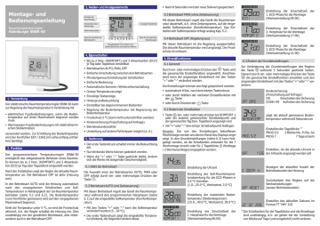 § Nach 8 Sekunden wird der neue Sollwert gespeichert. Montage- und Bedienungsanleitung Raumtemperaturregler Halmburger ERBK-50 5.3 Betriebsart MAN (ohne Zeitsteuerung) Anzeige der Wochentage 1 2 3 4 5 6 7 2 1.0 AUTO °C Temperatur bzw. Zeitanzeige Informationszeile I - + Anzeige Heizbetrieb M Taste für die Wahl der Betriebsarten Taste für die Wahl der Einstellungen Eingabetasten zum Ändern von Solltemperaturen und anderen Werten 4. Eigenschaften § Bis zu 2 Heiz- (KOMFORT) und 2 Absenkzeiten (ECO) je Tag oder Tageblock einstellbar § Betriebsarten AUTO, MAN, OFF § Einfache Umschaltung zwischen den Betriebsarten § Minutengenaue Einstellung der Schaltzeiten § Einfache Bedienung § Automatische Sommer-/Winterzeitumschaltung § Grosse Temperaturanzeige 1. Verwendung Der elektronische Raumtemperaturregler ERBK-50 kann zur Regelung der Raumtemperatur in Verbindung mit § elektrischen Fussbodenheizungen, wenn die Boden- temperatur auf einen Maximalwert begrenzt werden muss § Warmwasser-Fussbodenheizungen mit elektrothermi- schen Stellantrieben verwendet werden. Zur Ermittlung der Bodentmperatur wird der Fernfühler EEF / 33kΩ (im Lieferumfang enthalten) benötigt. 2. Funktion Der programmierbare Temperaturregler ERBK-50 ermöglicht das zeitgesteuerte Beheizen eines Raumes. Es können bis zu 2 Heiz- (KOMFORT) und 2 Absenkzeiten (ECO) je Tag oder Tagesblock eingestellt werden. Nach der Installation zeigt der Regler die aktuelle Raumtemperatur an. Die Betriebsart OFF ist aktiv (Heizung aus). In der Betriebsart AUTO wird die Heizung automatisch nach den vorgegebenen Schaltzeiten und SollTemperaturen in Abhängigkeit der Ist-Raumtemperatur betrieben (siehe 5.2 und 6.2). Die Bodentemperatur (vom Fernfühler gemessen) wird auf den vorgegebenen Maximalwert begrenzt. Sinkt die Temperatur unter 5 °C, so wird der Frostschutz aktiviert, d.h. der Regler schaltet die Heizung ein. Dies unabhängig von der gewählten Betriebsart, also insbesondere auch in der Betriebsart OFF. Mit dieser Betriebsart regelt das Gerät die Raumtemperatur dauerhaft, d.h. ohne Zeitprogramm, auf die eingestellte Solltemperatur (Komforttemperatur). Das Einstellen der Solltemperatur erfolgt analog Kap. 5.2. § Einzeilige Textanzeige § Hintergrundbeleuchtung § Einstellbar bei abgenommenem Bedienteil § Regelung der Bodentemperatur mit Begrenzung der Bodentemperatur § Frostschutz 5 °C (kann nicht unterschritten werden) § Kindersicherung (Freischaltung auf Anfrage) 5.4 Betriebsart OFF (Regelung aus) 6. Einstellfunktionen Durch ein- oder mehrmaliges Drücken der M Taste wird die gewünschte Einstellfunktion angewählt. Anschliessend kann der angezeigte Einstellwert mit den Tasten "+" oder "-" verändert werden. Die Einstellungen können wie folgt gespeichert werden: § oder durch Wählen der nächsten Einstellfunktion mit der M Taste § oder durch Drücken der I Taste 6.2 Ändern der Schaltzeiten § Taste M ein- oder mehrmals drücken bis KOMFORT 1 oder ein anderer gewünschter Schaltzeitpunkt und der gewünschte Tag bzw. Tageblock angezeigt wird Hinweis: Die von den Einstellungen betroffenen Wochentage werden am oberen Rand des Displays angezeigt. In den Grundeinstellungen (siehe 6.3) kann festgelegt werden, ob die Schaltzeiten entweder für die 7 Wochentage einzeln oder für 2 Tageblöcke (5 Werktage / 2 Wochenendtage) eingegeben werden. § Wenn die "+" oder "-" Taste gedrückt bleibt, ändern sich die Werte mit steigender Geschwindigkeit. 5.1 Wahl der Betriebsart Die Auswahl einer der Betriebsarten AUTO, MAN oder OFF erfolgt durch ein- oder mehrmaliges Drücken der Taste I . 5.2 Betriebsart AUTO (mit Zeitsteuerung) Mit dieser Betriebsart regelt das Gerät die Raumtemperatur während den programmierten Heizphasen (siehe 6.1) auf die eingestellte Solltemperatur (Komforttemperatur). § Mit den Tasten "+" oder "-" kann die Solltemperatur verändert werden (5...30 °C). § Der erste Tastendruck zeigt die eingestellte Temperatur blinkend, die folgenden ändern diese. 1 2 3 4 5 17.00 KOMFORT 2 2 1.00 ECO 2 Einstellung der Einschaltzeit der 2. Heizphase für die Werktage (Werkseinstellung 17:00) OFF SAFE Kindersicherung (Freischaltung auf Anfrage) ON Einschalten der Sicherung CODE=99 Aufheben der Sicherung 34.5 SENSORTEMp zeigt die aktuell gemessene Bodentemperatur während 8 Sekunden an PROG 5/2 Einstellen der Tageblöcke: *) PROG 5/2 2 Blöcke Mo..Fr/Sa..So PROG 7 7 Tage einzeln °C OFF 14.35 Einstellung der Uhrzeit ECO Einstellung der Soll-Raumtemperaturabsenkung für die ECO-Phasen in 0.5 °C-Schritten (1.0...25.0 °C, Werkseinst. 3.0 °C) 28.00 Sensor max Einstellung der maximalen Bodentemperatur (Bodenbegrenzer) (15.0...40.0 °C, Werkseinst. 28.0 °C) 3.0 °C 1 2 3 4 5 O6.00 KOMFORT 1 Einstellung der Einschaltzeit der 2. ECO-Phase für die Werktage (Werkseinstellung 21:00) Zur Veränderung der Grundeinstellungen des Reglers die Taste M während 5 Sekunden gedrückt halten. Danach durch ein- oder mehrmaliges Drücken der Taste M die gewünschte Einstellfunktion anwählen und den angezeigten Einstellwert mit den Tasten "+" oder "-" verändern. § automatisch 8 Sek. nach dem letzten Tastendruck § Umstellung auf andere Fühlertypen möglich (a. A.) § Nur blinkende Werte können geändert werden. Einstellung der Einschaltzeit der 1. ECO-Phase für die Werktage (Werkseinstellung 09:00) 6.3 Ändern der Grundeinstellungen 6.1 Generell § mit "+" oder "-" den entspr. Schaltzeitpunkt festlegen § Der erste Tastendruck schaltet immer die Beleuchtung ein. 09.00 ECO 1 1 2 3 4 5 Mit dieser Betriebsart ist die Regelung ausgeschaltet. Die aktuelle Raumtemperatur wird angezeigt. Der Frostschutz ist wirksam. § Betriebsstundenzähler 5. Bedienung 1 2 3 4 5 Einstellung der Einschaltzeit der 1. Heizphase für die Werktage (Werkseinstellung 06:00) zz 00234 17:25 4 3. Bedien- und Anzeigeelemente off reset 22 ’ 02 ' 2016 *) Einstellen, ob die aktuelle Uhrzeit in der Infozeile angezeigt werden soll Anzeigen der aktuellen Anzahl der Betriebsst