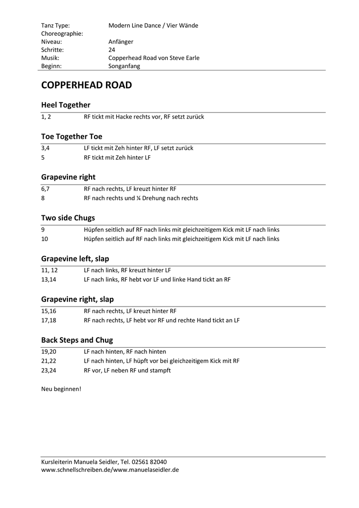 Tanz Type: Choreographie: Niveau: Schritte: Musik: Beginn: Modern Line Dance / Vier Wände Anfänger 24 Copperhead Road von Steve Earle Songanfang COPPERHEAD ROAD Heel Together 1, 2 RF tickt mit Hacke rechts vor, RF setzt zurück Toe Together Toe 3,4 5 LF tickt mit Zeh hinter RF, LF setzt zurück RF tickt mit Zeh hinter LF Grapevine right 6,7 8 RF nach rechts, LF kreuzt hinter RF RF nach rechts und ¼ Drehung nach rechts Two side Chugs 9 10 Hüpfen seitlich auf RF nach links mit gleichzeitigem Kick mit LF nach links Hüpfen seitlich auf RF nach links mit gleichzeitigem Kick mit LF nach links Grapevine left, slap 11, 12 13,14 LF nach links, RF kreuzt hinter LF LF nach links, RF hebt vor LF und linke Hand tickt an RF Grapevine right, slap 15,16 17,18 RF nach rechts, LF kreuzt hinter RF RF nach rechts, LF hebt vor RF und rechte Hand tickt an LF Back Steps and Chug 19,20 21,22 23,24 LF nach hinten, RF nach hinten LF nach hinten, LF hüpft vor bei gleichzeitigem Kick mit RF RF vor, LF neben RF und stampft Neu beginnen! Kursleiterin Manuela Seidler, Tel. 02561 82040 www.schnellschreiben.de/www.manuelaseidler.de