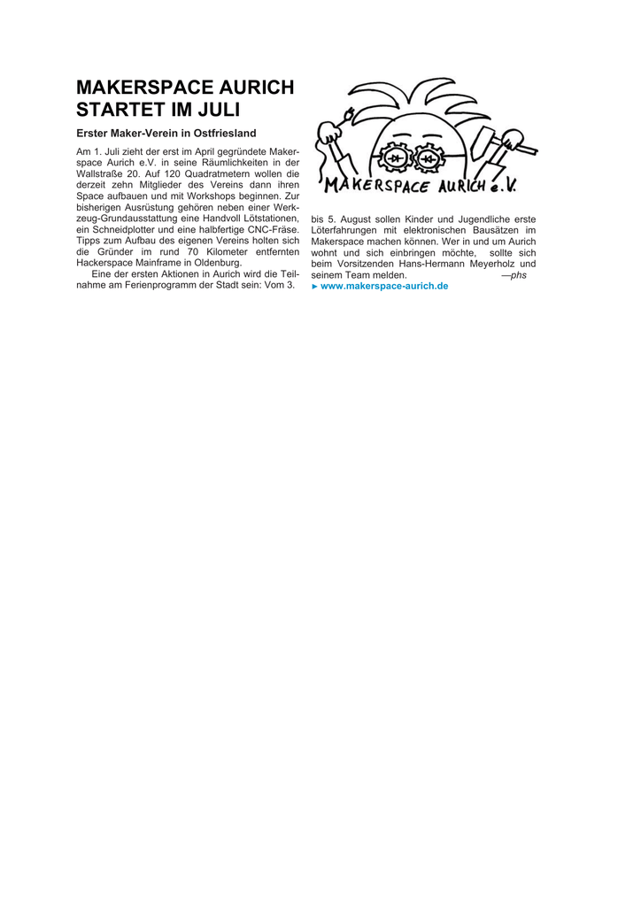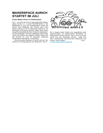 MAKERSPACE AURICH STARTET IM JULI Erster Maker-Verein in Ostfriesland Am 1. Juli zieht der erst im April gegründete Makerspace Aurich e.V. in seine Räumlichkeiten in der Wallstraße 20. Auf 120 Quadratmetern wollen die derzeit zehn Mitglieder des Vereins dann ihren Space aufbauen und mit Workshops beginnen. Zur bisherigen Ausrüstung gehören neben einer Werkzeug-Grundausstattung eine Handvoll Lötstationen, ein Schneidplotter und eine halbfertige CNC-Fräse. Tipps zum Aufbau des eigenen Vereins holten sich die Gründer im rund 70 Kilometer entfernten Hackerspace Mainframe in Oldenburg. Eine der ersten Aktionen in Aurich wird die Teilnahme am Ferienprogramm der Stadt sein: Vom 3. bis 5. August sollen Kinder und Jugendliche erste Löterfahrungen mit elektronischen Bausätzen im Makerspace machen können. Wer in und um Aurich wohnt und sich einbringen möchte, sollte sich beim Vorsitzenden Hans-Hermann Meyerholz und seinem Team melden. —phs ► www.makerspace-aurich.de