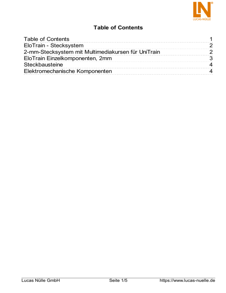 Table of Contents Table of Contents EloTrain - Stecksystem 2-mm-Stecksystem mit Multimediakursen für UniTrain EloTrain Einzelkomponenten, 2mm Steckbausteine Elektromechanische Komponenten Lucas Nülle GmbH Seite 1/5 1 2 2 3 4 4 https://www.lucas-nuelle.de EloTrain - Stecksystem Stecksysteme sind robuste, modulare Elektrotechnik-Baukastensysteme. Steckbausteine mit elektronischen Bauelementen werden auf Basisplatten zu Schaltungen zusammengesetzt und ermöglichen ein verschleißarmes Experimentieren im Grundlagenlabor zu allen Themen der Elektrotechnik, Elektronik, Elektrik. 2-mm-Stecksystem mit Multimediakursen für UniTrain 2-mm-Stecksystem mit Multimediakursen für UniTrain Das EloTrain 2-mm-Stecksystem bildet zusammen mit dem multimedialen Experimentier- und Trainingssystem UniTrain eine moderne und leistungsfähige Lernumgebung für eine fundierte Ausbildung in den Grundlagen der Elektrotechnik und Elektronik. Der Lernende wird anhand einer klar strukturierten Kurssoftware mit Hilfe von Texten, Grafiken, Animationen und Wissenstests durch die angeleiteten Experimente geführt. Die Experimente werden auf dem speziell fürs UniTrain entwickelten 2-mm-Experimenter durchgeführt. Dem Lernenden stehen verschiedenste virtuelle Instrumente zur Echtzeitmessung zur Verfügung. Die Steckbausteine enthalten passive und aktive elektronische Bauteile, deren Anschlüsse auf vergoldete 2-mmLamellensteckern kontaktiert sind. Beim Einstecken in die Steckplatte werden die Bausteine von den Lamellensteckern mechanisch gehalten. Die Lamellenstecker stellen aber gleichzeitig eine elektrische Verbindung zu den Knotenpunkten auf der Steckplatte her. Mit Kabeln oder Brückensteckern werden dann Verbindungen zu anderen Knotenpunkten, Bauteilen oder Messgeräten aufgebaut. Die normalen 2-mm-Steckbausteine gibt es in zwei unterschiedlichen Größen für zwei- und vierpolige Bauteile. Werden noch mehr Anschlüsse benötigt, so sind diese auf der Oberseite als Buchsen herausgeführt. Die Gehäuse bestehen aus zwei zusammengesetzten Kunststoffteilen. Auf dem Oberteil befindet sich ein kratzfester, kontrastreicher Siebdruck mit dem Schaltbild und der Typenbezeichnung des Bauteils. Der transparente Körper aus extrem schlagfestem und durchsichtigem Kunststoff gibt den Blick auf das Bauteil frei. Die transparente Bodenträgerplatte enthält die 2-mm-Lamellenstecker und ist mittels einer für Reparaturzwecke leicht zu öffnenden Rastverbindung mit dem Körper verbunden. Lucas Nülle GmbH Seite 2/5 https://www.lucas-nuelle.de EloTrain Einzelkomponenten, 2mm EloTrain Einzelkomponenten, 2mm Stellen Sie sich eine speziell auf Ihre Anwendungsgebiete zugeschnitte Bauteilsammlung zusammen oder wählen Sie einzelne Komponenten aus unserem umfangreichen Steckbausteinsystem aus. Umfangreiches Programm an Steckbausteinen mit passiven und aktiven Bauelementen Unterschiedliche Steckplatten für unterschiedliche Bedürfnisse Multifunktionale Stromversorgungen und Messgeräte Multimediale Kurse für das Arbeiten mit UniTrain-I Wissensvermittlung von Grundlagen bis hin zu anspruchsvollen Versuchen Trägersysteme und Aufbewahrungen Lucas Nülle GmbH Seite 3/5 https://www.lucas-nuelle.de Steckbausteine Steckbausteine Das EloTrain Stecksystem umfasst ein umfangreiches Programm an Steckbausteinen mit passiven und aktiven Bauelementen. Alle Bauelemente und Brückenstecker sind mit vergoldeten Kontakten ausgeführt. Das verhindert Oxidation und sichert einen niedrigen Übergangswiderstand über die gesamte Lebensdauer. Elektromechanische Komponenten Elektromechanische Komponenten Ausstattung bestehend aus: Pos. Bezeichnung Bestell-Nr. Anz. 1 Schalter AUS, 1-polig, Gehäuse PS2-2 PS2123-7A 1 2 Taster AN, 1-polig,Gehäuse PS2-2 PS2123-7B 1 3 Wechselschalter, 1-polig, Gehäuse PS2-2 PS2123-7G 1 Lucas Nülle GmbH Seite 4/5 https://www.lucas-nuelle.de 4 Lampe grün 6,3V, Gehäuse PS2-2 PS2123-8B 1 5 Lampe rot 6,3V, Gehäuse PS2-2 PS2123-8C 1 6 Lampe, Sockel E10, Gehäuse PS2-2 PS2123-8P 1 7 Gleichstrommotor 6V / 1W, Gehäuse PS2-3 PS2124-3L 1 8 Gleichstrommotor 12V/ 2W, Gehäuse PS2-3 PS2124-3M 1 Lucas Nülle GmbH Seite 5/5 https://www.lucas-nuelle.de