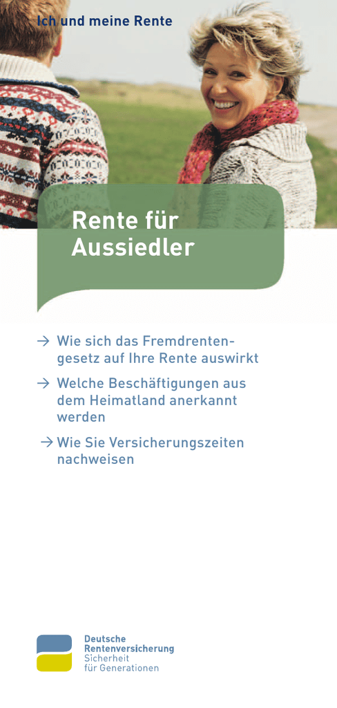 Ich und meine Rente Rente für Aussiedler > Wie sich das Fremdrenten gesetz auf Ihre Rente auswirkt > Welche Beschäftigungen aus dem Heimatland anerkannt werden > Wie Sie Versicherungszeiten nachweisen Zwei Leben - eine Rente Seit Ende des 2. Weltkriegs, vor allem aber in den vergangenen 20 Jahren, sind viele Deutschstäm mige aus den Staaten Osteuropas in die Bundesre publik zugezogen - vielleicht auch Sie. Als Aus siedler oder Vertriebener müssen Sie sich hier zulande auf völlig andere Lebensbedingungen als in Ihrer Heimat einstellen und ein neues Leben beginnen. Obwohl Sie in Deutschland möglicherweise bisher nur wenige Beiträge zur Rentenversicherung gezahlt haben, steht auch Ihnen im Alter und bei Erwerbsminderung beziehungsweise im Falle Ihres Todes der Familie eine Rente zu. Diese Rentenansprüche regelt das so genannte Fremd rentengesetz. In diesem Faltblatt erläutern wir, was das Fremd rentengesetz für Ihre Rente bedeutet. Und wenn Sie dann noch Fragen haben: Kommen Sie zu uns – wir sind für Sie da! Inhaltsverzeichnis 4 Für wen das Fremdrentengesetz gilt 6 Welche Beiträge für Ihre Rente anerkannt werden 8 Wie Ihre Beitragszeiten bewertet werden 12 Wann die Rente aus Ihrem Heimatland angerechnet wird 14 Wir informieren. Wir beraten. Wir helfen. Für wen das Fremdrenten gesetz gilt Wenn Sie als Vertriebener oder Spätaussiedler anerkannt sind, gilt das Fremdrentengesetz für Sie. Für Ihre gesetzliche Rente bedeutet dies: Ihre Versicherungszeiten aus dem Ausland werden in der deutschen Rentenversicherung berücksichtigt, als hätten Sie diese in Deutschland zurückgelegt. Folgende Voraussetzungen müssen Sie erfül len, um als Vertriebener oder Spätaussiedler anerkannt zu werden: 1. Als Vertriebener müssen Sie die Vertrei bungsgebiete (in der Regel die früheren Ostblockstaaten wie zum Beispiel Polen und die UdSSR) bis zum 31. Dezember 1992 verlassen haben. Ihr nichtdeutscher Ehepartner kann dabei auch als Vertriebe ner anerkannt werden. 2. Wenn Sie nach dem 31. Dezember 1992 nach Deutschland gezogen sind, können Sie – wenn Sie die geforderten Voraussetzungen erfüllen – als Spätaussiedler anerkannt wer 4 den. Ihr nichtdeutscher Ehegatte erhält diesen Status jedoch nicht. Für die Anerkennung als Vertriebener oder Spätaussiedler ist das örtliche Vertriebenen amt, die zentrale Stelle eines Bundeslandes oder das Bundesverwaltungsamt in Köln zuständig – je nachdem, wo Sie wohnen und wann Sie zugezogen sind. Ihr Rentenversi cherungsträger ist an diese Feststellungen der Vertriebenenbehörden gebunden. Das deutsch-polnische Rentenabkommen Haben Sie polnische Rentenversicherungs zeiten zurückgelegt und sind Sie vor dem 1. Januar 1991 nach Deutschland zuge zogen, gilt für Sie das deutsch-polnische Rentenabkommen vom 9. Oktober 1975. Die Rente für polnische Abkommenszeiten wird in entsprechender Anwendung des Fremd rentengesetzes ohne die sonst vorgeschrie bene Kürzung um 40 Prozent aus der deut schen Rentenversicherung gezahlt. In die sem Fall müssen Sie kein Vertriebener sein. Sind Sie gleichzeitig auch Vertriebener, können Ihnen – unabhängig vom Abkom men – weitere Zeiten über das Fremdren tengesetz angerechnet werden. Kehren Sie später nach Polen oder in einen anderen Staat zurück, gehen Ihnen die vom Abkom men abgeleiteten Ansprüche aber verloren. Ihr Rentenanspruch muss dann nach ande ren Vorschriften, zum Beispiel den EWGVerordnungen (Regelungen für Staaten der Europäischen Union und des Europäischen Wirtschaftsraums) neu geprüft werden. Weitere Informationen hierzu finden Sie in der Broschüre „Arbeit im Ausland – für die Rente kein Problem“. 5 Welche Beiträge für Ihre Rente anerkannt werden Nach dem Fremdrentengesetz werden Ihnen auch Rentenbeiträge, die Sie in Ihrem Herkunftsland gezahlt haben, angerechnet – und zwar dann, wenn Sie diese zu einer vergleichbaren gesetz lichen Rentenversicherung wie in Deutschland entrichtet haben und diese dort verblieben sind. Dazu gehören auch Kindererziehungszeiten sowie Grundwehr- oder Zivildienst, der nach dem 8. Mai 1945 im Herkunftsland geleistet wurde. Wurden Ihnen Beiträge für bestimm te Zeiträume erstattet, wie es zum Beispiel in Kasachstan seit 1998 möglich ist, sind diese Zeiten keine Beitragszeiten im Sinne des Fremdrentengesetzes. Auch Beschäftigungszeiten in Ihrem Heimat land, in denen keine Beiträge zur dortigen gesetzlichen Rentenversicherung gezahlt wurden, können für Ihre spätere Rente berücksichtigt werden – zum Beispiel Zeiten der Tätigkeit als Kolchosbauer in der ehemaligen UdSSR vor dem 1. Januar 1965. 6 Das gilt jedoch nur für Beschäftigungen nach Ihrem 17. Geburtstag. Ihre Dienstzeiten als Zeit- oder Berufssoldat bzw. vergleichbare Person (Polizei, Zoll usw.) werden immer als Beschäftigungszei ten angerechnet. Wurden Ihnen jedoch Beiträge erstattet, kann die Beschäftigungs zeit nicht berücksichtigt werden. Beitragsfreie Zeiten (wie zum Beispiel Schul ausbildung, Arbeitsunfähigkeit, Mutter schutz oder Arbeitslosigkeit) werden Ihnen nach dem allgemein gültigen Rentenrecht angerechnet. Hier gelten jedoch einige Besonderheiten. 7 Wie Ihre Beitragszeiten bewertet werden Für die Berechnung Ihrer Rente werden Ihre Arbeitsverdienste für jedes Kalenderjahr mit dem durchschnittlichen Einkommen aller Versicherten in Deutschland in diesem Jahr verglichen. Das Ergebnis wird in Entgeltpunkten (EP) ausgedrückt. Wie aus Entgeltpunkten Rente wird Für jedes Kalenderjahr, in dem Sie arbeiten und Rentenbeiträge zahlen, erhalten Sie eine bestimmte EP-Zahl – zum Beispiel 1,0 EP, wenn Sie genau so viel Beiträge zahlen wie ein Durchschnittsverdiener (Durch schnittsverdienst 2005 = 29 569 EUR). Ist Ihr Verdienst höher, sammeln Sie mehr EP (etwa 1,2 – wenn Ihr Verdienst und damit der gezahlte Beitrag um 20 Prozent über dem Durchschnitt liegen), bei unterdurch schnittlichem Verdienst weniger als 1,0 EP. Der von Ihnen erzielte Verdienst muss aber zunächst 