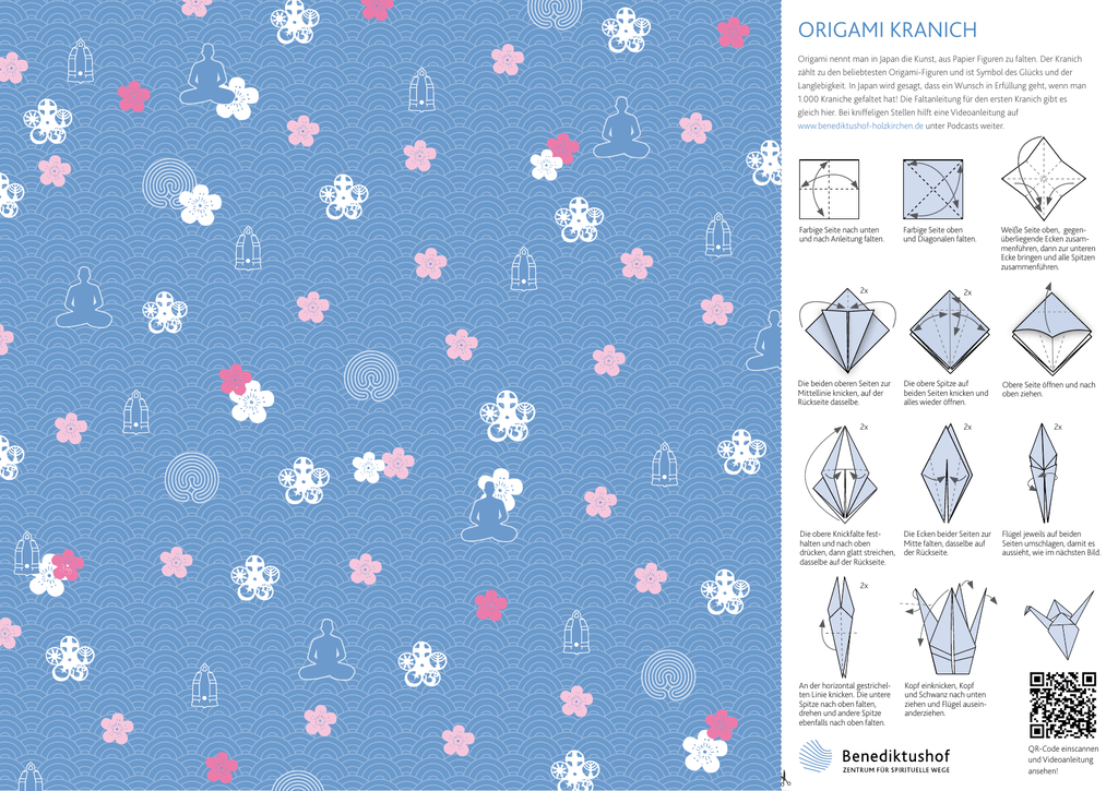 ORIGAMI KRANICH Origami nennt man in Japan die Kunst, aus Papier Figuren zu falten. Der Kranich zählt zu den beliebtesten Origami-Figuren und ist Symbol des Glücks und der Langlebigkeit. In Japan wird gesagt, dass ein Wunsch in Erfüllung geht, wenn man 1.000 Kraniche gefaltet hat! Die Faltanleitung für den ersten Kranich gibt es gleich hier. Bei kniffeligen Stellen hilft eine Videoanleitung auf www.benediktushof-holzkirchen.de unter Podcasts weiter. Farbige Seite nach unten und nach Anleitung falten. 2x Die beiden oberen Seiten zur Mittellinie knicken, auf der Rückseite dasselbe. 2x Farbige Seite oben und Diagonalen falten. Weiße Seite oben, gegenüberliegende Ecken zusammenführen, dann zur unteren Ecke bringen und alle Spitzen zusammenführen. 2x Die obere Spitze auf beiden Seiten knicken und alles wieder öffnen. 2x Die obere Knickfalte festDie Ecken beider Seiten zur halten und nach oben Mitte falten, dasselbe auf drücken, dann glatt streichen, der Rückseite. dasselbe auf der Rückseite. Obere Seite öffnen und nach oben ziehen. 2x Flügel jeweils auf beiden Seiten umschlagen, damit es aussieht, wie im nächsten Bild. 2x An der horizontal gestrichelten Linie knicken. Die untere Spitze nach oben falten, drehen und andere Spitze ebenfalls nach oben falten. Kopf einknicken, Kopf und Schwanz nach unten ziehen und Flügel auseinanderziehen. QR-Code einscannen und Videoanleitung ansehen!