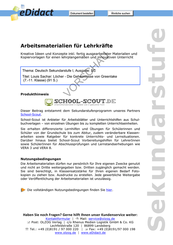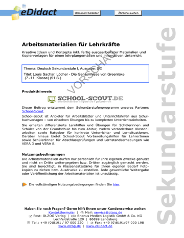 www.edidact.de/Suche/index.htm?category=102570&q=D30303SC61262 www.edidact.de/Suche/index.htm?category=102570&q=S Arbeitsmaterialien für Lehrkräfte SC H AU Kreative Ideen und Konzepte inkl. fertig ausgearbeiteter Materialien und Kopiervorlagen für einen lehrplangemäßen und innovativen Unterricht Thema: Deutsch Sekundarstufe I, Ausgabe: SC Produkthinweis VO R Titel: Louis Sachar: Löcher - Die Geheimnisse von Greenlake (7.-11. Klasse) (91 S.) Dieser Beitrag entstammt dem Sekundarstufenprogramm unseres Partners School-Scout. School-Scout ist Anbieter für Arbeitsblätter und Unterrichtshilfen aus Schulbuchverlagen – von einzelnen Übungen bis zu kompletten Unterrichtseinheiten. Sie erhalten differenzierte Lernhilfen und Übungen für Schülerinnen und Schüler von der Grundschule bis zum Abitur, zudem veränderbare Klassenarbeiten sowie Ratgeber für konkrete Unterrichts- und Lernsituationen. Darüber hinaus bietet School-Scout Vorbereitungshilfen für LehrerInnen sowie SchülerInnen für Abschlussprüfungen und Lernstandserhebungen wie VERA 3 und VERA 8. Nutzungsbedingungen Die Arbeitsmaterialien dürfen nur persönlich für Ihre eigenen Zwecke genutzt und nicht an Dritte weitergegeben bzw. Dritten zugänglich gemacht werden. Sie sind berechtigt, in Klassensatzstärke für Ihren eigenen Bedarf Fotokopien zu ziehen bzw. Ausdrucke zu erstellen. Jede gewerbliche Weitergabe oder Veröffentlichung der Arbeitsmaterialien ist unzulässig. Die vollständigen Nutzungsbedingungen finden Sie hier. Haben Sie noch Fragen? Gerne hilft Ihnen unser Kundenservice weiter: Kontaktformular Mail: [email protected] Post: OLZOG Verlag c/o Rhenus Medien Logistik GmbH & Co. KG Lechfeldstraße 120 86899 Landsberg Tel.: +49 (0)8191 / 97 000 220 Fax: +49 (0)8191/97 000 198 www.olzog.de www.eDidact.de Arbeitsmaterialien Sekundarstufe LEKTÜREN IM UNTERRICHT SC H AU LOUIS SACHAR LÖCHER VO R ALTERSGEMÄßE LITERATUR 1. Auflage 2014 Copyright School-Scout / E-Learning Academy AG 2014 Alle Rechte vorbehalten Bestell-Nr.: Hauptschule, Realschule, Gymnasium: Konzepte, Arbeitsblätter, Kopiervorlagen, Unterrichtsentwürfe (c) OLZOG Verlag GmbH Seite 1 SC H AU Arbeitsmaterialien Sekundarstufe INHALTSVERZEICHNIS Vorwort ________________________________________________________ 3 R Didaktisches Hintergrundwissen _____________________________________ 4 VO Lesebegleitende Lektürehilfen _____________________________________ 19 Lesedokumentation ____________________________________________________________ 20 II. Weiterführende Arbeitsblätter _________________________________________________ 25 Fortlaufende Interpretation _______________________________________ 31 Inhaltsübersicht _______________________________________________________________ 32 Charakterisierungen ____________________________________________________________ 32 Arbeitsblätter zur Erarbeitung des literarischen Textes _________________ 56 Spielerisches Lernen ______________________________________________ 63 Quizspiele ____________________________________________________________________ 64 Kreuzworträtsel _______________________________________________________________ 70 Prüfungswissen kompakt _________________________________________ 73 Portfolio _____________________________________________________________________ 74 Klassenarbeit ___________________________________________________ 84 Hauptschule, Realschule, Gymnasium: Konzepte, Arbeitsblätter, Kopiervorlagen, Unterrichtsentwürfe (c) OLZOG Verlag GmbH Seite 2 Arbeitsmaterialien Sekundarstufe SCHOOL-SCOUT Löcher - Vorwort Seite 3 von 91 VORWORT SC H AU Louis Sachar wurde am 20. März 1954 in East Meadow (New York) geboren. Mit neun Jahren zog er nach Kalifornien, wo er seine Schulzeit und fast seine gesamte Studienzeit verbrachte. Noch während seines Studiums nahm er einen Nebenjob an einer Grundschule an. Nach seinem Abschluss in Ökonomik entschied er aufgrund seiner Erfahrungen mit den Grundschulkindern, ein Kinderbuch zu schreiben. Neun Monate später hatte er seinen Debütroman Sc bereits fertig, der 1976 veröffentlicht wurde. Danach absolvierte Sachar ein Jurastudium, das er 1980 abschloss. Von da an arbeitete er in Teilzeit bei einer Anwaltskanzlei und schrieb nebenbei weitere Kinderbücher, bis er durch seine Werke so viel verdiente, dass er seit 1989 hauptberuflich als Schriftsteller arbeitet. In der Zwischenzeit hatte er auch eine Familie gegründet mit der er bis heute in Austin, Texas, lebt. VO R Sachar war also schon seit langer Zeit ein recht erfolgreicher Schriftsteller, als ihm mit dem Roman internationalen Kritik begeistert aufgenommen wurde. Der Roman über den Außenseiter Stan, der unberechtigt in ein Boot Camp geschickt wird und dort nicht nur einen Schatz findet, sondern auch einen seit über hundert Jahren auf seiner Familie lastenden Fluch löst, lässt drei Geschichten aus Vergangenheit und Gegenwart, die auf magische Weise alle miteinander verbunden sind, in dem Boot Camp Green Lake zusammenlaufen. Das Ergebnis ist ein modernes Märchen, das nicht nur spannend und humorvoll ist, sondern auch am Rande Themen wie Außenseitertum, (US)Rassenprobleme, Armut und die Sinnhaftigkeit von solchen Einrichtungen wie Boot Camps prestigeträchtigen National Book Award (1999) und dem Kinder- und Jugendbuchpreis LUCHS, der e LEKTÜREN IM UNTERRICHT Altersgemäße Literatur Hilfsmittel und Informationen, die Sie benötigen, um mit Ihren Schülerinnen und Schülern (SuS) altersangemessene Lektüren im Unterricht differenziert zu erarbeiten und dabei Strategien und Techniken des Lesens und Verstehens literarischer Texte zu erlernen und zu vertiefen. Didaktischer Überblick Kompetenzen Differenzierungsmöglichkeiten Ein literarisches Werk selbstorganisiert lesen und Zugänge zum Text finden Wesentliche Elemente des Textes (Figurenkonstellation/Sprachliche Gestaltung) erfassen, beschreiben und vergleichen Mit Methoden der Textanalyse Besonderheiten und Gestaltungsmittel erkennen und ihre W