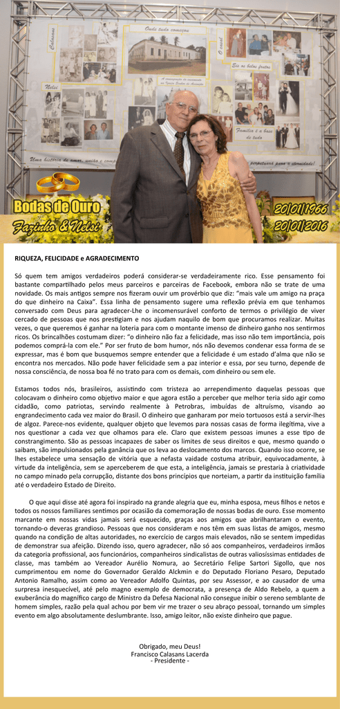 RIQUEZA, FELICIDADE e AGRADECIMENTO Só quem tem amigos verdadeiros poderá considerar-se verdadeiramente rico. Esse pensamento foi bastante compartilhado pelos meus parceiros e parceiras de Facebook, embora não se trate de uma novidade. Os mais antigos sempre nos fizeram ouvir um provérbio que diz: “mais vale um amigo na praça do que dinheiro na Caixa”. Essa linha de pensamento sugere uma reflexão prévia em que tenhamos conversado com Deus para agradecer-Lhe o incomensurável conforto de termos o privilégio de viver cercado de pessoas que nos prestigiam e nos ajudam naquilo de bom que procuramos realizar. Muitas vezes, o que queremos é ganhar na loteria para com o montante imenso de dinheiro ganho nos sentirmos ricos. Os brincalhões costumam dizer: “o dinheiro não faz a felicidade, mas isso não tem importância, pois podemos comprá-la com ele.” Por ser fruto de bom humor, nós não devemos condenar essa forma de se expressar, mas é bom que busquemos sempre entender que a felicidade é um estado d’alma que não se encontra nos mercados. Não pode haver felicidade sem a paz interior e essa, por seu turno, depende de nossa consciência, de nossa boa fé no trato para com os demais, com dinheiro ou sem ele. Estamos todos nós, brasileiros, assistindo com tristeza ao arrependimento daquelas pessoas que colocavam o dinheiro como objetivo maior e que agora estão a perceber que melhor teria sido agir como cidadão, como patriotas, servindo realmente à Petrobras, imbuídas de altruísmo, visando ao engrandecimento cada vez maior do Brasil. O dinheiro que ganharam por meio tortuosos está a servir-lhes de algoz. Parece-nos evidente, qualquer objeto que levemos para nossas casas de forma ilegítima, vive a nos questionar a cada vez que olhamos para ele. Claro que existem pessoas imunes a esse tipo de constrangimento. São as pessoas incapazes de saber os limites de seus direitos e que, mesmo quando o saibam, são impulsionados pela ganância que os leva ao deslocamento dos marcos. Quando isso ocorre, se lhes estabelece uma sensação de vitória que a nefasta vaidade costuma atribuir, equivocadamente, à virtude da inteligência, sem se aperceberem de que esta, a inteligência, jamais se prestaria à criatividade no campo minado pela corrupção, distante dos bons princípios que norteiam, a partir da instituição família até o verdadeiro Estado de Direito. O que aqui disse até agora foi inspirado na grande alegria que eu, minha esposa, meus filhos e netos e todos os nossos familiares sentimos por ocasião da comemoração de nossas bodas de ouro. Esse momento marcante em nossas vidas jamais será esquecido, graças aos amigos que abrilhantaram o evento, tornando-o deveras grandioso. Pessoas que nos consideram e nos têm em suas listas de amigos, mesmo quando na condição de altas autoridades, no exercício de cargos mais elevados, não se sentem impedidas de demonstrar sua afeição. Dizendo isso, quero agradecer, não só aos companheiros, verdadeiros irmãos da categoria profissional, aos funcionários, companheiros sindicalistas de outras valiosíssimas entidades de classe, mas também ao Vereador Aurélio Nomura, ao Secretário Felipe Sartori Sigollo, que nos cumprimentou em nome do Governador Geraldo Alckmin e do Deputado Floriano Pesaro, Deputado Antonio Ramalho, assim como ao Vereador Adolfo Quintas, por seu Assessor, e ao causador de uma surpresa inesquecível, até pelo magno exemplo de democrata, a presença de Aldo Rebelo, a quem a exuberância do magnífico cargo de Ministro da Defesa Nacional não consegue inibir o sereno semblante de homem simples, razão pela qual achou por bem vir me trazer o seu abraço pessoal, tornando um simples evento em algo absolutamente deslumbrante. Isso, amigo leitor, não existe dinheiro que pague. Obrigado, meu Deus! Francisco Calasans Lacerda - Presidente -