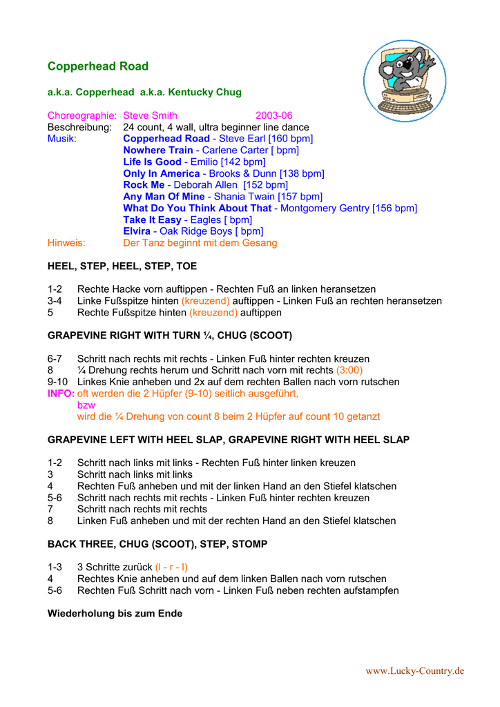 Copperhead Road a.k.a. Copperhead a.k.a. Kentucky Chug Choreographie: Steve Smith 2003-06 Beschreibung: 24 count, 4 wall, ultra beginner line dance Musik: Copperhead Road - Steve Earl [160 bpm] Nowhere Train - Carlene Carter [ bpm] Life Is Good - Emilio [142 bpm] Only In America - Brooks & Dunn [138 bpm] Rock Me - Deborah Allen [152 bpm] Any Man Of Mine - Shania Twain [157 bpm] What Do You Think About That - Montgomery Gentry [156 bpm] Take It Easy - Eagles [ bpm] Elvira - Oak Ridge Boys [ bpm] Hinweis: Der Tanz beginnt mit dem Gesang HEEL, STEP, HEEL, STEP, TOE 1-2 3-4 5 Rechte Hacke vorn auftippen - Rechten Fuß an linken heransetzen Linke Fußspitze hinten (kreuzend) auftippen - Linken Fuß an rechten heransetzen Rechte Fußspitze hinten (kreuzend) auftippen GRAPEVINE RIGHT WITH TURN ¼, CHUG (SCOOT) 6-7 Schritt nach rechts mit rechts - Linken Fuß hinter rechten kreuzen 8 ¼ Drehung rechts herum und Schritt nach vorn mit rechts (3:00) 9-10 Linkes Knie anheben und 2x auf dem rechten Ballen nach vorn rutschen INFO: oft werden die 2 Hüpfer (9-10) seitlich ausgeführt, bzw wird die ¼ Drehung von count 8 beim 2 Hüpfer auf count 10 getanzt GRAPEVINE LEFT WITH HEEL SLAP, GRAPEVINE RIGHT WITH HEEL SLAP 1-2 3 4 5-6 7 8 Schritt nach links mit links - Rechten Fuß hinter linken kreuzen Schritt nach links mit links Rechten Fuß anheben und mit der linken Hand an den Stiefel klatschen Schritt nach rechts mit rechts - Linken Fuß hinter rechten kreuzen Schritt nach rechts mit rechts Linken Fuß anheben und mit der rechten Hand an den Stiefel klatschen BACK THREE, CHUG (SCOOT), STEP, STOMP 1-3 4 5-6 3 Schritte zurück (l - r - l) Rechtes Knie anheben und auf dem linken Ballen nach vorn rutschen Rechten Fuß Schritt nach vorn - Linken Fuß neben rechten aufstampfen Wiederholung bis zum Ende www.Lucky-Country.de