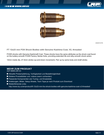 #AE91576 FT 12x23 mm FOX Shock Bodies with Genuine Kashima Coat, V2, threaded FOX® shocks with Genuine Kashima® Coat. These shocks have the same attributes as the shock coat found on the buttery-smooth FOX® Factory Series forks, providing extended life and silky-smooth shock action. 12mm inside dia, 27.5mm stroke (up-and-down movement). Pair up by same body and shaft stroke. MEHR ZUM PRODUKT AUF WWW.LRP.CC Aktuelle Preisempfehlung, Verfügbarkeit und Bestellmöglichkeit Weitere Produktbilder und -videos (wenn vorhanden) Passende Komponenten wie Tuning- und Ersatzteile Anleitungen, Bilder, Setup Sheets, Tech Tipps je nach Produkt zum Download Weiterführende Links http://www.lrp.cc/en/product/ft-12x23-mm-fox-shock-bodies-with-genuine-kashima-coat-v2-threaded/ ©2015 LRP electronic GmbH Seite 1/1