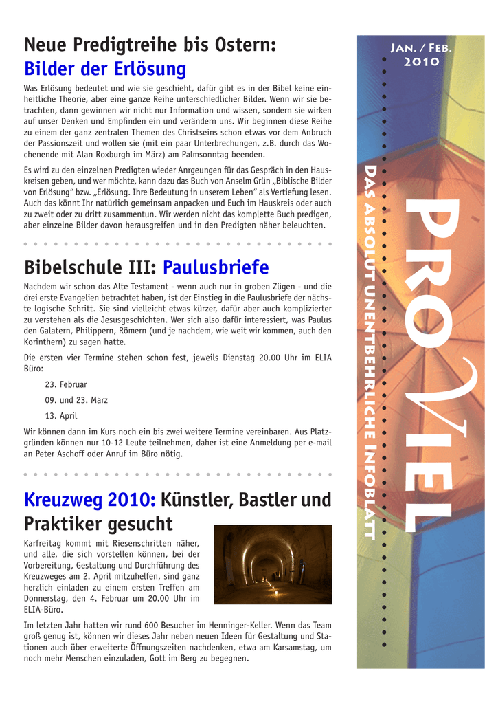 Neue Predigtreihe bis Ostern: Bilder der Erlösung Jan. / Feb. 2010 Was Erlösung bedeutet und wie sie geschieht, dafür gibt es in der Bibel keine einheitliche Theorie, aber eine ganze Reihe unterschiedlicher Bilder. Wenn wir sie betrachten, dann gewinnen wir nicht nur Information und wissen, sondern sie wirken auf unser Denken und Empfinden ein und verändern uns. Wir beginnen diese Reihe zu einem der ganz zentralen Themen des Christseins schon etwas vor dem Anbruch der Passionszeit und wollen sie (mit ein paar Unterbrechungen, z.B. durch das Wochenende mit Alan Roxburgh im März) am Palmsonntag beenden. Nachdem wir schon das Alte Testament - wenn auch nur in groben Zügen - und die drei erste Evangelien betrachtet haben, ist der Einstieg in die Paulusbriefe der nächste logische Schritt. Sie sind vielleicht etwas kürzer, dafür aber auch komplizierter zu verstehen als die Jesusgeschichten. Wer sich also dafür interessiert, was Paulus den Galatern, Philippern, Römern (und je nachdem, wie weit wir kommen, auch den Korinthern) zu sagen hatte. Die ersten vier Termine stehen schon fest, jeweils Dienstag 20.00 Uhr im ELIA Büro: 23. Februar 09. und 23. März 13. April Wir können dann im Kurs noch ein bis zwei weitere Termine vereinbaren. Aus Platzgründen können nur 10-12 Leute teilnehmen, daher ist eine Anmeldung per e-mail an Peter Aschoff oder Anruf im Büro nötig. Kreuzweg 2010: Künstler, Bastler und Praktiker gesucht Karfreitag kommt mit Riesenschritten näher, und alle, die sich vorstellen können, bei der Vorbereitung, Gestaltung und Durchführung des Kreuzweges am 2. April mitzuhelfen, sind ganz herzlich einladen zu einem ersten Treffen am Donnerstag, den 4. Februar um 20.00 Uhr im ELIA-Büro. Im letzten Jahr hatten wir rund 600 Besucher im Henninger-Keller. Wenn das Team groß genug ist, können wir dieses Jahr neben neuen Ideen für Gestaltung und Stationen auch über erweiterte Öffnungszeiten nachdenken, etwa am Karsamstag, um noch mehr Menschen einzuladen, Gott im Berg zu begegnen. ProViel Bibelschule III: Paulusbriefe Das absolut unentbehrliche Infoblatt Es wird zu den einzelnen Predigten wieder Anrgeungen für das Gespräch in den Hauskreisen geben, und wer möchte, kann dazu das Buch von Anselm Grün „Biblische Bilder von Erlösung“ bzw. „Erlösung. Ihre Bedeutung in unserem Leben“ als Vertiefung lesen. Auch das könnt Ihr natürlich gemeinsam anpacken und Euch im Hauskreis oder auch zu zweit oder zu dritt zusammentun. Wir werden nicht das komplette Buch predigen, aber einzelne Bilder davon herausgreifen und in den Predigten näher beleuchten. puls - die zweite Staffel: Sehnsucht Na c h de r ersten Staffel von puls i m Mu s e umswinkel startet am 24. Januar die zweite Staffel im Gemeindehaus am Bohlenplatz. Bis zum 21. März wird uns jeden zweiten Sonntagabend das Thema Sehnsucht begleiten. Dabei betrachten wir so verschiedene Pole wie Fernweh und Geborgenheit, Freiheit und Liebe. Wie schon bei der ersten Staffel werden sich an den Abenden Ruhephasen, kreative Impulse und interaktive Elemente abwechseln. Durch angenehmes Licht, ruhige Musik vom DJ und inspirende Bilder wollen wir wieder die besondere „puls-Atmosphäre“ schaffen, die zusammen mit den inhaltlichen Impulsen helfen soll, eigene Sehnsüchte zu spüren, über sie nachzudenken und Gottes Flüstern in uns zu spüren. Es liegen noch genügend Flyer aus, so dass ihr noch eure Nachbarn, Kollegen und Freunde, die in sich eine Sehnsucht spüren, aber Gottesdienste normalerweise meiden, gerne einladen könnt. Oder ihr legt einfach ein paar Flyer in der Kneipe um die Ecke aus … Weitere Infos findet ihr unter www. puls-erlangen.de Daniel Hufeisen Einladung zum Wochenende „Missionaler Aufbruch“ 12.-14. März Bei den letzten ELIA-Foren und vor allem beim Gemeindewochenende mit Harald Sommerfeld im Oktober haben wir viel darüber nachgedacht, wie wir unseren Glauben in und für Erlangen leben können. Dabei konnten wir im- mer wieder feststellen, dass wir auf einen sehr guten Weg sind. Trotzdem sind wir manchmal unsicher, wie wir auf die Veränderungen in der Gesellschaft reagieren sollten. Ebenso bleibt es eine Herausforderung, Veränderungsprozesse in der Gemeinde zu verstehen und auch zu begleiten. Um diese Themen soll es an dem Wochenende mit Alan Roxburgh gehen, das für uns eine Fortsetzung des Wochenendes mit Harald Sommerfeld sein könnte. Alan Roxburgh, der in Vancouver/Kanada lebt, konnte schon viele Erfahrungen mit Veränderungsprozessen in Gemeinden sammeln, sowohl als aktiver Gemeindeleiter als auch als Dozent und Berater für Gemeinden weltweit. Ihm geht es weniger um die Strukturen und konkreten Projekte, die man machen kann, als um die Kultur einer Gemeinde. Dies wird er in mehreren Referaten von Freitagabend bis Sonntagmittag in seiner gut verständlichen und inspirenden Art deutlich machen. An dem Wochenende wird aber auch viel Raum für Gespräche und Diskussion sein und das nicht nur mit ELIA-Leuten, sondern mit Leitern und Mitarbeitern aus ganz Deutschland, die in unterschiedlichen Gemeinden aktiv sind. Wir würden uns freuen, wenn wir mit möglichst vielen Leuten dabei wären, um gemeinsam weitere Inspirationen für den „missionalen Aufbruch“ in unserer Gemeinde zu bekommen. Das Wochenende verstantalten wir zusammen mit dem nehemia Team aus Fürth und Emergent Deutschland. Los geht es am Freitag um 19:00 Uhr, am Samstag um 9:30 Uhr und am Sonntag um 10:00 Uhr. Für die beiden Vormittage bemühen wir uns, Kinderbetreuung zu organisieren. Das gesamte Programm und die Infos zur Anmeldung findet ihr auf den ausliegenden Flyern und unter http:// emergent-deutschland.de/treffen/esgeht-ja-doch/. Die Abschlussveranstaltung am Sonntag wird auch ohne Anmeldung für alle offen sein. Daniel Hufeisen Gutes für Ehepaare Vom 7. bis zum 14. Februar findet hier in Erlangen wieder die „Marriage Week“ statt mit einer Fülle von Veranstaltungen, die vom Tanz- und Kochkurs über Vorträge und