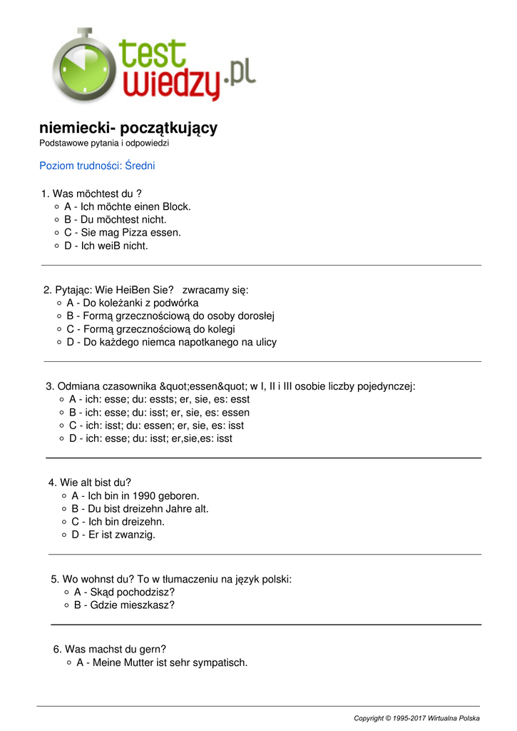 niemiecki- początkujący Podstawowe pytania i odpowiedzi Poziom trudności: Średni 1. Was möchtest du ? A - Ich möchte einen Block. B - Du möchtest nicht. C - Sie mag Pizza essen. D - Ich weiB nicht. 2. Pytając: Wie HeiBen Sie? zwracamy się: A - Do koleżanki z podwórka B - Formą grzecznościową do osoby dorosłej C - Formą grzecznościową do kolegi D - Do każdego niemca napotkanego na ulicy 3. Odmiana czasownika "essen" w I, II i III osobie liczby pojedynczej: A - ich: esse; du: essts; er, sie, es: esst B - ich: esse; du: isst; er, sie, es: essen C - ich: isst; du: essen; er, sie, es: isst D - ich: esse; du: isst; er,sie,es: isst 4. Wie alt bist du? A - Ich bin in 1990 geboren. B - Du bist dreizehn Jahre alt. C - Ich bin dreizehn. D - Er ist zwanzig. 5. Wo wohnst du? To w tłumaczeniu na język polski: A - Skąd pochodzisz? B - Gdzie mieszkasz? 6. Was machst du gern? A - Meine Mutter ist sehr sympatisch. Copyright © 1995-2017 Wirtualna Polska B - Ich tanze gern. C - Ich fahre Ski nicht. D - Danke. 7. Kommst du mit? A - Nein, ich habe keine Zeit für dich. B - Ja, ich komme aus Polen. C - Ich habe Deutsch am Montag. D - Ich weiB nicht. 8. Jak odpowiesz na pytanie:" Hast du KEINE Geschwister? ", skoro masz rodzeństwo? A - Ja, ich habe Geschwister. B - Mein Bruder ist 12. C - Nein, Ich habe keine Geschwister. D - Doch, Ich habe Geschwister. Copyright © 1995-2017 Wirtualna Polska niemiecki- początkujący Podstawowe pytania i odpowiedzi Poziom trudności: Średni Karta odpowiedzi 1. A 2. B 3. D 4. C 5. B 6. B 7. A 8. D Copyright © 1995-2017 Wirtualna Polska
