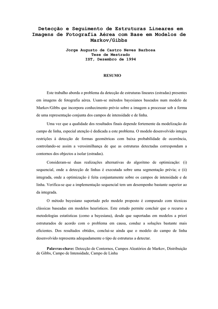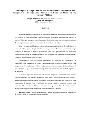 Detecção e Seguimento de Estruturas Lineares em Imagens de Fotografia Aérea com Base em Modelos de Markov/Gibbs Jorge Augusto de Castro Neves Barbosa Tese de Mestrado IST, Dezembro de 1994 RESUMO Este trabalho aborda o problema da detecção de estruturas lineares (estradas) presentes em imagens de fotografia aérea. Usam-se métodos bayesianos baseados num modelo de Markov/Gibbs que incorpora conhecimento prévio sobre a imagem a processar sob a forma de uma representação conjunta dos campos de intensidade e de linha. Uma vez que a qualidade dos resultados finais depende fortemente da modelização do campo de linha, especial atenção é dedicada a este problema. O modelo desenvolvido integra restrições à detecção de formas geométricas com baixa probabilidade de ocorrência, controlando-se assim a verosimilhança de que as estruturas detectadas correspondam a contornos dos objectos a isolar (estradas). Consideram-se duas realizações alternativas do algoritmo de optimização: (i) sequencial, onde a detecção de linhas é executada sobre uma segmentação prévia; e (ii) integrada, onde a optimização é feita conjuntamente sobre os campos de intensidade e de linha. Verifica-se que a implementação sequencial tem um desempenho bastante superior ao da integrada. O método bayesiano suportado pelo modelo proposto é comparado com técnicas clássicas baseadas em modelos heurísticos. Este estudo permite concluir que o recurso a metodologias estatísticas (como a bayesiana), desde que suportadas em modelos a priori estruturados de acordo com o problema em causa, conduz a soluções bastante mais eficientes. Dos resultados obtidos, conclui-se ainda que o modelo do campo de linha desenvolvido representa adequadamente o tipo de estruturas a detectar. Palavras-chave: Detecção de Contornos, Campos Aleatórios de Markov, Distribuição de Gibbs, Campo de Intensidade, Campo de Linha