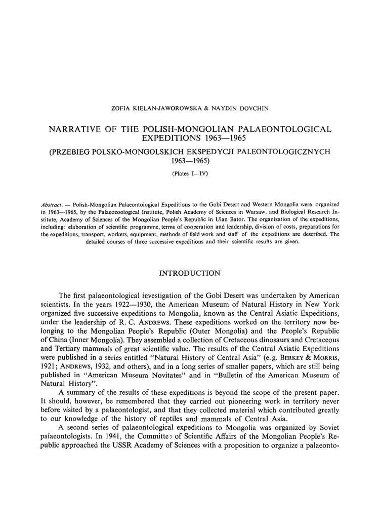 Abstract , - Polish-Mongolian Palaeontological Expeditions to the Gobi Desert and Western Mongolia were organized