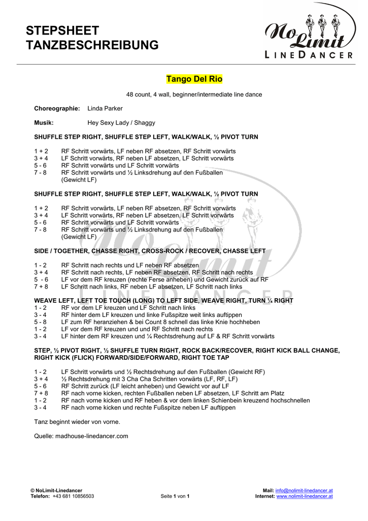 STEPSHEET TANZBESCHREIBUNG Tango Del Rio 48 count, 4 wall, beginner/intermediate line dance Choreographie: Linda Parker Musik: Hey Sexy Lady / Shaggy SHUFFLE STEP RIGHT, SHUFFLE STEP LEFT, WALK/WALK, ½ PIVOT TURN 1+2 3+4 5-6 7-8 RF Schritt vorwärts, LF neben RF absetzen, RF Schritt vorwärts LF Schritt vorwärts, RF neben LF absetzen, LF Schritt vorwärts RF Schritt vorwärts und LF Schritt vorwärts RF Schritt vorwärts und ½ Linksdrehung auf den Fußballen (Gewicht LF) SHUFFLE STEP RIGHT, SHUFFLE STEP LEFT, WALK/WALK, ½ PIVOT TURN 1+2 3+4 5-6 7-8 RF Schritt vorwärts, LF neben RF absetzen, RF Schritt vorwärts LF Schritt vorwärts, RF neben LF absetzen, LF Schritt vorwärts RF Schritt vorwärts und LF Schritt vorwärts RF Schritt vorwärts und ½ Linksdrehung auf den Fußballen (Gewicht LF) SIDE / TOGETHER, CHASSE RIGHT, CROSS-ROCK / RECOVER, CHASSE LEFT 1-2 3+4 5 -6 7+8 RF Schritt nach rechts und LF neben RF absetzen RF Schritt nach rechts, LF neben RF absetzen, RF Schritt nach rechts LF vor dem RF kreuzen (rechte Ferse anheben) und Gewicht zurück auf RF LF Schritt nach links, RF neben LF absetzen, LF Schritt nach links WEAVE LEFT, LEFT TOE TOUCH (LONG) TO LEFT SIDE, WEAVE RIGHT, TURN ¼ RIGHT 1-2 RF vor dem LF kreuzen und LF Schritt nach links 3-4 RF hinter dem LF kreuzen und linke Fußspitze weit links auftippen 5-8 LF zum RF heranziehen & bei Count 8 schnell das linke Knie hochheben 1-2 LF vor dem RF kreuzen und und RF Schritt nach rechts 3-4 LF hinter dem RF kreuzen und ¼ Rechtsdrehung auf LF & RF Schritt vorwärts STEP, ½ PIVOT RIGHT, ½ SHUFFLE TURN RIGHT, ROCK BACK/RECOVER, RIGHT KICK BALL CHANGE, RIGHT KICK (FLICK) FORWARD/SIDE/FORWARD, RIGHT TOE TAP 1-2 3+4 5-6 7+8 1-2 3-4 LF Schritt vorwärts und ½ Rechtsdrehung auf den Fußballen (Gewicht RF) ½ Rechtsdrehung mit 3 Cha Cha Schritten vorwärts (LF, RF, LF) RF Schritt zurück (LF leicht anheben) und Gewicht vor auf LF RF nach vorne kicken, rechten Fußballen neben LF absetzen, LF Schritt am Platz RF nach vorne kicken und RF heben & vor dem linken Schienbein kreuzend hochschnellen RF nach vorne kicken und rechte Fußspitze neben LF auftippen Tanz beginnt wieder von vorne. Quelle: madhouse-linedancer.com © NoLimit-Linedancer Telefon: +43 681 10856503 Seite 1 von 1 Mail: [email protected] Internet: www.nolimit-linedancer.at