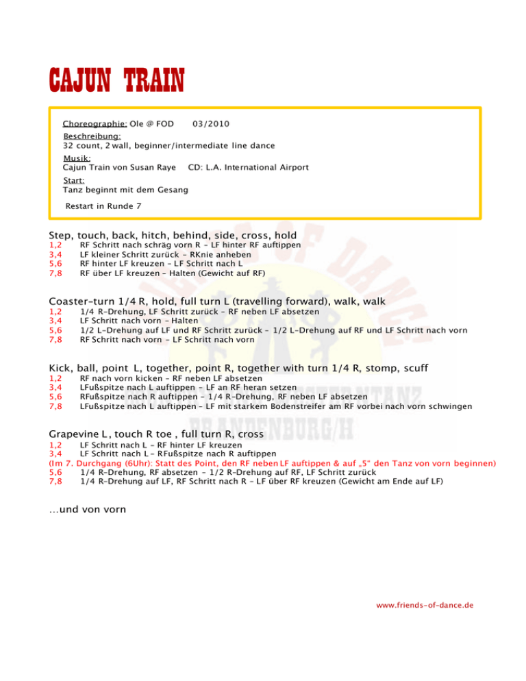 CAJUN TRAIN Choreographie: Ole @ FOD 03/2010 Beschreibung: 32 count, 2 wall, beginner/intermediate line dance Musik: Cajun Train von Susan Raye CD: L.A. International Airport Start: Tanz beginnt mit dem Gesang Restart in Runde 7 Step, touch, back, hitch, behind, side, cross, hold 1,2 3,4 5,6 7,8 RF Schritt nach schräg vorn R – LF hinter RF auftippen LF kleiner Schritt zurück – RKnie anheben RF hinter LF kreuzen – L F Schritt nach L RF über LF kreuzen – Halten (Gewicht auf RF) Coaster-turn 1/4 R, hold, full turn L (travelling forward), walk, walk 1,2 3,4 5,6 7,8 1/4 R-Drehung, LF Schritt zurück – RF neben LF absetzen LF Schritt nach vorn - Halten 1/2 L-Drehung auf LF und RF Schritt zurück – 1/2 L-Drehung auf RF und LF Schritt nach vorn RF Schritt nach vorn - LF Schritt nach vorn Kick, ball, point L, together, point R, together with turn 1/4 R, stomp, scuff 1,2 3,4 5,6 7,8 RF nach vorn kicken – RF neben LF absetzen LFußspitze nach L auftippen – LF an RF heran setzen RFußspitze nach R auftippen – 1/4 R-Drehung, RF neben LF absetzen LFußspitze nach L auftippen – LF mit starkem Bodenstreifer am RF vorbei nach vorn schwingen Grapevine L , touch R toe , full turn R, cross 1,2 LF Schritt nach L - RF hinter LF kreuzen 3,4 LF Schritt nach L - RFußspitze nach R auftippen (Im 7. Durchgang (6Uhr): Statt des Point, den RF neben LF auftippen & auf „5“ den Tanz von vorn beginnen) 5,6 1/4 R-Drehung, RF absetzen – 1/2 R-Drehung auf RF, LF Schritt zurück 7,8 1/4 R-Drehung auf LF, RF Schritt nach R - LF über RF kreuzen (Gewicht am Ende auf LF) …und von vorn www.friends-of-dance.de