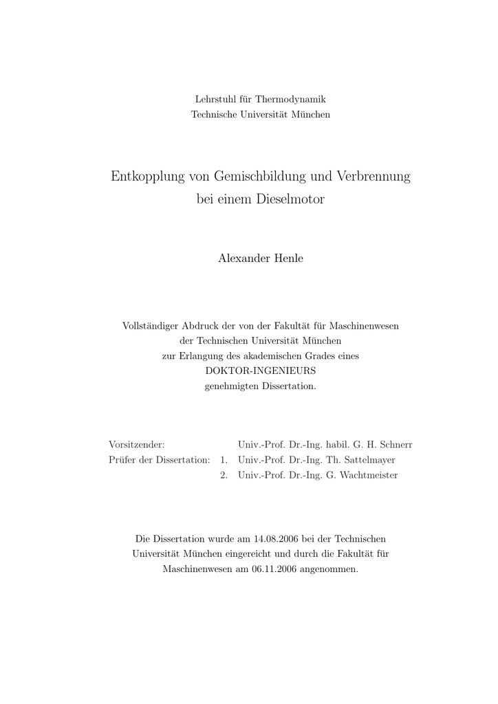 Lehrstuhl für Thermodynamik Technische Universität München Entkopplung von Gemischbildung und Verbrennung bei einem Dieselmotor Alexander Henle Vollständiger Abdruck der von der Fakultät für Maschinenwesen der Technischen Universität München zur Erlangung des akademischen Grades eines DOKTOR-INGENIEURS genehmigten Dissertation. Vorsitzender: Prüfer der Dissertation: Univ.-Prof. Dr.-Ing. habil. G. H. Schnerr 1. Univ.-Prof. Dr.-Ing. Th. Sattelmayer 2. Univ.-Prof. Dr.-Ing. G. Wachtmeister Die Dissertation wurde am 14.08.2006 bei der Technischen Universität München eingereicht und durch die Fakultät für Maschinenwesen am 06.11.2006 angenommen. i Vorwort Die vorliegende Arbeit entstand im Zeitraum von Mai 2003 bis April 2006 in der Abteilung CR/AEE im Bereich Forschung und Vorausentwicklung der Robert Bosch GmbH in Stuttgart in Zusammenarbeit mit dem Lehrstuhl für Thermodynamik der Technischen Universität München. Bei meiner Arbeit wurde ich von zahlreichen Personen tatkräftig unterstützt, wofür ich mich an dieser Stelle herzlich bedanken möchte. Mein besonderer Dank gilt Herrn Prof. Dr.-Ing. T. Sattelmayer für die wissenschaftliche Betreuung dieser Arbeit. Sein großes Interesse und seine wertvollen Anregungen haben entscheidend zum Erfolg dieser Arbeit beigetragen. Bei Herrn Prof. Dr.-Ing. G. Wachtmeister bedanke ich mich für die freundliche Übernahme des Koreferats und bei Herrn Prof. Dr.-Ing. G.H. Schnerr für den Vorsitz bei der mündlichen Prüfung. Des Weiteren danke ich allen Kollegen der Robert Bosch Forschung und Vorausentwicklung und dem Geschäftsbereich Dieselsysteme für die gute Zusammenarbeit und ihre Unterstützung. Stellvertretend für alle Kollegen der Abteilung CR/AEE gilt mein besonderer Dank Herrn Dr.-Ing. G. Bittlinger, welcher die wissenschaftliche Betreuung seitens der Firma Bosch übernahm. Aus der Abteilung CR/ARF danke ich Herrn Dipl.-Ing. A. Schülke für die engagierte Unterstützung von Seiten der Konstruktion und Herrn U. Prang von Seiten der Werkstatt. Des Weiteren möchte ich mich bei Herrn Dipl.-Ing. C. Benz und Herrn Dipl.-Ing. H. Bonath stellvertretend für den Geschäftsbereich Dieselsysteme für die gute Zusammenarbeit und ihre umfangreiche Unterstützung bedanken. Meinen Eltern und meiner Freundin Melanie danke ich für den Rückhalt und Ihre Unterstützung während der gesamten Zeit. Stuttgart, 28.April 2006 Alexander Henle ii Inhaltsverzeichnis Inhaltsverzeichnis Nomenklatur iv 1 Einführung und wissenschaftliche Problemstellung 1 2 Stand der Forschung 6 2.1 2.2 2.3 Schadstoffbildung in Verbrennungsprozessen . . . . . . . . . . . . . . . . . . . 6 2.1.1 Stickoxide . . . . . . . . . . . . . . . . . . . . . . . . . . . . . . . . . . 6 2.1.2 Ruß . . . . . . . . . . . . . . . . . . . . . . . . . . . . . . . . . . . . . 9 2.1.3 Unverbrannte Kohlenwasserstoffe (HC) . . . . . . . . . . . . . . . . . . 13 2.1.4 Kohlenmonoxid (CO) . . . . . . . . . . . . . . . . . . . . . . . . . . . . 14 Grundlagen der dieselmotorischen Gemischbildung und Verbrennung . . . . . . 15 2.2.1 Teilprozesse der Gemischbildung im Dieselmotor . . . . . . . . . . . . . 17 2.2.2 Teilprozesse der Verbrennung im Dieselmotor . . . . . . . . . . . . . . 21 2.2.3 Chemie der Zündung und Verbrennung im Dieselmotor . . . . . . . . . 26 Homogene Dieselverbrennung . . . . . . . . . . . . . . . . . . . . . . . . . . . 29 2.3.1 Grundlagen und Vorteile homogener Dieselbrennverfahren . . . . . . . 29 2.3.2 Konzepte und Verfahren homogener Dieselverbrennung . . . . . . . . . 31 2.3.3 Probleme und Herausforderungen homogener Dieselbrennverfahren . . . 35 3 Motorkonzept und Prüfstandsaufbau 37 3.1 Motorkonzept (Abgas- und Transparentmotor) . . . . . . . . . . . . . . . . . . 37 3.2 Prüfstandsaufbau und Grundmesstechnik (Transparentmotor) . . . . . . . . . 41 4 Messtechniken am Transparentmotor 46 4.1 Überblick . . . . . . . . . . . . . . . . . . . . . . . . . . . . . . . . . . . . . . 46 4.2 Messtechniken zur Analyse der Gemischbildung . . . . . . . . . . . . . . . . . 49 4.2.1 Mie-Streuung . . . . . . . . . . . . . . . . . . . . . . . . . . . . . . . . 49 4.2.2 Laserinduzierte Fluoreszenz . . . . . . . . . . . . . . . . . . . . . . . . 51 4.2.3 Kombinierte Mie-/LIF-Aufnahmetechnik - Versuchsaufbau . . . . . . . 54 Messtechniken zur Analyse der Flammenstrahlung . . . . . . . . . . . . . . . . 58 4.3 Inhaltsverzeichnis iii 4.3.1 Festkörperstrahlung leuchtender Rußpartikel (Rußeigenleuchten) . . . . 60 4.3.2 Chemilumineszenzstrahlung . . . . . . . . . . . . . . . . . . . . . . . . 62 4.3.3 Rußeigenleuchten - Versuchsaufbau und Auswertung . . . . . . . . . . 64 4.3.4 Flammenemissionsspektroskopie - Versuchsaufbau und Auswertung . . 66 5 Untersuchung homogener Betriebsstrategien am Transparentmotor 5.1 Vorbereitende Arbeiten . . . . . . . . . . . . . . . . . . . . . . . . . . . . . . . 5.1.1 5.1.3 5.2 71 Untersuchung einer teilhomogenen Betriebsweise mit Mehrfacheinspritzung . . . . . . . . . . . . . . . . . . . . . . . . . . . . . . . . . . . . . 75 Schlussfolgerungen für die weitere Arbeit . . . . . . . . . . . . . . . . . 78 Variation der Einspritzung und Abgasrückführung bei 4 bar indiziertem Mitteldruck . . . . . . . . . . . . . . . . . . . . . . . . . . . 80 5.2.1 Darstellung der Betriebspunkte und Emissionen . . . . . . . . . . . . . 80 5.2.2 Untersuchung der Gemischbildung . . . . . . . . . . . . . . . . . . . . . 84 5.2.3 Untersuchung der Verbrennung mit zyklusaufgelöster Flammenemissionsspektroskopie . . . . . . . . . . . . . . . . . . . . . . . . . . . . . 5.3 71 Untersuchung eines konventionellen Betriebspunktes mit einer Variation der Düsenkonfiguration . . . . . . . . . . . . . . . . . . . . . . . . . . . 5.1.2 71 98 5.2.4 Untersuchung der Festkörperstrahlung leuchtender Rußpartikel . . . . . 125 5.2.5 Zusammenfassung der Ergebnisse . . . . . . . . . . . . . . . . . . . . . 137 Variation der Einspritzung und Abgasrückführung bei 6 bar indiziertem Mittel
