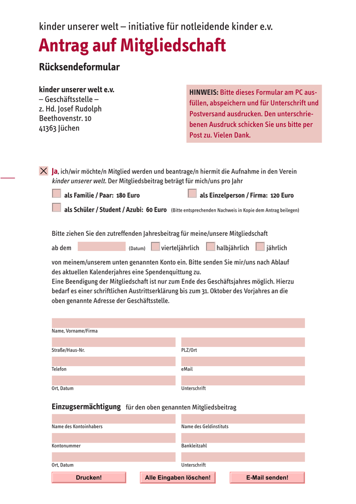 kinder unserer welt – initiative für notleidende kinder e.v. Antrag auf Mitgliedschaft Rücksendeformular kinder unserer welt e.v. – Geschäftsstelle – z. Hd. Josef Rudolph Beethovenstr. 10 41363 Jüchen HINWEIS: Bitte dieses Formular am PC ausfüllen, abspeichern und für Unterschrift und Postversand ausdrucken. Den unterschriebenen Ausdruck schicken Sie uns bitte per Post zu. Vielen Dank. Ja, ich/wir möchte/n Mitglied werden und beantrage/n hiermit die Aufnahme in den Verein kinder unserer welt . Der Mitgliedsbeitrag beträgt für mich/uns pro Jahr als Familie / Paar: 180 Euro als Einzelperson / Firma: 120 Euro als Schüler / Student / Azubi: 60 Euro (Bitte entsprechenden Nachweis in Kopie dem Antrag beilegen) Bitte ziehen Sie den zutreffenden Jahresbeitrag für meine/unsere Mitgliedschaft ab dem (Datum) vierteljährlich halbjährlich jährlich von meinem/unserem unten genannten Konto ein. Bitte senden Sie mir/uns nach Ablauf des aktuellen Kalenderjahres eine Spendenquittung zu. Eine Beendigung der Mitgliedschaft ist nur zum Ende des Geschäftsjahres möglich. Hierzu bedarf es einer schriftlichen Austrittserklärung bis zum 31. Oktober des Vorjahres an die oben genannte Adresse der Geschäftsstelle. Name, Vorname/Firma Straße/Haus-Nr. PLZ/Ort Telefon eMail Ort, Datum Unterschrift Einzugsermächtigung für den oben genannten Mitgliedsbeitrag Name des Kontoinhabers Name des Geldinstituts Kontonummer Bankleitzahl Ort, Datum Unterschrift Drucken! Alle Eingaben löschen! E-Mail senden!