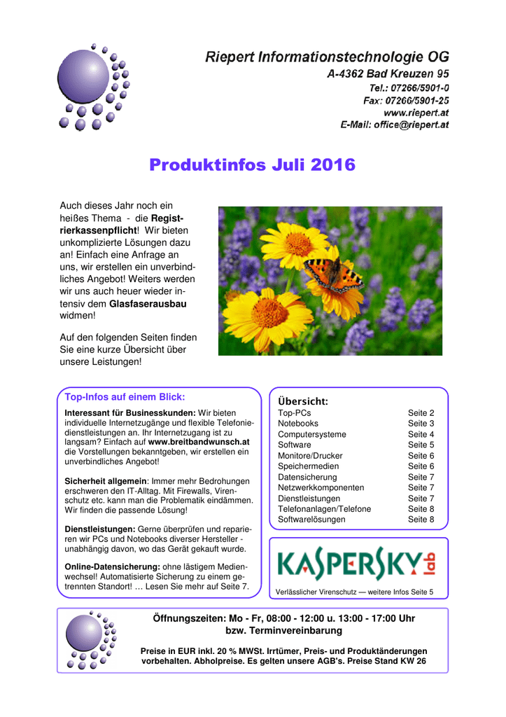 Produktinfos Juli 2016 Auch dieses Jahr noch ein heißes Thema - die Registrierkassenpflicht! Wir bieten unkomplizierte Lösungen dazu an! Einfach eine Anfrage an uns, wir erstellen ein unverbindliches Angebot! Weiters werden wir uns auch heuer wieder intensiv dem Glasfaserausbau widmen! Auf den folgenden Seiten finden Sie eine kurze Übersicht über unsere Leistungen! Top-Infos auf einem Blick: Interessant für Businesskunden: Wir bieten individuelle Internetzugänge und flexible Telefoniedienstleistungen an. Ihr Internetzugang ist zu langsam? Einfach auf www.breitbandwunsch.at die Vorstellungen bekanntgeben, wir erstellen ein unverbindliches Angebot! Sicherheit allgemein: Immer mehr Bedrohungen erschweren den IT-Alltag. Mit Firewalls, Virenschutz etc. kann man die Problematik eindämmen. Wir finden die passende Lösung! Übersicht: Top-PCs Notebooks Computersysteme Software Monitore/Drucker Speichermedien Datensicherung Netzwerkkomponenten Dienstleistungen Telefonanlagen/Telefone Softwarelösungen Seite 2 Seite 3 Seite 4 Seite 5 Seite 6 Seite 6 Seite 7 Seite 7 Seite 7 Seite 8 Seite 8 Dienstleistungen: Gerne überprüfen und reparieren wir PCs und Notebooks diverser Hersteller unabhängig davon, wo das Gerät gekauft wurde. Online-Datensicherung: ohne lästigem Medienwechsel! Automatisierte Sicherung zu einem getrennten Standort! … Lesen Sie mehr auf Seite 7. Verlässlicher Virenschutz — weitere Infos Seite 5 Öffnungszeiten: Mo - Fr, 08:00 - 12:00 u. 13:00 - 17:00 Uhr bzw. Terminvereinbarung Preise in EUR inkl. 20 % MWSt. Irrtümer, Preis- und Produktänderungen vorbehalten. Abholpreise. Es gelten unsere AGB's. Preise Stand KW 26 Top PCs www.riepert.at Seite 2 Neue Geräte bieten viele Vorteile: höhere Produktivität, geringere Energiekosten, bessere Sicherheitsfunktionen sowie gesteigerte Zufriedenheit. Wir stellen hier einen leistungsstarken Mini-PC vor, sowie einen günstigen PC fürs „Home-Office“: Shuttle Mini PC Intel i7 Platzsparender Mini-PC für die höchsten Ansprüche! Leistungsstarker Intel i7-Prozessor und super schneller SSD-Speicherplatz für höchst effizientes Arbeiten! Technische Daten: Shuttle XPC Mini-PC, X79 Chipsatz, Netzteil mit 500 Watt Intel i7-4820K Prozessor 3,7 GHz/ 10 MB 8 GB DDR3 DIMM 1333 Mhz SAMSUNG 120 GB SSD 6 Gb/sec. 2.5“ SATA3 Speicherpatz Liteon DVD-RW-Laufwerk Geforce GT610, 1024 MB DDR3 Grafik 1 Jahr Garantie (Art. A17/319) Preis: EUR 916,00 netto/1.099,00 EUR brutto PC-Angebot fürs „Home-Office“ HP Pavilion 550-109ng weiß Mini-Tower PC, Intel Core i5 Prozessor der sechsten Generation, Modell 6400, 2,7 GHz Prozessor, 8 GB Arbeitsspeicher, DDR3, 1 TB Festplatte, 7.200 Umdrehungen/ Minute, SATA, AMD-Grafik Radeon R5 330, DVD-Brenner, Soundkarte Onboard, 4 x USB 3.0, 2 x USB 2.0, HDMI Betriebssystem Windows 10, 64 Bit, P3J43EA#A nur EUR 659,00 inkl MWSt. Notebooks www.riepert.at Seite 3 Business-Geräte Lenovo Notebook 15,6“ E51-80 i5 15,6 Zoll, 8 GB Arbeitsspeicher, 1000 GB HDD, Intel i5-6200U, DVD-RW , Cam, AMD Radeon R5 M330 W7pro/Win10 pro EUR 729, 00 inkl. / EUR 607,50 exkl. 80QB005NGE Lenovo E51-80 i5-6200U 15,6" Display (blendfrei), Intel i5 6200U, 2,3 GHz 4GB RAM, 500 GB SSHD, Intel HD Graphics 520, DVD +/- RW, WLAN, Windows 7 Pro /Win 10Pro Coupon, 1 Jahr Herstellergarantie EUR 499,17 exkl. MWSt. / EUR 599,00 inkl. MWSt. 26174 Home-Notebooks: ASUS F555UJ-XX073T Intel Ci5-6200U 39,6 cm 15,6 Zoll 1386 x 900 glare Display 8 GB Arbeitsspeicher, 500 GB Festplatte NVIDIA GeForce 920M, 2.048 MB Grafikspeicher DVDRW - Windows 10 Herstellergarantie 24 Monate EUR 599— inkl. / EUR 499,17 exkl. Art. 26061 HP G350 G2 Notebook 15,6“ Notebook, 39,6 cm Bildschirm, 15,6 Zoll,, LED-Backlight, Auflösung: 1366 x 768, Intel Core i5 Prozessor der fünften Generation, Modell 5200U, 4 GB Arbeitsspeicher, 500 GB Festplatte, DVD-Brenner, integrierte Webcam, Tastatur mit integriertem Nummernblock, Cardreader, Bluetooth 4.0, W7Pro64/W10Pro64 Garantie 12 Monate EUR 569,00 inkl. / EUR 474,17 exkl. Art. 25408 Weitere Modelle kurzfristig verfügbar - einfach eine Anfrage an [email protected]! www.riepert.at Computersysteme Seite 4 Business-Geräte Fujitsu Esprimo P556 Intel i3 Fujitsu Esprimo P556/Intel i5 Microtower Intel Pentium i3-6100 / 3,7 GHz 48GB Arbeitsspeicher HDD 1000 GB DVD/RW Sound und LAN on board HD Graphics Win-Tastatur, Optische Maus Windows 10 Pro Lizenz, Win 7 vorinstalliert. 1 Jahr Bring In Garantie Microtower Fujitsu ESPRIMO P556 Micro Tower 1 x Core i5 6400/ 2,7 GHz RAM 4 GB, HDD 500 GB DVD SuperMulti HD Graphics 530 - GigE Windows 10 Pro 64-Bit - vorinstalliert Windows 7 - inkl. Maus/ Tastatur. 36 Monate Bring in Garantie. EUR 599,00 inkl. EUR 499,17 exkl. EUR 639,00 inkl. EUR 532,50 exkl. Art. 26171 Art. 25625 HP All-in-one PC All-in-one-PC-System: Kompaktes Design für eine besonders geringe Stellfläche, stromsparend. HP ProOne 400 G1 AiO Komplettlösung, 58,4 cm 23“ Display (kein Touchscreen), Intel Core i3 4160T/ 3.1 GHz , 4 GB Arbeitsspeicher, 1 TB Festplatte, Windows 7 Pro/Windows 10 Pro 64 bit, Schnittstellen: 2 x USB 3.0, 4 x USB 2.0 ,1 x serial , 1 x Mikrofon, 1 x Kopfhörer , 1 x Audio-Ausgang, 1 x LAN (Gigabit Ethernet), 1 x DisplayPort, WLAN, Bluetooth. Abmessungen B x T x H 55.79 cm x 8.16 cm x 40.26 cm Art. 25407 EUR 879,00 inkl. / EUR 732,50 exkl. All-in-one PC - ACER Veriton All-in-one-PC-System mit Touchscreen: Kompaktes Design für eine besonders geringe Stellfläche, stromsparend. ACER Veriton Z2660G, All-in-One-PC, 49,5 cm 19.5“ Display Touch, Intel Core i5-4570T 2.9 GHz, 4 GB Hauptspeicher, 1 TB Festplatte, DVD-RW, Intel HD Graphics, Win 7 Pro/Win 8 Pro 64 bit. Schnittstellen: 2 x USB 3.0, 2 x USB 2.0, WLAN IEEE 802.11 a/b/g/n, RJ45 LAN, je 1 x Audio in/out, Abmessungen: HxBxT: 490x330x60 mm EUR 1.099,00 inkl. / EUR 915,00 exkl. Art. 25467 Shuttle Barebone - 15.6“ Touch-PC Touch-PC mit flexibler Leistung und Top-Performance. Kompaktes Design für eine besonders geringe Stellfläche, stromsparend und 