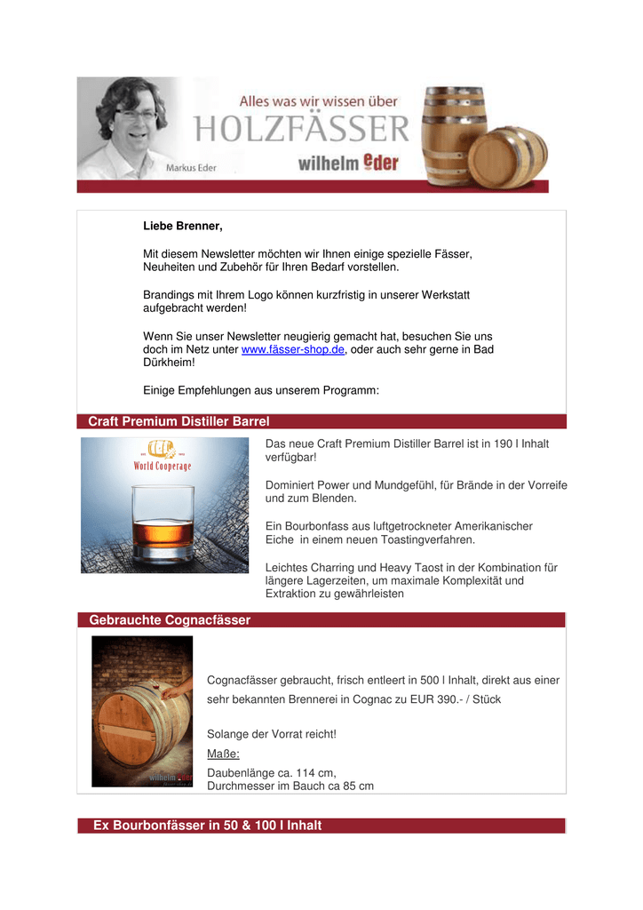 Liebe Brenner, Mit diesem Newsletter möchten wir Ihnen einige spezielle Fässer, Neuheiten und Zubehör für Ihren Bedarf vorstellen. Brandings mit Ihrem Logo können kurzfristig in unserer Werkstatt aufgebracht werden! Wenn Sie unser Newsletter neugierig gemacht hat, besuchen Sie uns doch im Netz unter www.fässer-shop.de, oder auch sehr gerne in Bad Dürkheim! Einige Empfehlungen aus unserem Programm: Craft Premium Distiller Barrel Das neue Craft Premium Distiller Barrel ist in 190 l Inhalt verfügbar! Dominiert Power und Mundgefühl, für Brände in der Vorreife und zum Blenden. Ein Bourbonfass aus luftgetrockneter Amerikanischer Eiche in einem neuen Toastingverfahren. Leichtes Charring und Heavy Taost in der Kombination für längere Lagerzeiten, um maximale Komplexität und Extraktion zu gewährleisten Gebrauchte Cognacfässer Cognacfässer gebraucht, frisch entleert in 500 l Inhalt, direkt aus einer sehr bekannten Brennerei in Cognac zu EUR 390.- / Stück Solange der Vorrat reicht! Maße: Daubenlänge ca. 114 cm, Durchmesser im Bauch ca 85 cm Ex Bourbonfässer in 50 & 100 l Inhalt Neu bei uns im Programm, aus Original Bourbon Fassdauben hergestellte Fässer zur Reifung Ihrer Destillate auch bei etwas kleineren Mengen! Fässer sind innen nicht mehr gecharrt. Die Idee ist die Weitergabe der Bourbon- (Nuss und Vanille) Aromen! Volume Boost Tannin - Sonderaktion Volume Boost Tannin, zur Abrundung und dem Finishen Ihrer Destillate mit Mundgefühl & Volumen! Whisky, Rum und Holzfassgelagerte Brände werden noch einen „Tick“ harmonischer und farbintensiver! http://www.faesser-shop.de/tru-tan-2.html bestellen Sie bis zum 15.08.2013 und erhalten Sie 20 % Rabatt auf diesen Artikel Tontöpfe 60 l und 180 l Neu bei uns: Tontöpfe zur Reifung Ihrer Destillate mit einer sehr feinen Mikrooxygenierung ohne den Einfluss von Holz, besonders im Reifeprozess von Obstbränden! http://www.faesser-shop.de/tonkruge-zurdestillatlagerung.html Cocktail-Reifefässer 5 – 50 l Partizipieren Sie am neuen Trend! Zur Cocktailreifung in Bars bieten wir kleine Fässer aus Sherry, Cognac, Rum, Whisky und weiteren Belegungen in den Größen von 3 l, 5 l und 10 l an. Die Fässchen sind ausgestattet mit Bock, Spund und als Option mit einem Zapfhahn sowie Laserbranding! http://www.faesser-shop.de/holzfaesser/faesser-zurwiederbelegung-2.html http://www.faesser-shop.de/laserbranding- 1/laserbranding.html Diese Fässer kommen auch bei der First German Cocktail Aging Challenge zum Einsatz! Mehr Info’s unter www.cocktailaging.de Regal aus original Bourbonfass Regal aus einem Original Bourbonfass 190 l gefertigt! Das Fass ist schwarz mattiert und mit dem Branding einer bekannten schottischen Destille versehen! Ein schönes, emotionales Geschenk mit dem Flair des "Alten und Traditionellen" Preis €335 + MwSt. Gerne produzieren wir das Regal auch nach Ihren Vorgaben! Impressum Verantwortlich für den Inhalt dieses Newsletters: Wilhelm Eder Holzreifefässer/Kellereibedarf: Markus Eder, Bruchstr. 60, 67098 Bad Dürkheim Tel.: 0049 (0)6322 95598 0 Fax: 0049 (0)6322 95598 29 E-Mail: [email protected] www.wilhelm-eder.de Haftungsausschluss Wilhelm Eder ist mit Sorgfalt darum bemüht, in diesem Newsletter korrekte und vollständige Informationen zur Verfügung zu stellen. Es übernimmt jedoch keine Haftung oder Garantie für die Aktualität, Richtigkeit und Vollständigkeit der bereitgestellten Informationen. Haftungsansprüche gegenüber Wilhelm Eder, die durch die Nutzung der bereitgestellten Informationen verursacht werden, sind grundsätzlich ausgeschlossen. Wilhelm Eder hat keinerlei Einfluss auf die Inhalte der Internetseiten, auf die durch Hyperlink verwiesen wird. Wilhelm Eder ist für den Inhalt dieser Seiten nicht verantwortlich, macht sich deren Inhalte nicht zueigen und übernimmt für diese keinerlei Haftung. Dieser Newsletter darf weiter versendet werden. Anregung und Kritik Deine Meinung zu unserem Newsletter interessiert uns: schick uns eine Email Abmeldung vom Newsletter Schick uns eine E-Mail mit dem Betreff "Newsletterabmeldung".