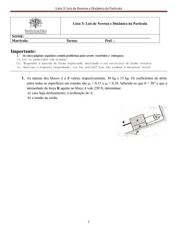 Lista 3: Leis de Newton e Dinâmica da Partícula Lista 3: Leis de Newton e Dinâmica da Partícula NOME:______________________________________________________________________ Matrícula: Turma: Prof. : Importante: i. As cinco páginas seguintes contém problemas para serem resolvidos e entregues. ii. Ler os enunciados com atenção. iii. Responder a questão de forma organizada, mostrando o seu raciocínio de forma coerente. iv. Analisar a resposta respondendo: ela faz sentido? Isso lhe ajudará a encontrar erros! 1. As massas dos blocos A e B valem, respectivamente, 30 kg e 15 kg. Os coeficientes de atrito entre todas as superfícies em contato são μe = 0,15 e μc = 0,10. Sabendo-se que = 30° e que a intensidade da força R agente no bloco A vale 250 N, determinar: a) caso haja deslizamento, a aceleração de A; b) a tensão na corda. 1 Lista 3: Leis de Newton e Dinâmica da Partícula 2. Um carro está subindo um trecho em aclive de 2%, a uma velocidade constante de 88,5 km/h. Se o motorista não mudar de marcha, nem modificar a pressão de seu pé no acelerador, qual deverá ser a aceleração do carro no trecho em declive de 3%? . 2 Lista 3: Leis de Newton e Dinâmica da Partícula 3. Um estudante do curso de engenharia, cansado e sobrecarregado, tenta manter um livro de física preso com seu braço, como mostra a figura. O livro tem uma massa de 3,2 kg, o coeficiente de atrito estático entre o livro e o antebraço do estudante é e = 0,32 e o coeficiente de atrito estático entre o livro e a camisa do estudante é e = 0,16. Qual é a força horizontal mínima que o estudante deve aplicar ao livro para evitar que ele caia? Utilize g = 9,81 m/s². 3 Lista 3: Leis de Newton e Dinâmica da Partícula 4. Um bloco encontra-se em movimento com velocidade constante em módulo numa estrada reta que atravessa uma região onde há uma pequena colina, C, e uma pequena depressão, D. Considere que ambas tem 250m de raio, conforme indicado na figura abaixo, que mostra um corte vertical da estrada. a) Se no instante em que o carro passar no topo da colina o módulo da força normal sobre ele valer metade do seu peso, que é igual a 1,50 x104 N, qual será a força normal sobre o carro no instante em que ele estiver passando na parte mais baixa da depressão? b) Qual o valor crítico da velocidade a partir da qual o carro perde contato com a estrada no topo da colina? c) Se o carro estiver se movendo com a velocidade do item (b), qual será a força normal sobre o carro no instante em que ele estiver passando na parte mais baixa da depressão? d) Esboce qualitativamente a trajetória do carro, no caso em que sua velocidade ao passar pelo topo da colina é maior que o valor crítico obtido no item b. Obs. Nas soluções dos itens a, b e c, indique o diagrama de forças sobre o carro! 4 Lista 3: Leis de Newton e Dinâmica da Partícula 5. (a) Uma autoestrada foi projetada para suportar um tráfego com velocidade de 60,0 km/h. Se o raio de curvatura é de 150,0 m, qual será o ângulo de declive que a pista deve ter para dentro a fim de que o carro possa percorrê-la sem que haja atrito lateral entre os pneus e a pista de rolamento? (b) Do enunciado do item (a) qual seria o coeficiente de atrito mínimo entre os pneus e a estrada para que o veículo possa trafegar na curva a 100 km/h sem se derrapar? 5 Lista 3: Leis de Newton e Dinâmica da Partícula EXERCÍCIOS PROPOSTOS Questões: (A) Uma caixa mais pesada que você esta em repouso num piso áspero. O coeficiente de atrito estático entre o engradado e o piso é o mesmo que entre as solas do seu sapato e chão. Você consegue empurrar o engradado? Explique! (B) Duas superfícies estão em contato, mas em repouso relativo. Apesar disso cada uma exerce uma força de atrito na outra. Explique. (C) Um cavalo e instigado a puxar uma carroça. O cavalo se recusa a fazê-lo, citando a terceira lei de Newton como defesa: A forca que o cavalo faz ao puxar a carroça é igual, mas oposta a forca da carroça sobre o cavalo. “Se eu nunca posso exercer uma forca sobre a carroça maior do que ela exerce sobre mim, como poderia começar a movimentar a carroça?” pergunta o cavalo. Como você responderia? (D) Dois estudantes tentam romper uma corda. Primeiro cada um puxa para o seu lado e falha. Então eles amarraram uma das extremidades numa parede e puxam juntos pela outra. Este procedimento é melhor do que o primeiro? Explique sua resposta. (E) Descreva vários modos pelos quais voce poderia, mesmo que momentaneamente, experimentar ausência de peso. Exercícios e Problemas 1) Um elevador pesando 2,8 x 104 N e puxado verticalmente por um cabo, com aceleração de 1,2m/s2 para cima. a) Qual é a tração no cabo? b) Qual é a tração quando o elevador acelera para baixo a 1,2 m/s2 mas ainda se move para cima? Respostas: (a) 31 kN ; (b) 25 kN 2) Um bloco é lançado com velocidade inicial vo para cima de um plano inclinado de em relação a horizontal. Qual a distância percorrida pelo bloco até atingir o repouso? Qual sua velocidade quando retorna à base do plano? Dados: vo = 2,5 m/s ; = 350 Resposta: 0,56 m 3) Um macaco de 11 kg esta subindo por uma corda de massa desprezível que passa por um galho de uma árvore e é amarrada a um tronco de 15 kg apoiado no chão. a) Qual a aceleração mínima com que o macaco deve subir pela corda de modo que o tronco esteja na iminência de levantar do chão? b) Se, depois de o tronco ter sido levantado do chão, o macaco parar de subir e somente se segurar à corda, quais serão a aceleração do macaco e a tração na corda? Respostas: (a) 3,6 m/s2; (b) 1,5 m/s2, 1,2 x 102 N. 6 Lista 3: Leis de Newton e Dinâmica da Partícula 4) Sobre uma superfície horizontal estão apoiados dois blocos, um encostado no outro. As massas dos blocos são respectivamente m1 = 2,3 kg e m2 =1,2 kg. Os blocos são empurrados mediante a aplicação de uma forca horizontal F = 3,2 N. Qual a forca de contato entre os blocos se a f