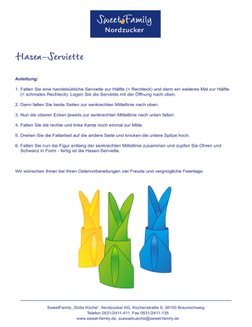 Hasen-Serviette Anleitung: 1. Falten Sie eine handelsübliche Serviette zur Hälfte (= Rechteck) und dann ein weiteres Mal zur Hälfte (= schmales Rechteck). Legen Sie die Serviette mit der Öffnung nach oben. 2. Dann falten Sie beide Seiten zur senkrechten Mittellinie nach oben. 3. Nun die oberen Ecken jeweils zur senkrechten Mittellinie nach unten falten. 4. Falten Sie die rechte und linke Kante noch einmal zur Mitte. 5. Drehen Sie die Faltarbeit auf die andere Seite und knicken die untere Spitze hoch. 6. Falten Sie nun die Figur entlang der senkrechten Mittellinie zusammen und zupfen Sie Ohren und Schwanz in Form - fertig ist die Hasen-Serviette. Wir wünschen Ihnen bei Ihren Ostervorbereitungen viel Freude und vergnügliche Feiertage. SweetFamily „Süße Küche“, Nordzucker AG, Küchenstraße 9, 38100 Braunschweig Telefon 0531/2411-411, Fax 0531/2411-135 www.sweet-family.de, [email protected] 1 2 3 4 5 6